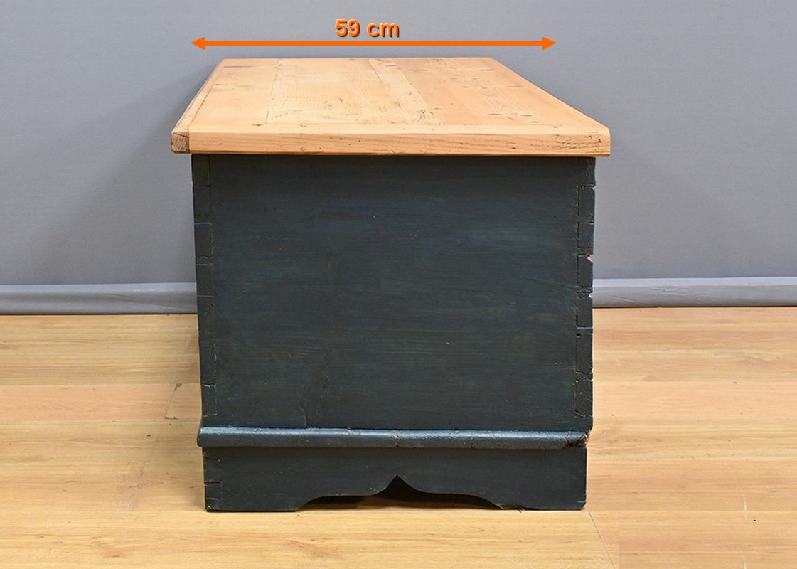 Ce coffre en pin, d’origine des pays de l’Est et datant de la fin du XIXe siècle, est une pièce unique qui combine charme rustique et fonctionnalité.
