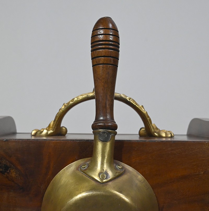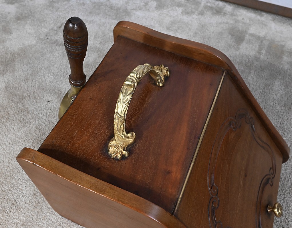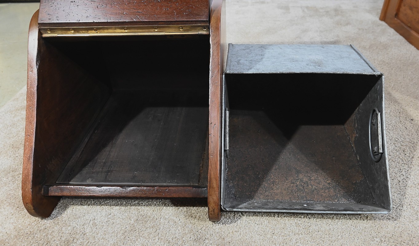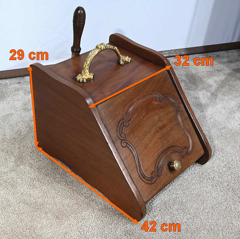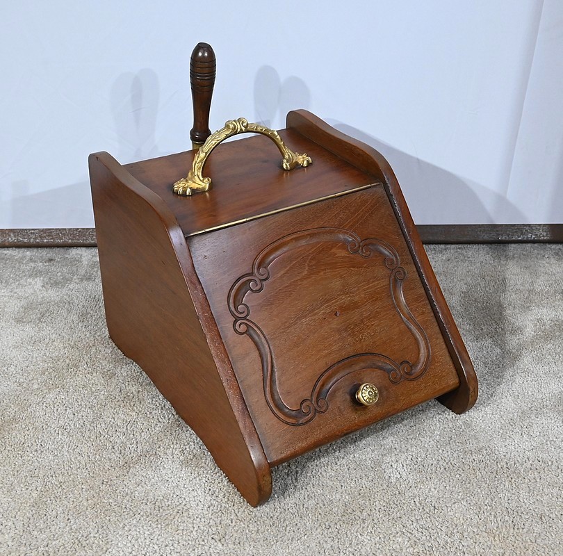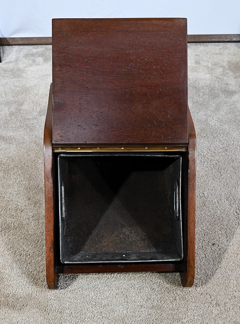 Belle réserve à charbon en acajou massif formée d’une porte en pente en façade. Celle-ci est sculptée de gorges et de volutes en mouvement. Elle s’ouvre grâce à un bouton ciselé en bronze et se relève sur des charnières en laiton. A l’intérieur, nous observons un bac en zinc équipé de poignées permettant son retrait.