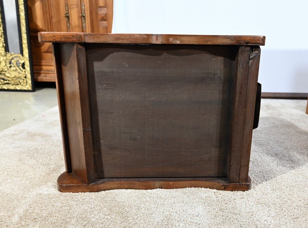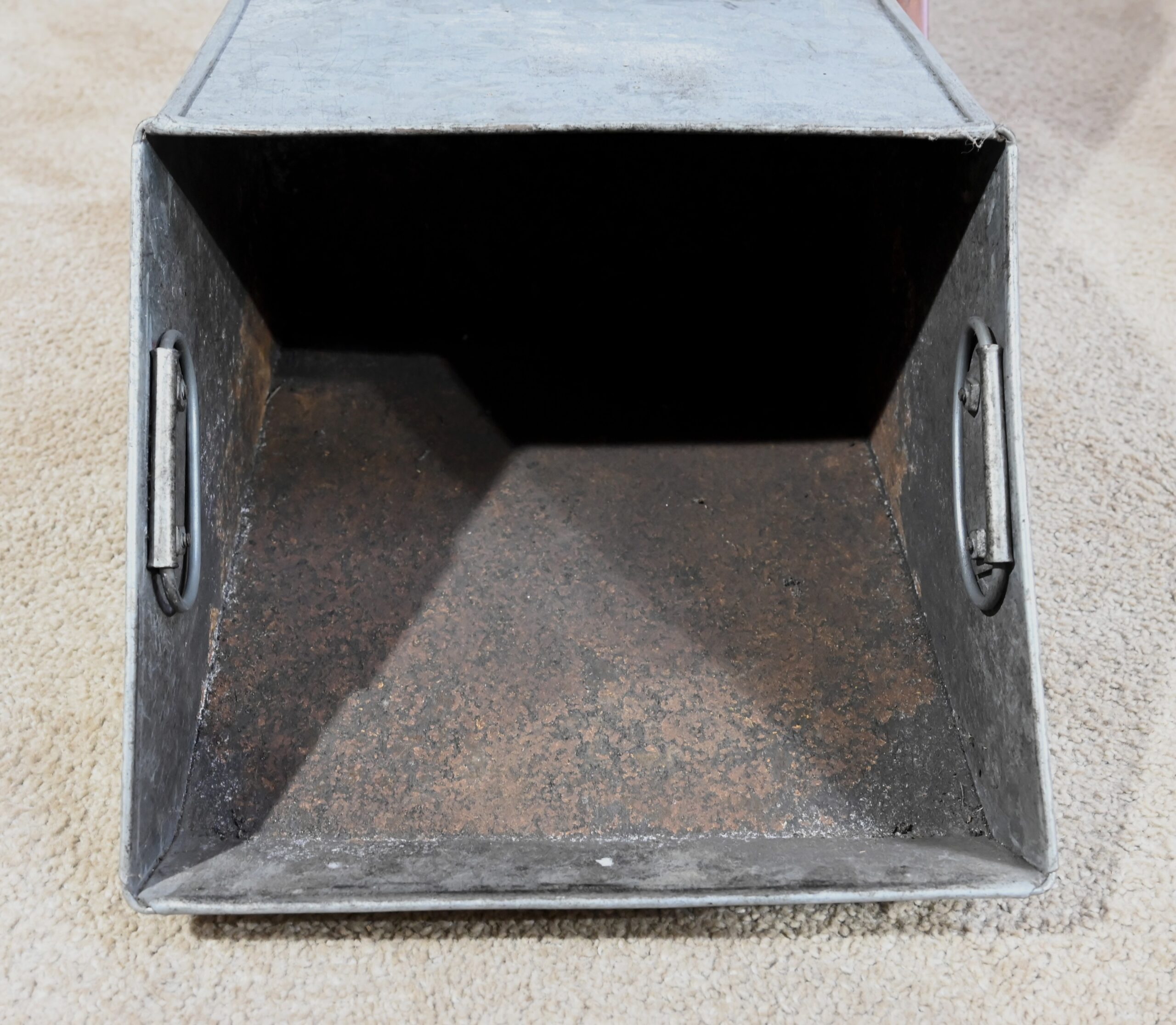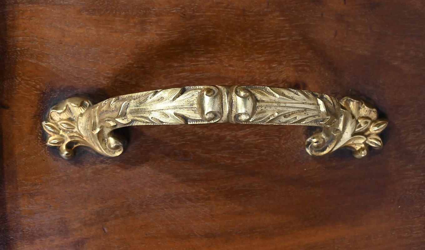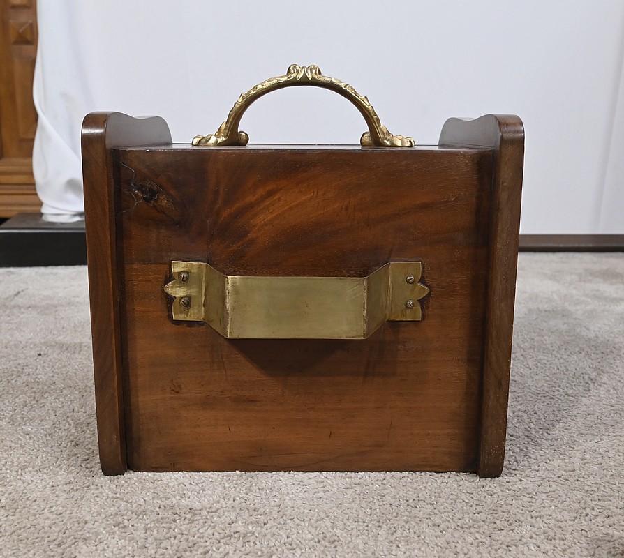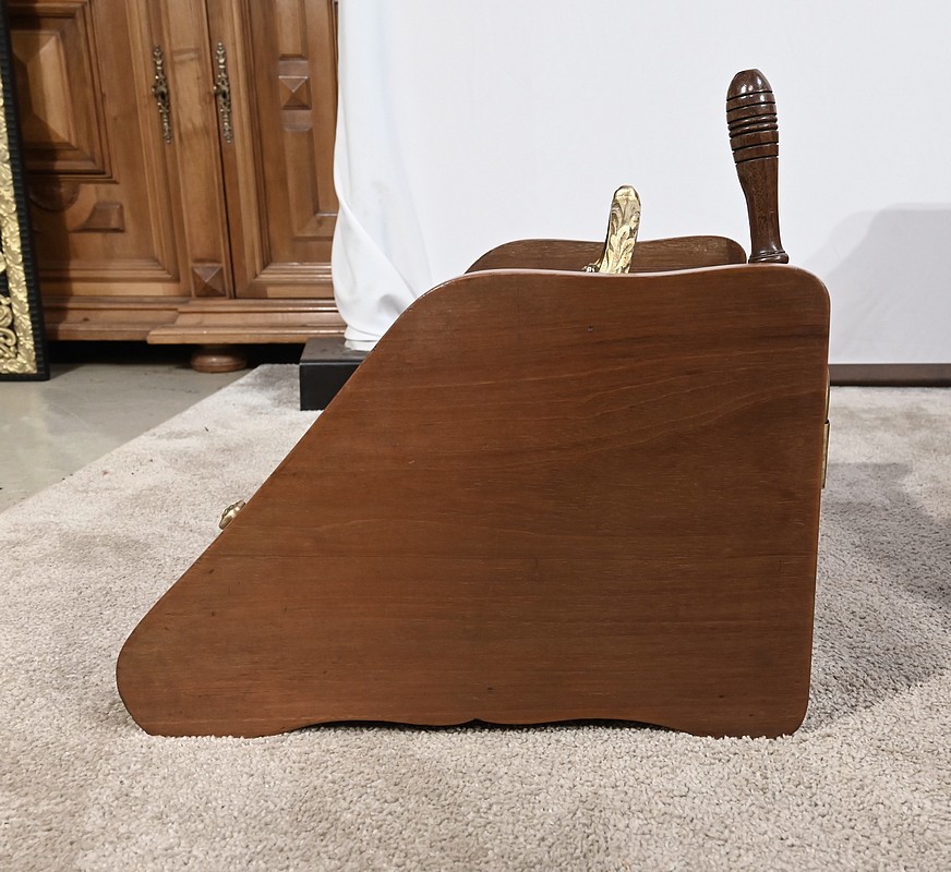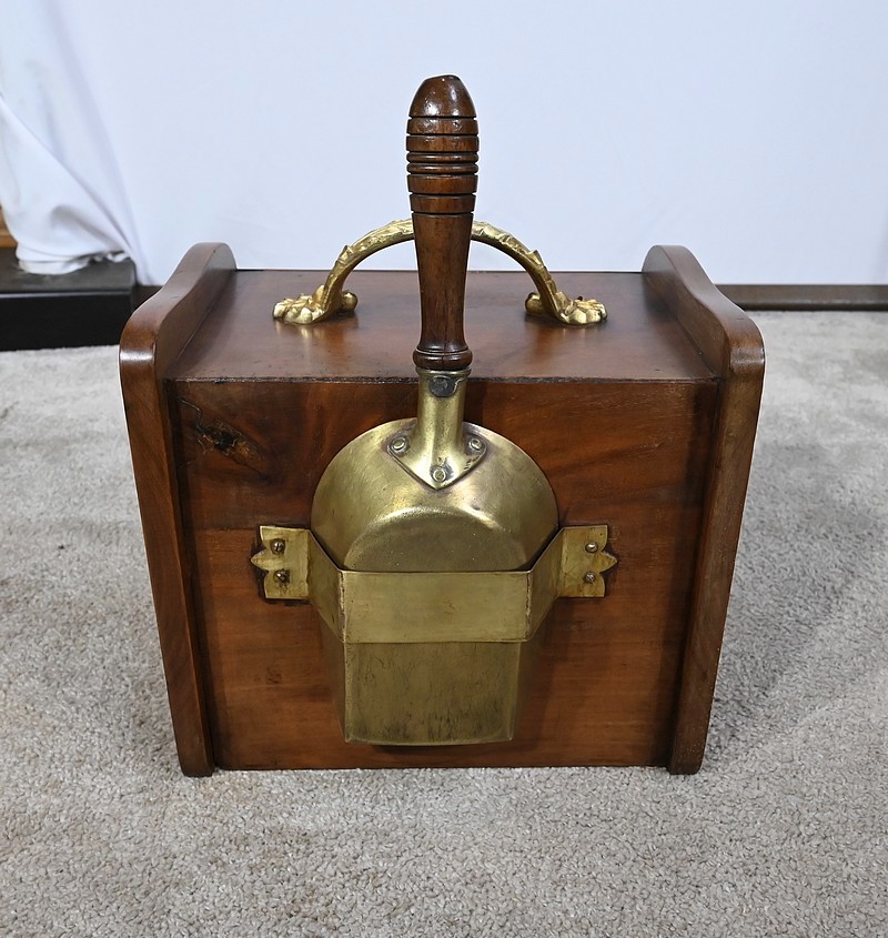 Belle réserve à charbon en acajou massif formée d’une porte en pente en façade. Celle-ci est sculptée de gorges et de volutes en mouvement. Elle s’ouvre grâce à un bouton ciselé en bronze et se relève sur des charnières en laiton. A l’intérieur, nous observons un bac en zinc équipé de poignées permettant son retrait.
