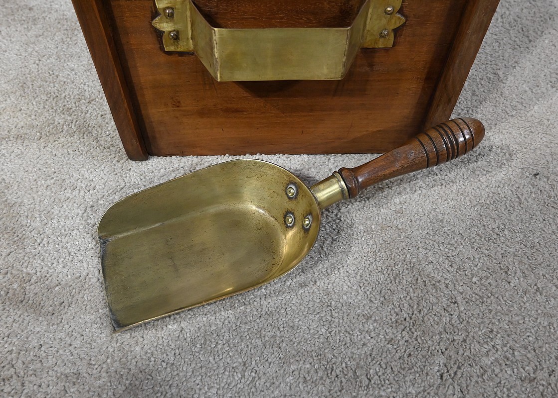 Cette charbonnière est dotée d’une magnifique poignée de transport en bronze ciselé. A l’arrière, une grande pelle en laiton avec manche en bois, se loge dans une large bretelle en métal.