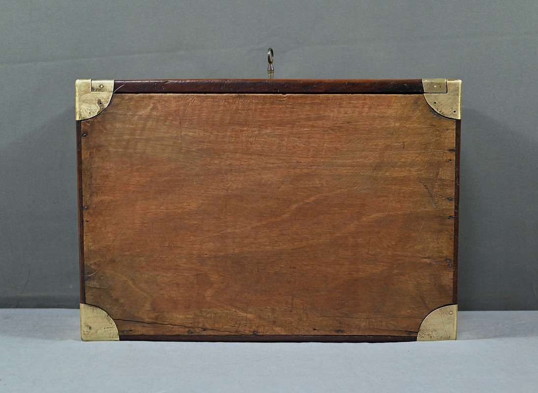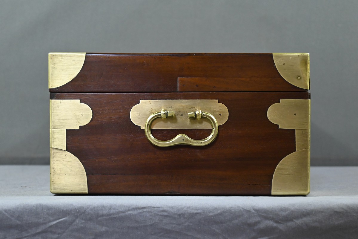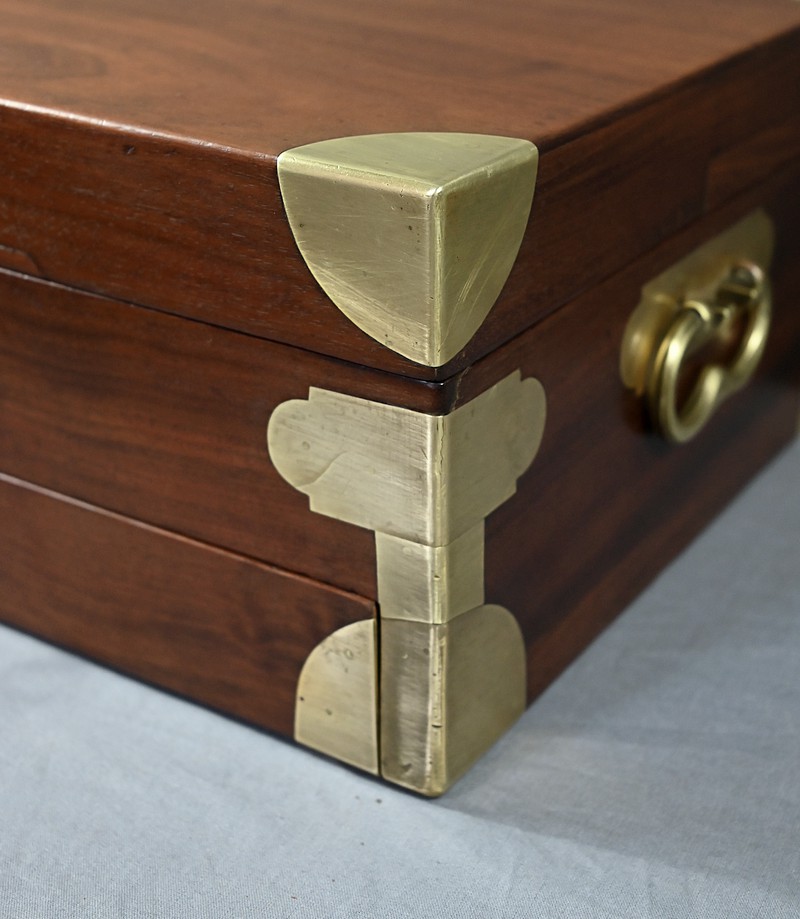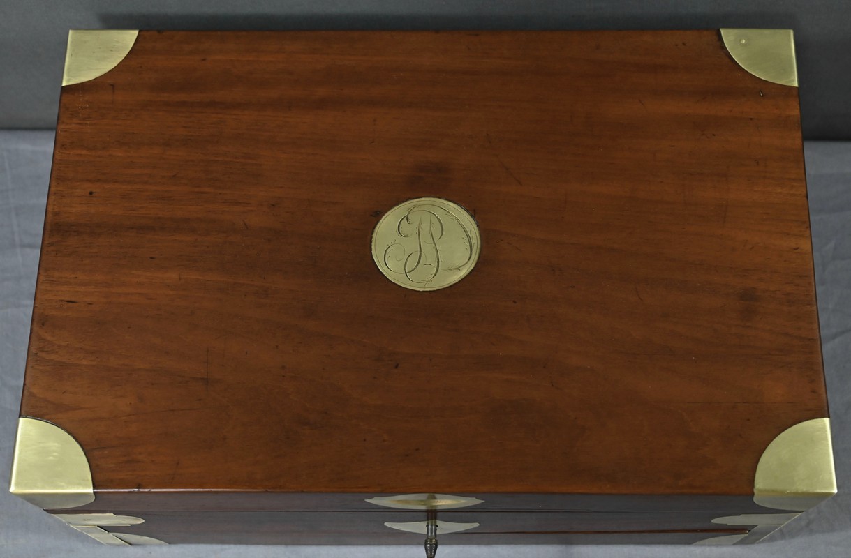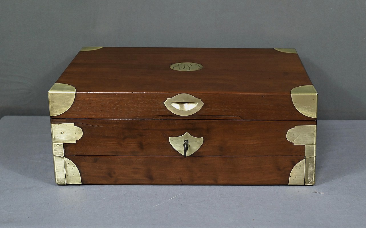Ce coffret de voyage réalisé en acajou date de la fin du XIXe siècle. Les écoinçons et les renforts en laiton, finement ciselés, protègent les angles tout en apportant une élégance qui contraste avec la richesse du bois. Le couvercle porte une plaque ronde en laiton gravée d’un monogramme finement exécuté, témoin d’une appartenance personnelle.