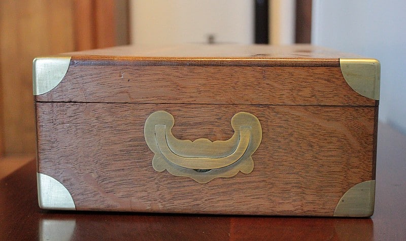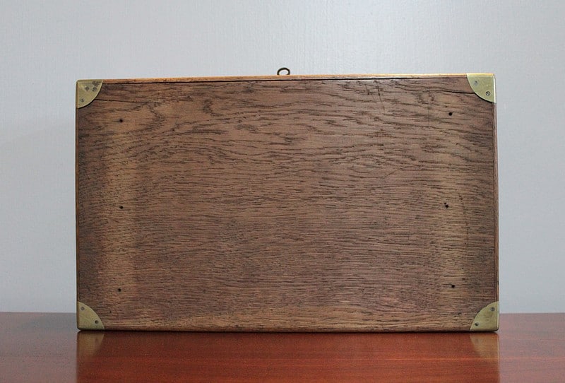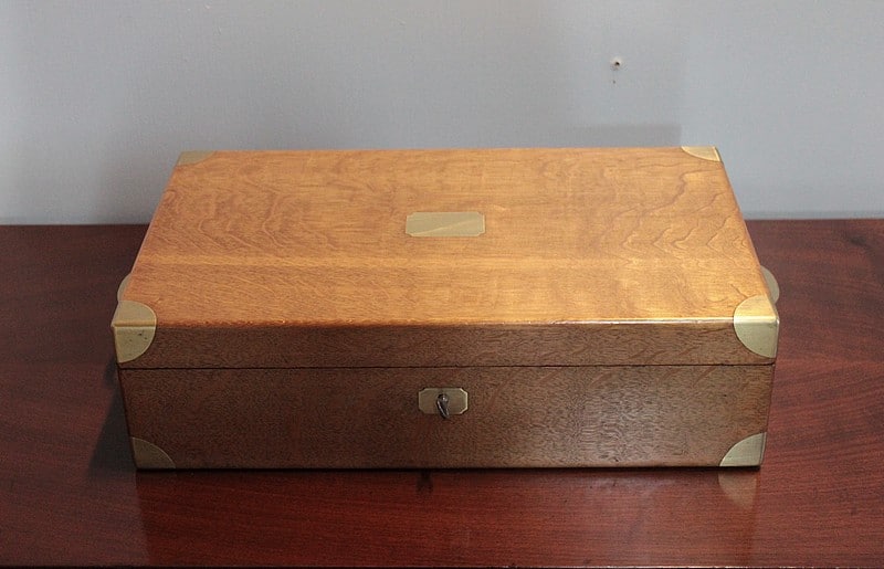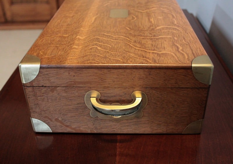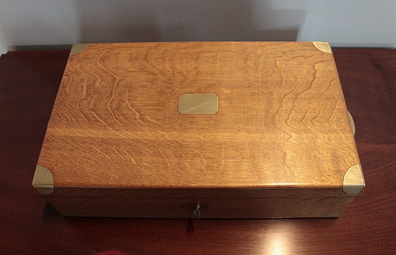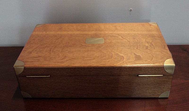 Coffret en chêne clair avec angles et poignées latérales incrustées en laiton.