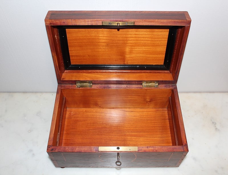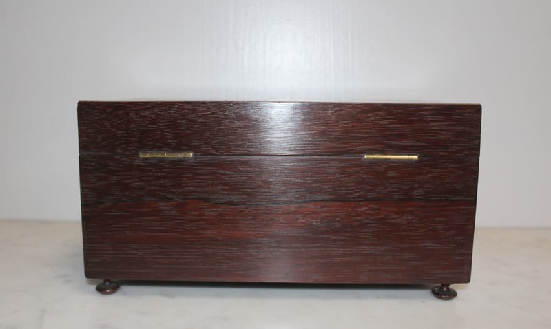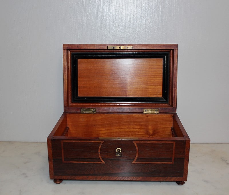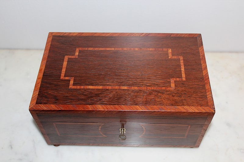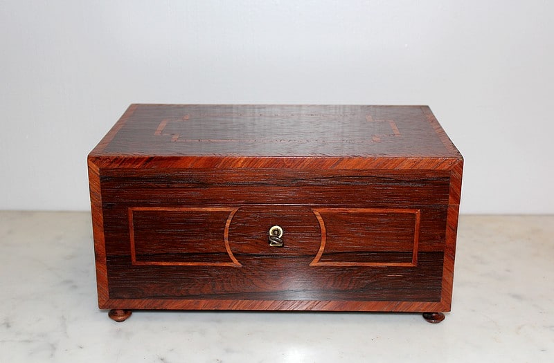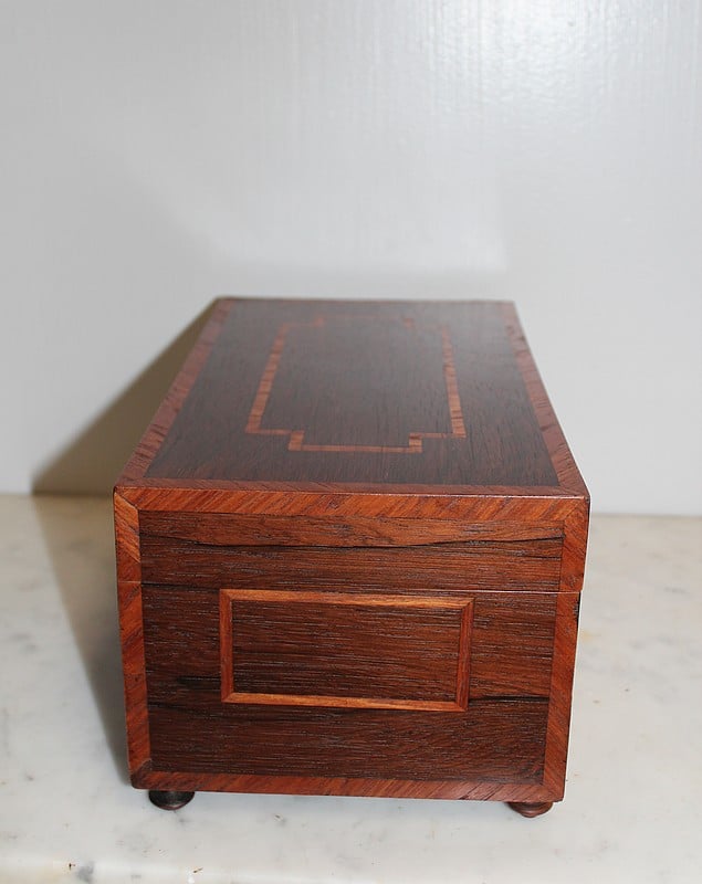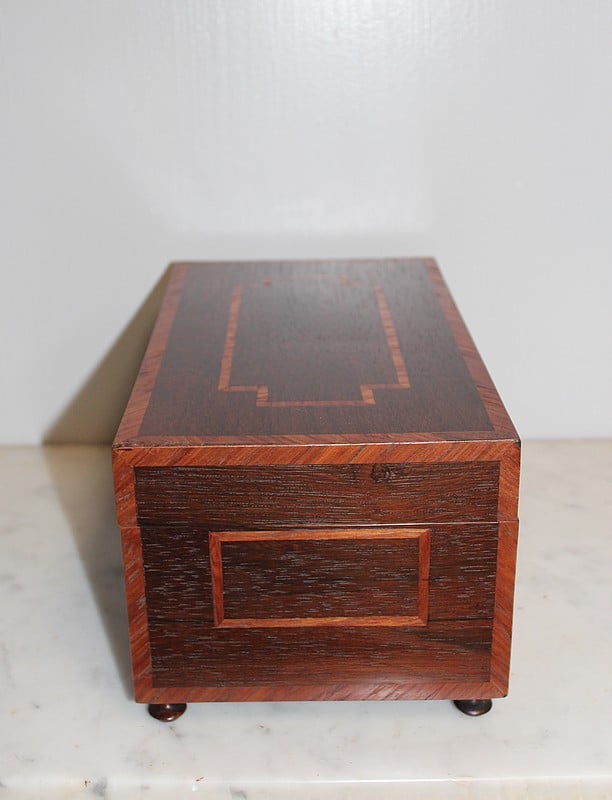 Coffret sur pieds en palissandre décoré d’une frise de bois de rose, fermant à clé.