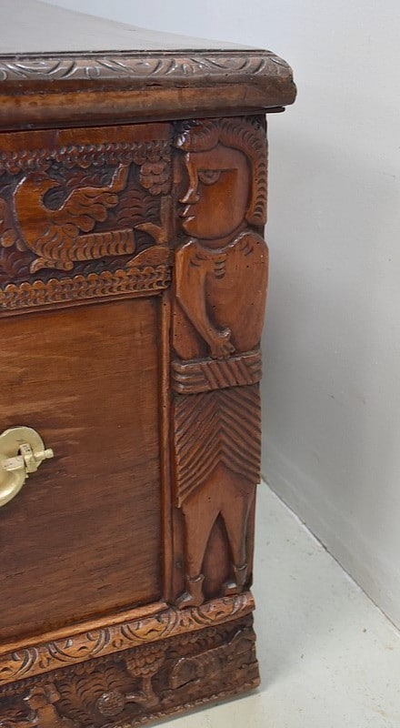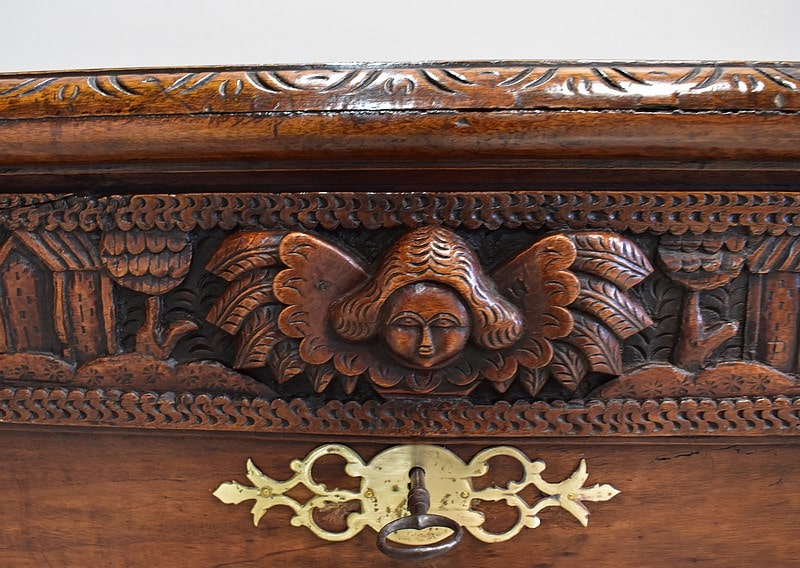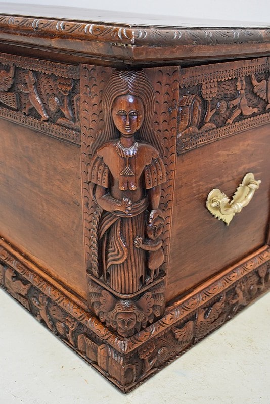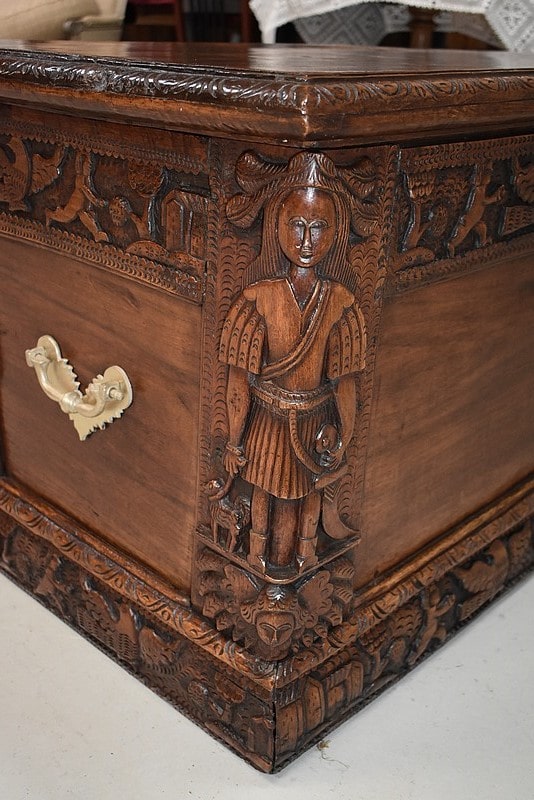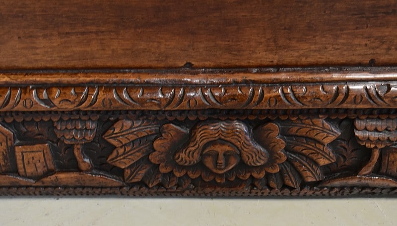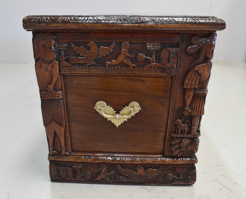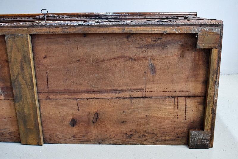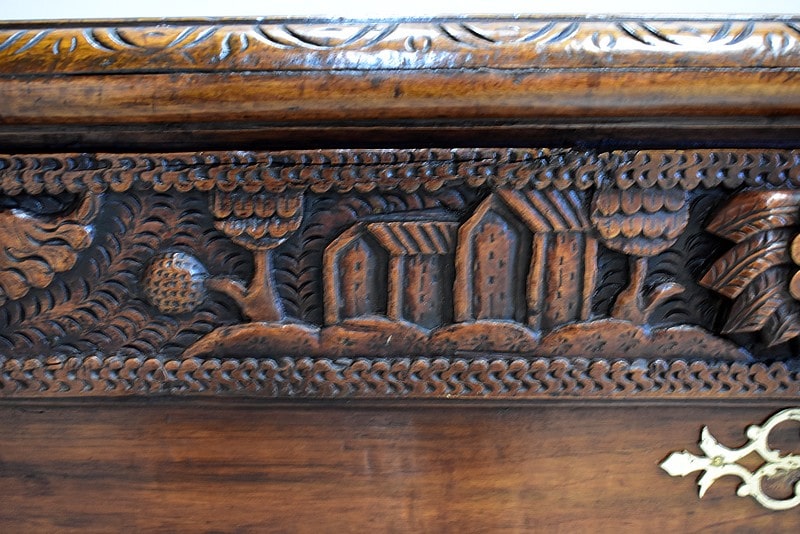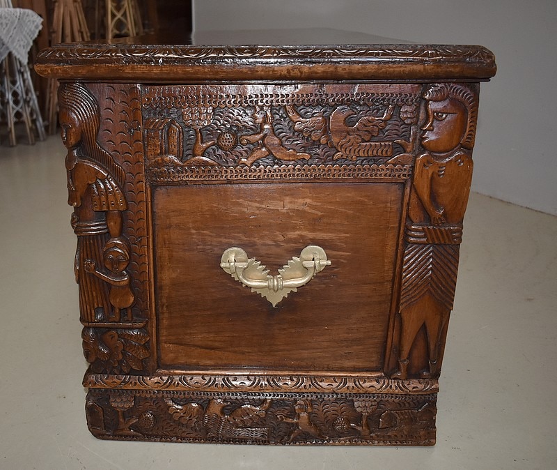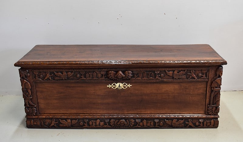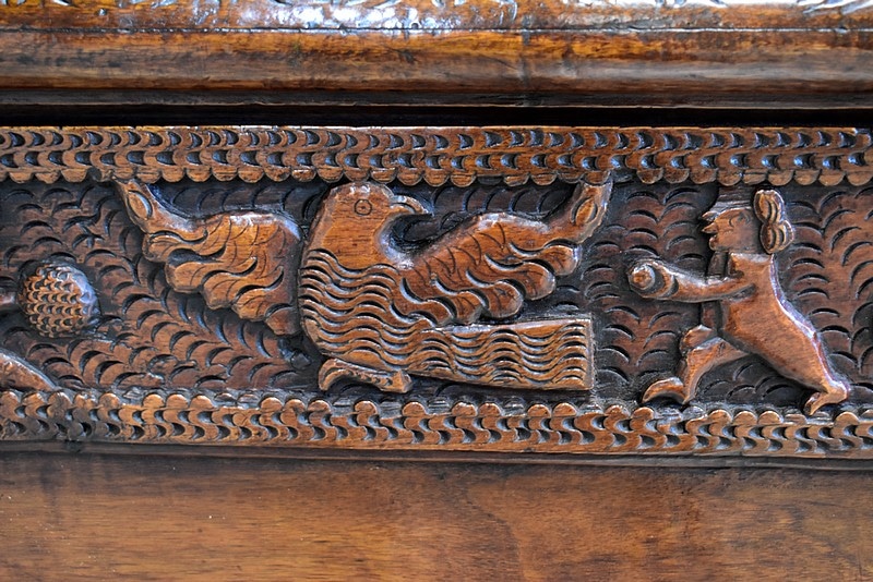 Les parties haute et basse du coffre sont sculptées d’une frise mettant en scène des aigles, des enfants, des maisons et des arbres, comme une allégorie à la vie.