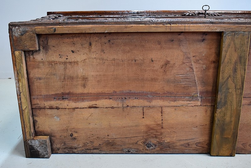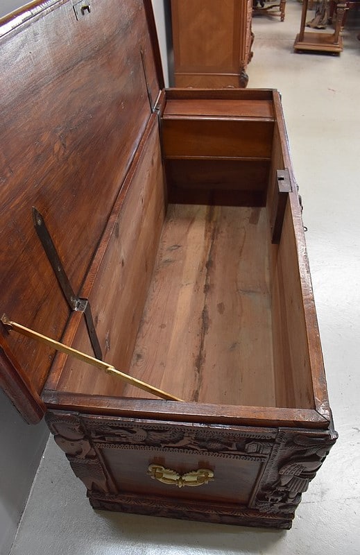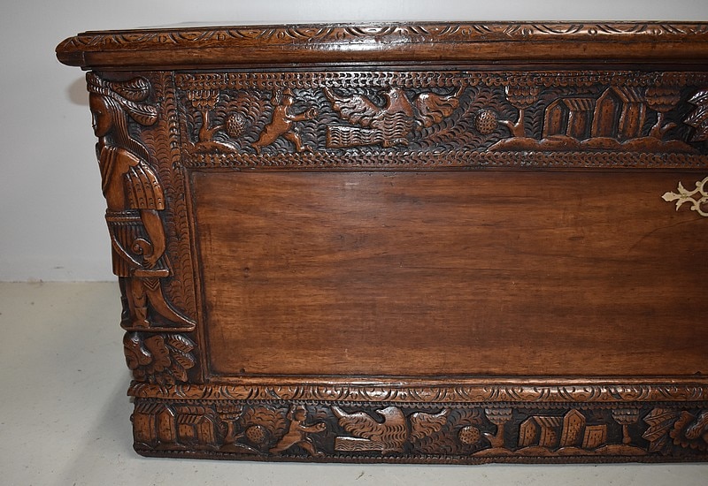 Grand coffre en noyer massif – dessus, façade et côtés – orné de nombreuses sculptures symboliques. Les quatre angles sont ornés de personnages représentant les continents de l’Asie et de l’Afrique , egyptiens, nippon et africain . Le dessus est entouré d’une moulure sculptée.