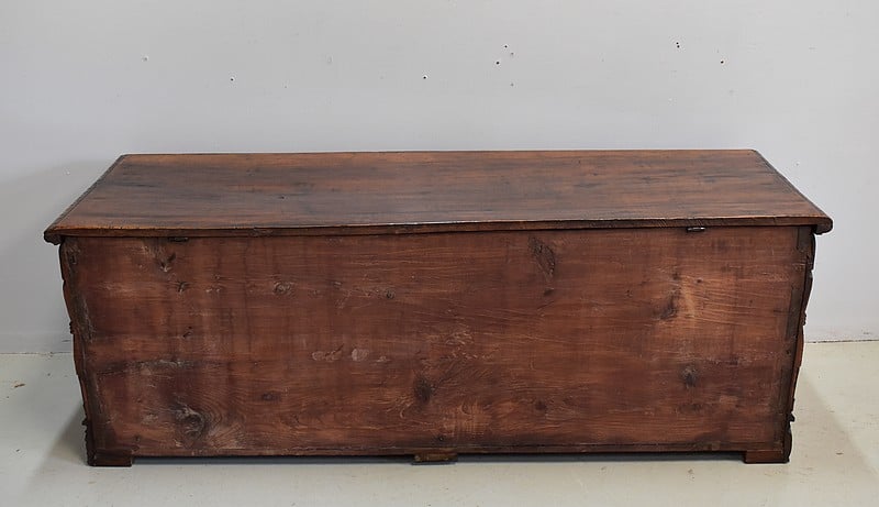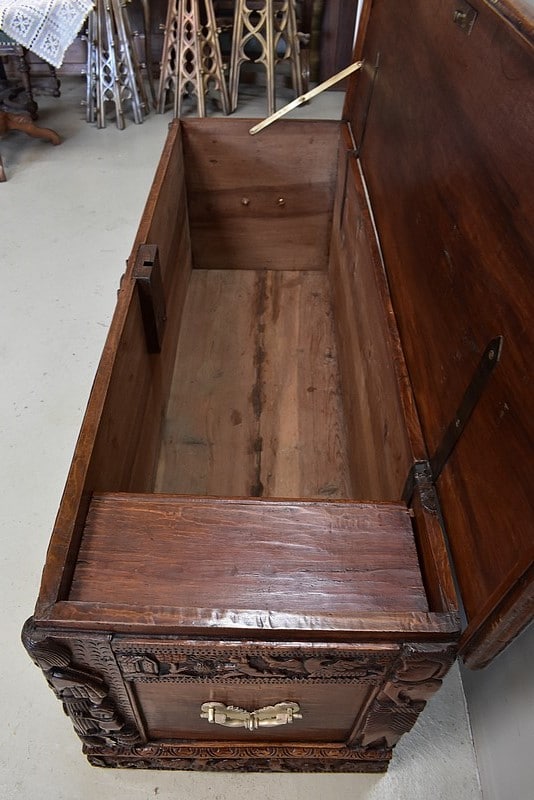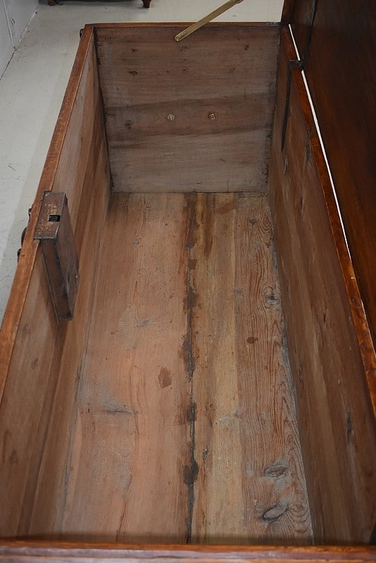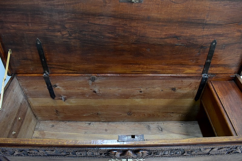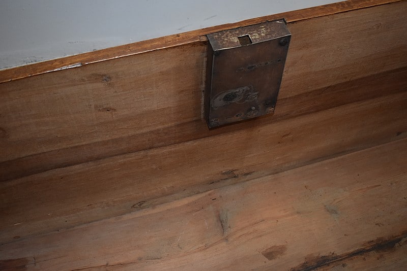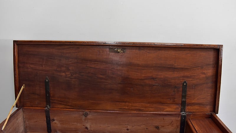 Le dessus se relève découvrant un coffret à l’intérieur. Il est maintenu ouvert grâce à un compas (rajouté). Il ferme à clé.