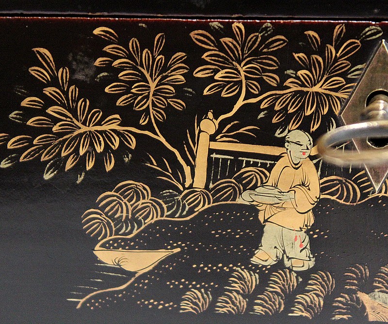 Il ouvre au-dessus par un Couvercle aux Reliefs Galbés, avec angles à Ressauts taillés en Demi-Rond. Ces coins s’embellissent de fins Décors Polychromes Orientaux, représentant des Fleurs et des Scènettes de la vie Japonaise. En son centre, l’Ouvrant s’agrémente d’un dessin représentant certainement une Ville, partiellement effacé avec le temps.