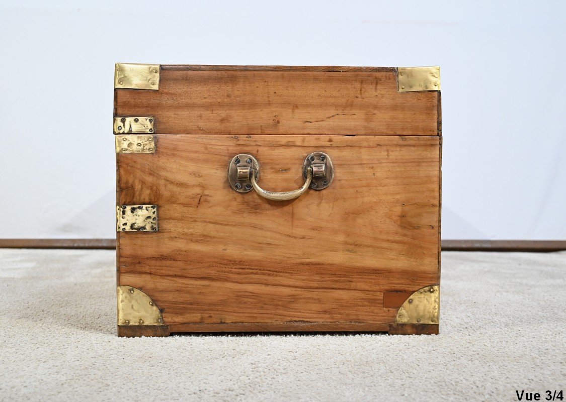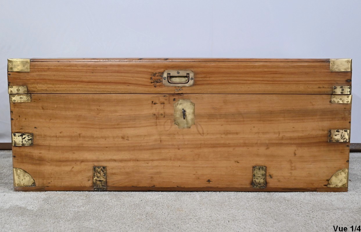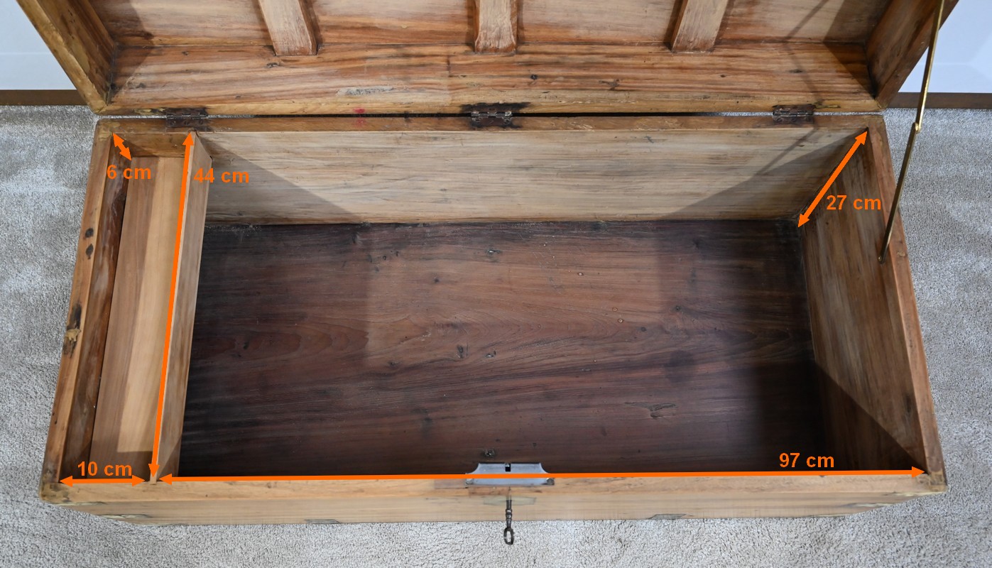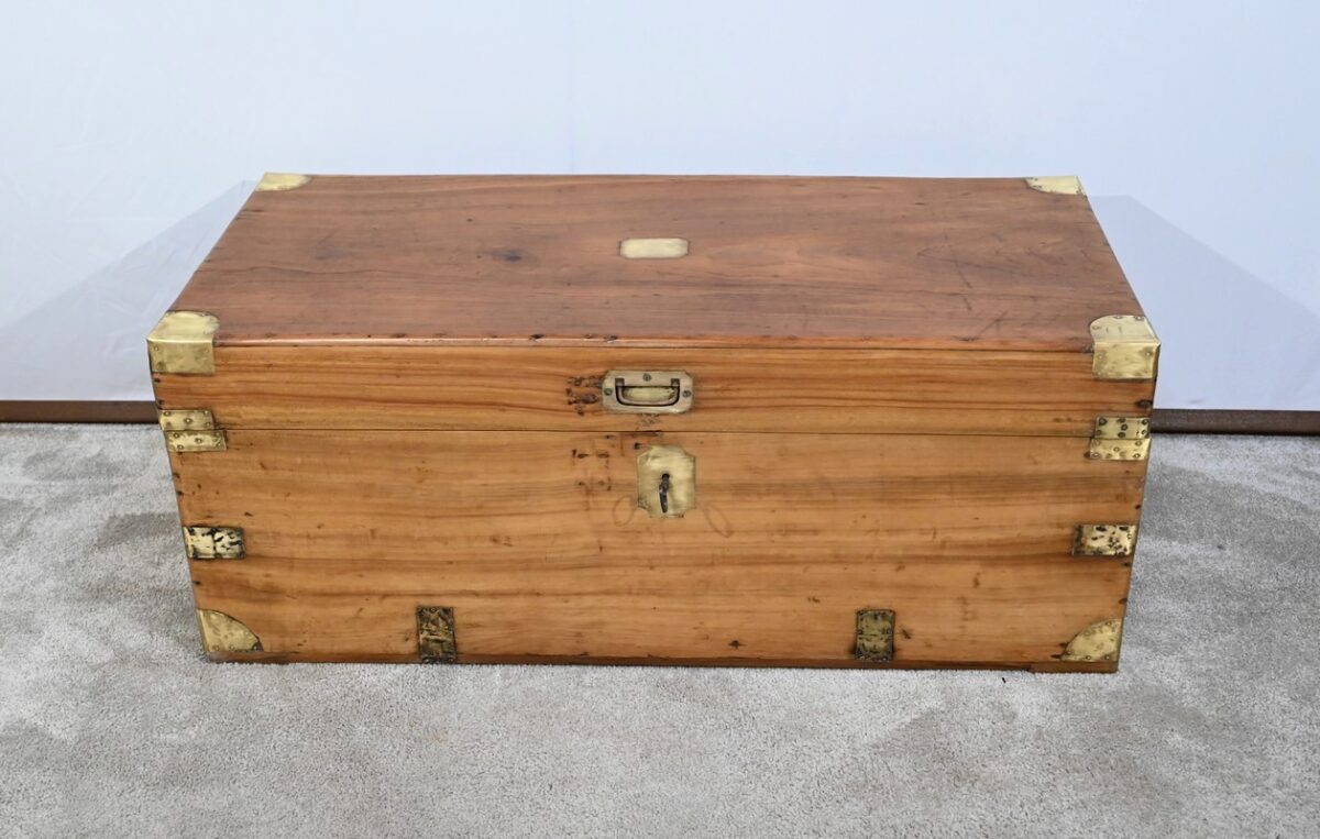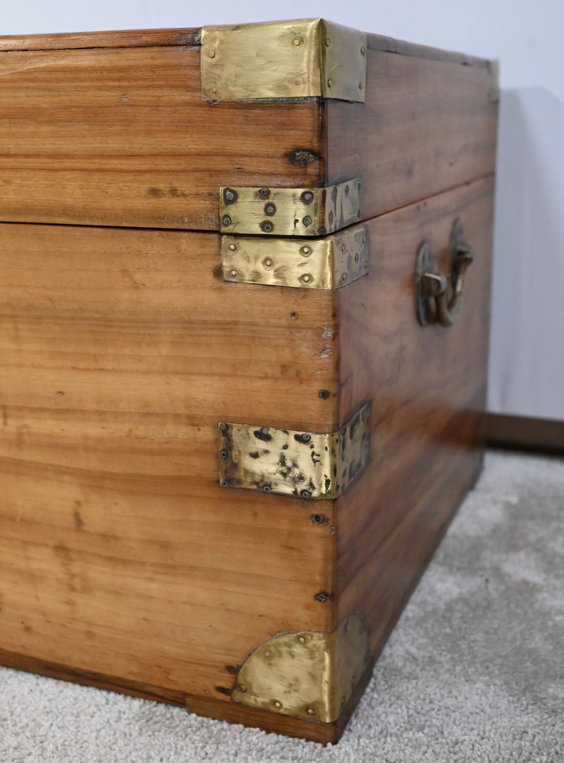 La façade, les côtés et l’arrière comprennent chacun une seule planche et sont également renforcés de lanières de différentes tailles et d’angles en demi-rond en laiton.