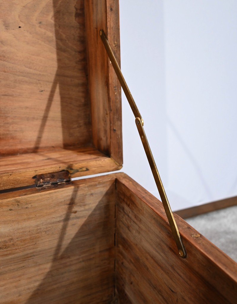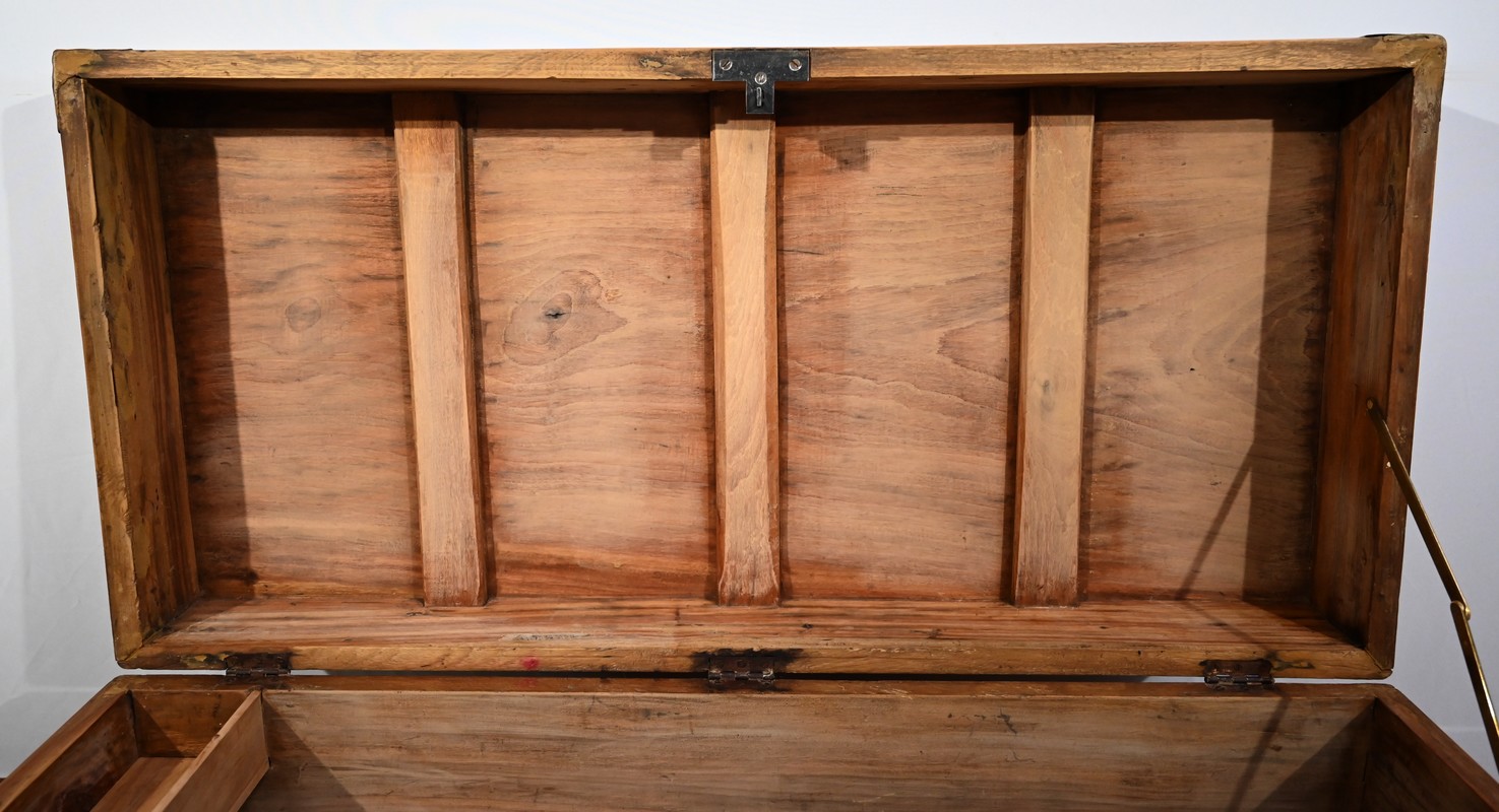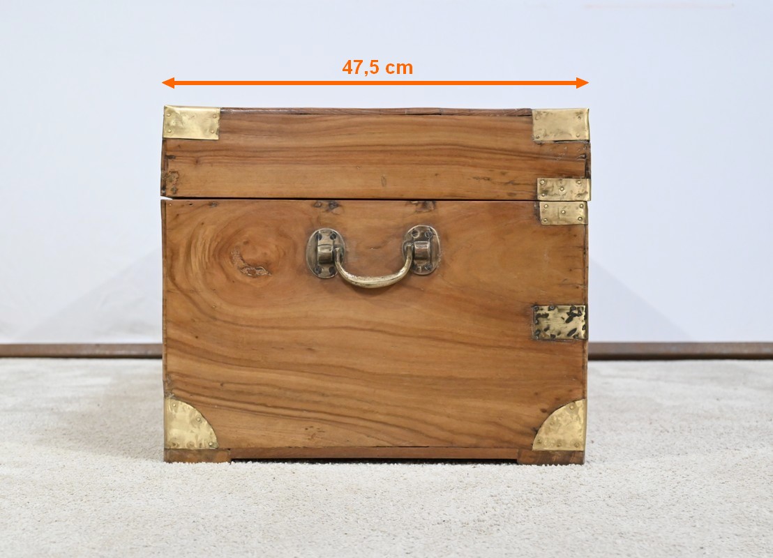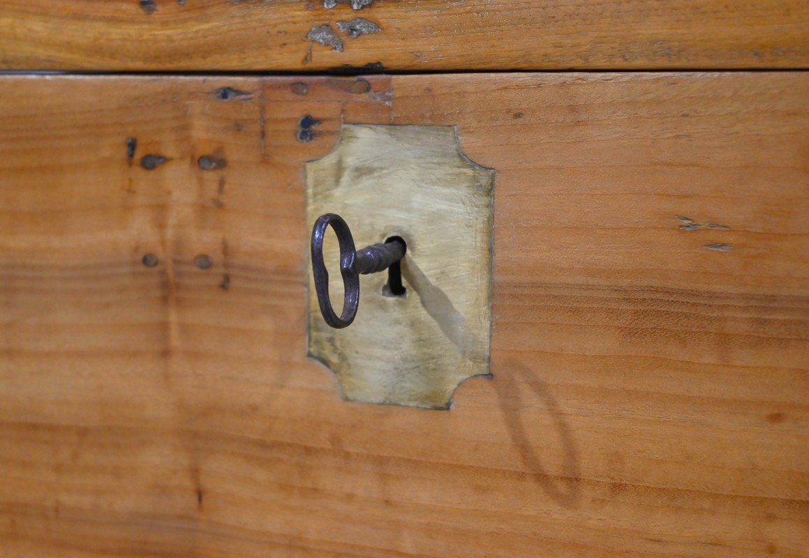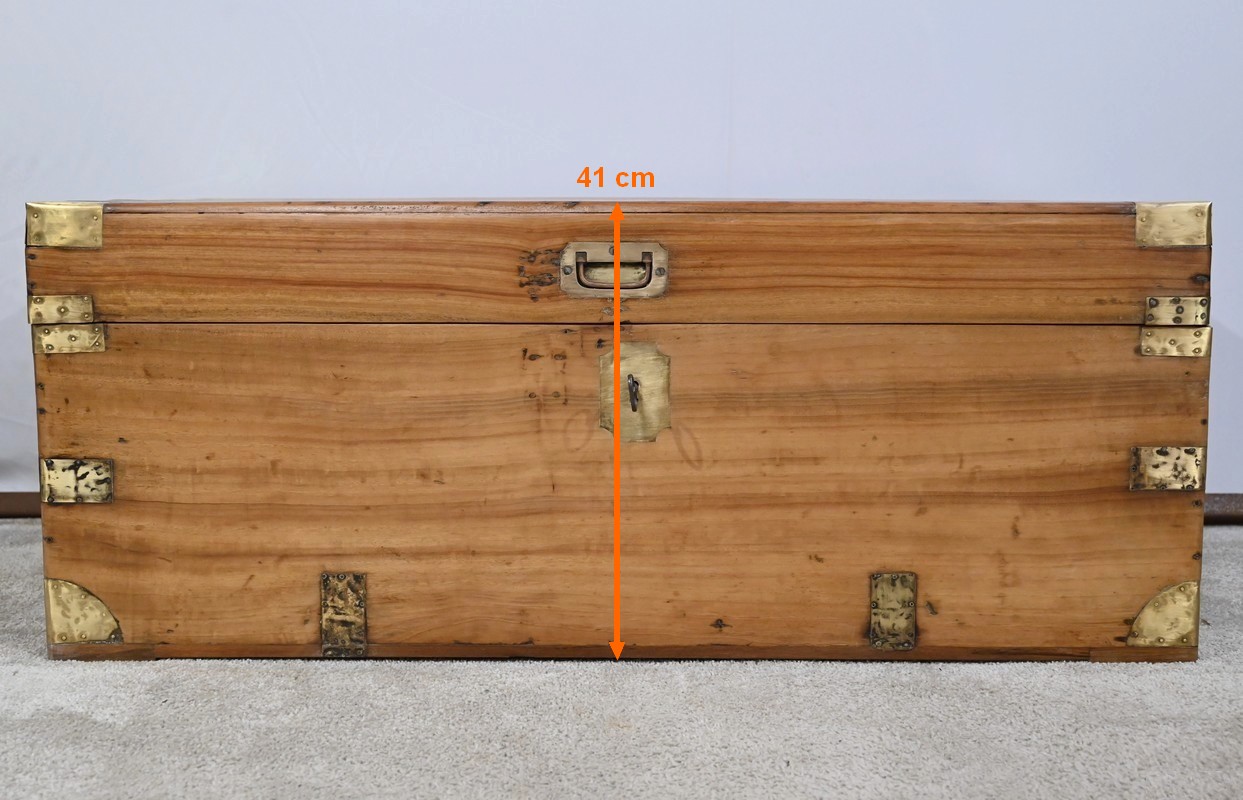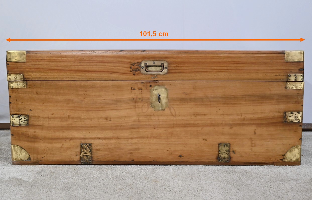 La façade, les côtés et l’arrière comprennent chacun une seule planche et sont également renforcés de lanières de différentes tailles et d’angles en demi-rond en laiton.