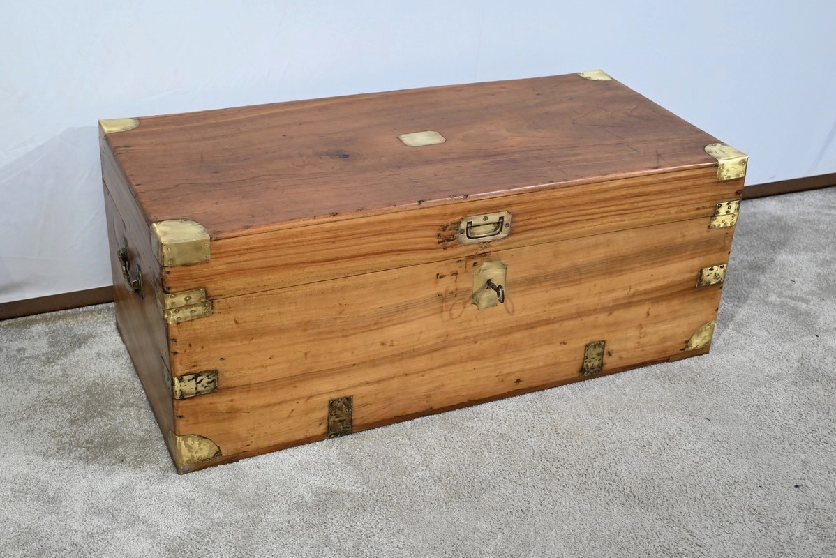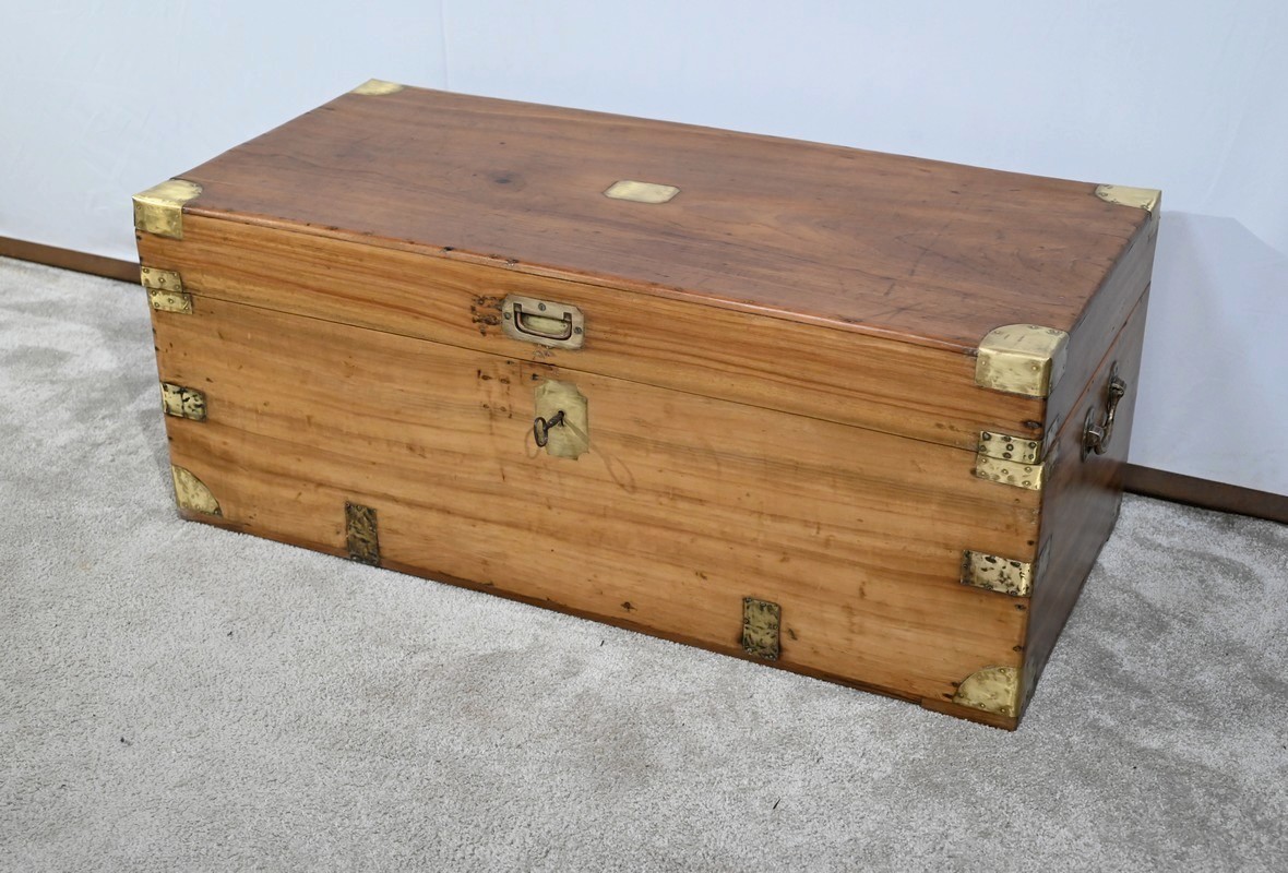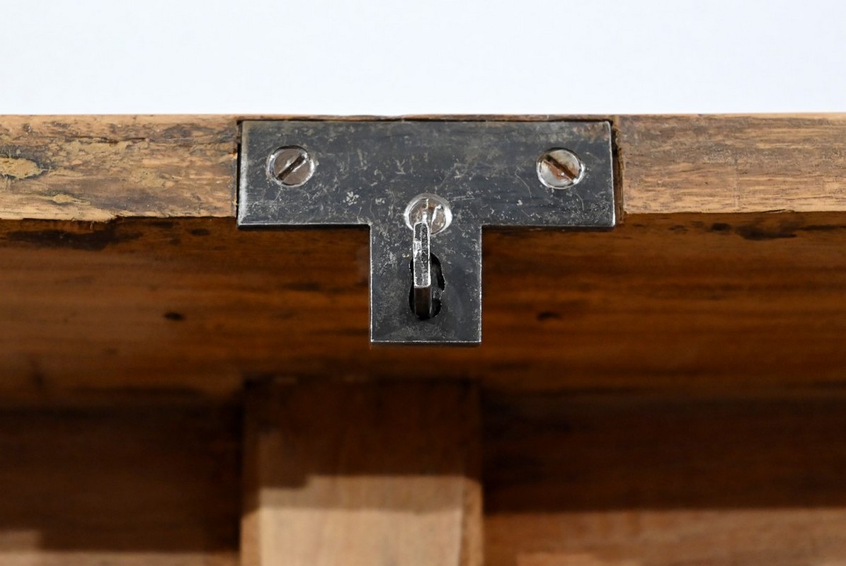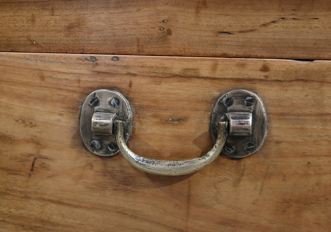 Ce coffre dispose d’une poignée bateau en laiton ainsi qu’une serrure d’origine fonctionnelle à quart de tour avec clé et entrée encastrée.