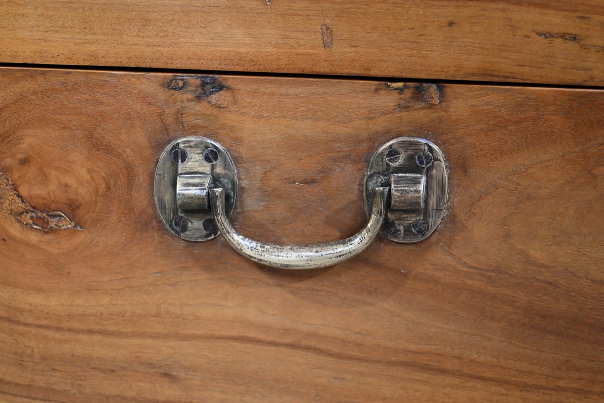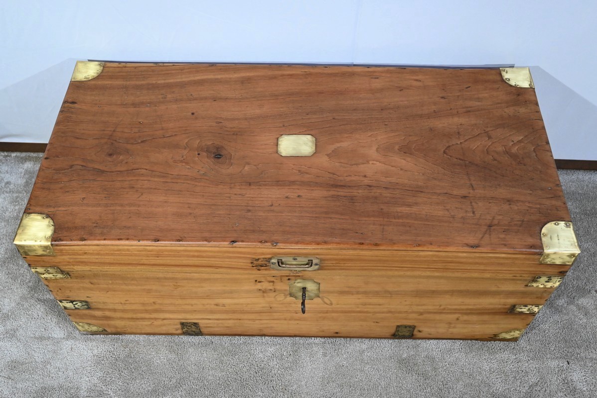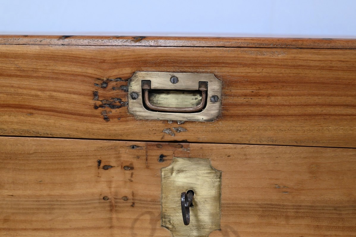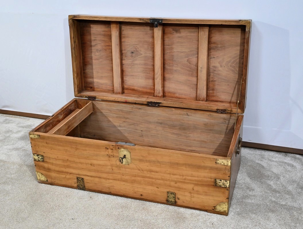 Ce coffre dispose d’une poignée bateau en laiton ainsi qu’une serrure d’origine fonctionnelle à quart de tour avec clé et entrée encastrée.