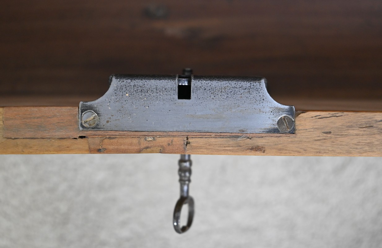 À l’intérieur, un compas laiton dit à genou permet le maintien du couvercle.