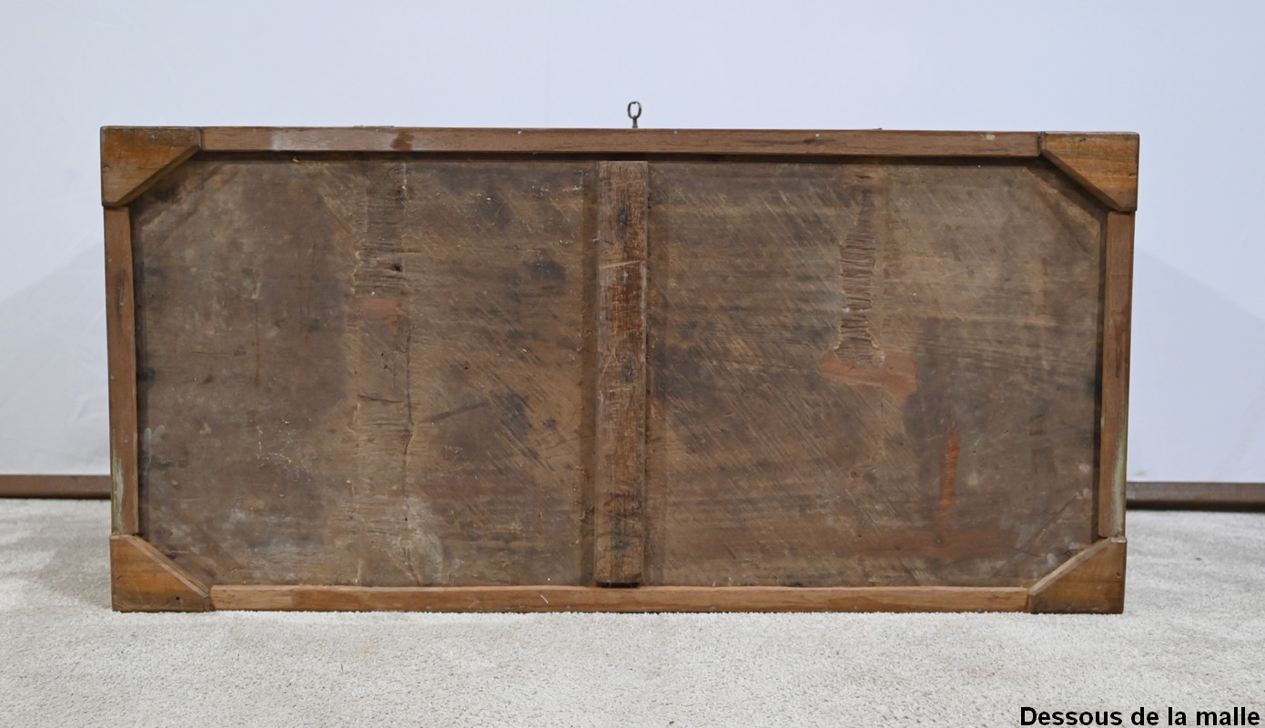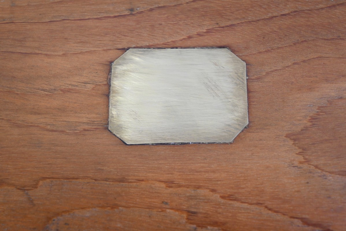 Le dessus de cette malle, composé d’une seule planche, est décoré d’une plaque en laiton, de lanières et de renforts en forme d’écoinçon sur chacun de ses angles.
