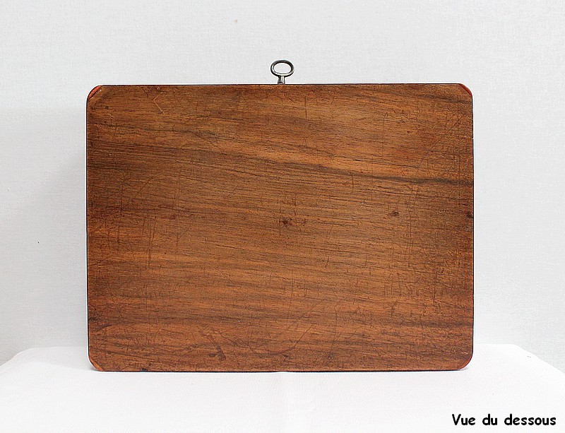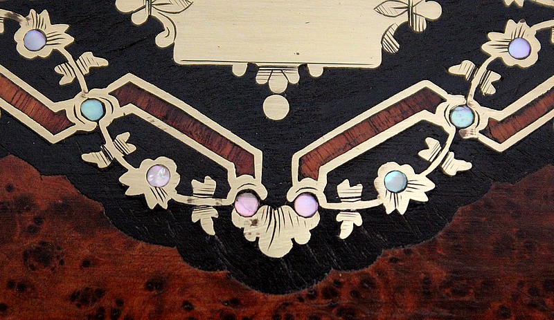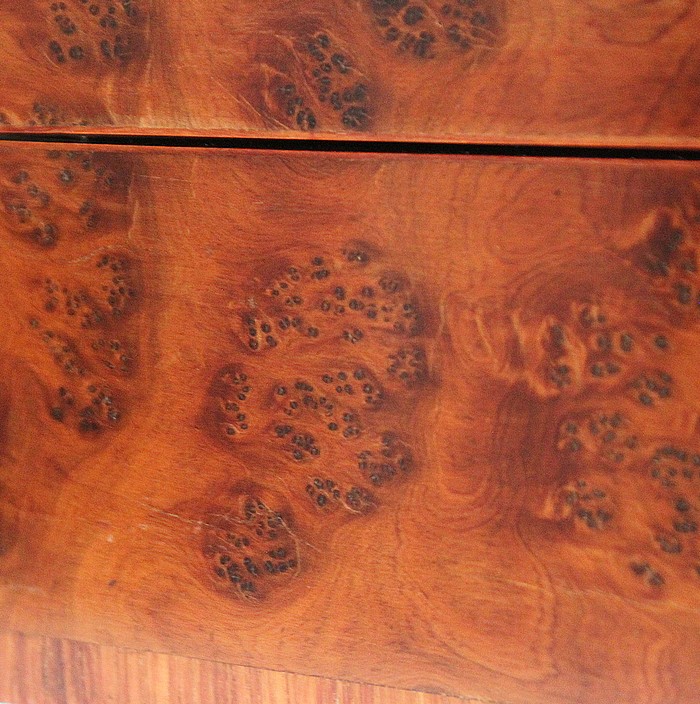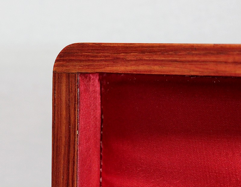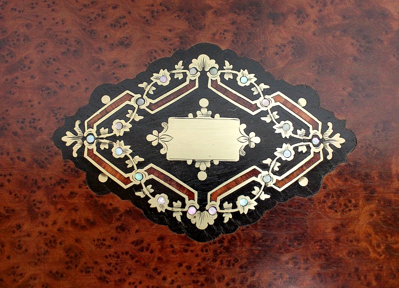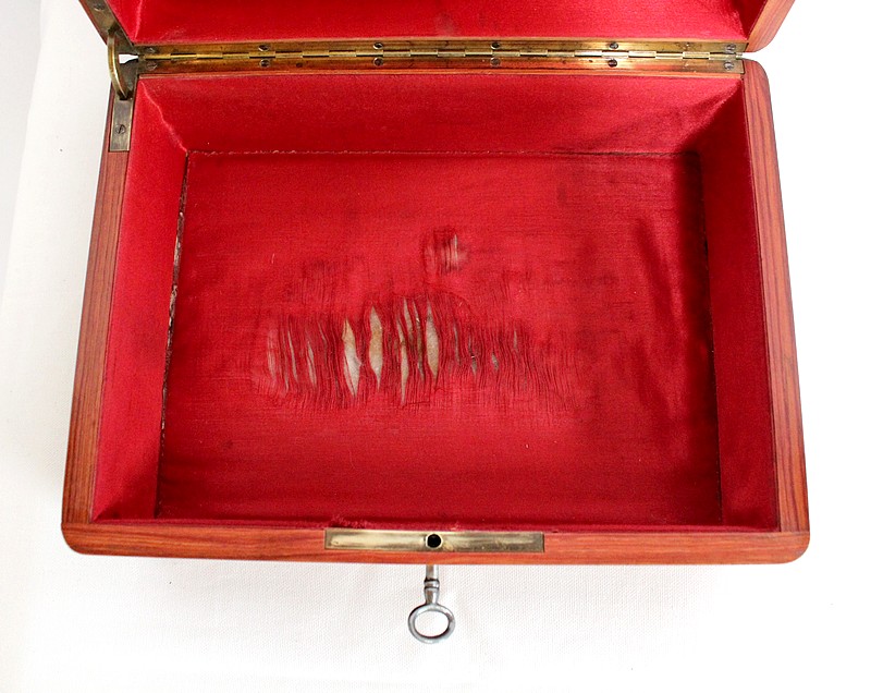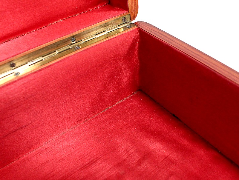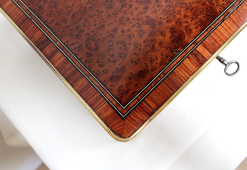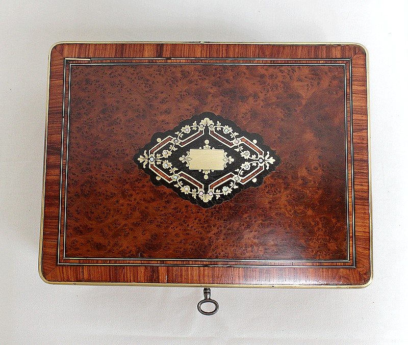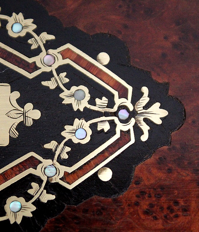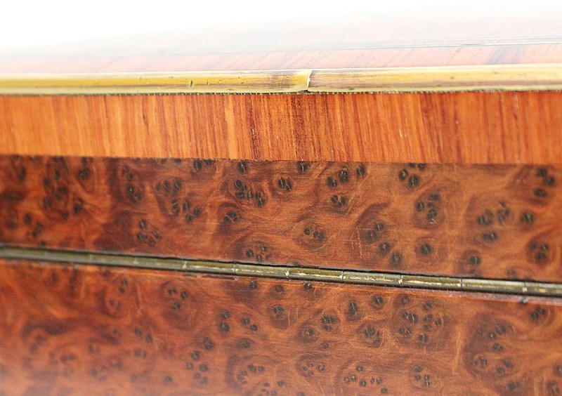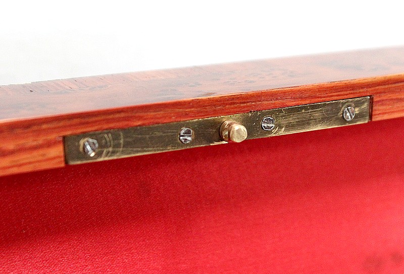 Ce coffret ouvre sur le Dessus par un couvercle bordé d’un Épais Filet de Laiton. Celui-ci entoure une Frise de Bois de Rose, juxtaposée elle aussi de deux autres Filets de Laiton. En son centre, l’Ouvrant est agrémenté d’un Losange en Ébène, lui-même incrusté de Motifs très Raffinés, présentant les mêmes essences décrites plus haut. Ce dernier décor est serti de discrets Cristaux de Nacre.