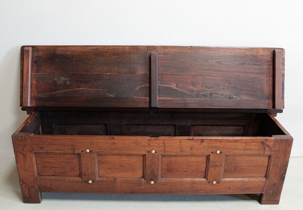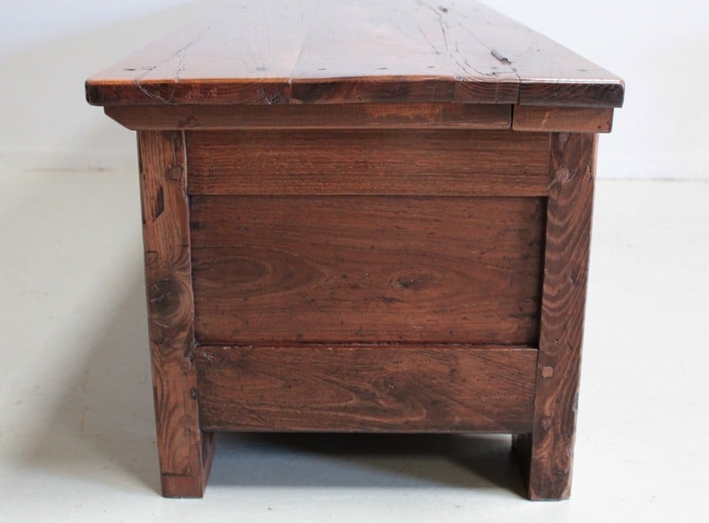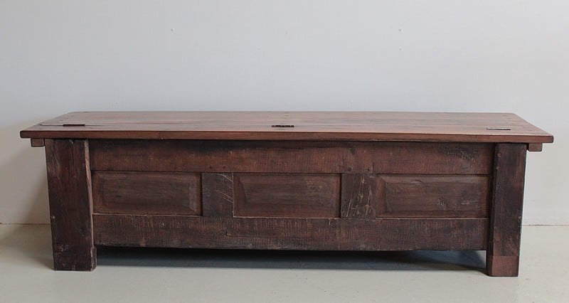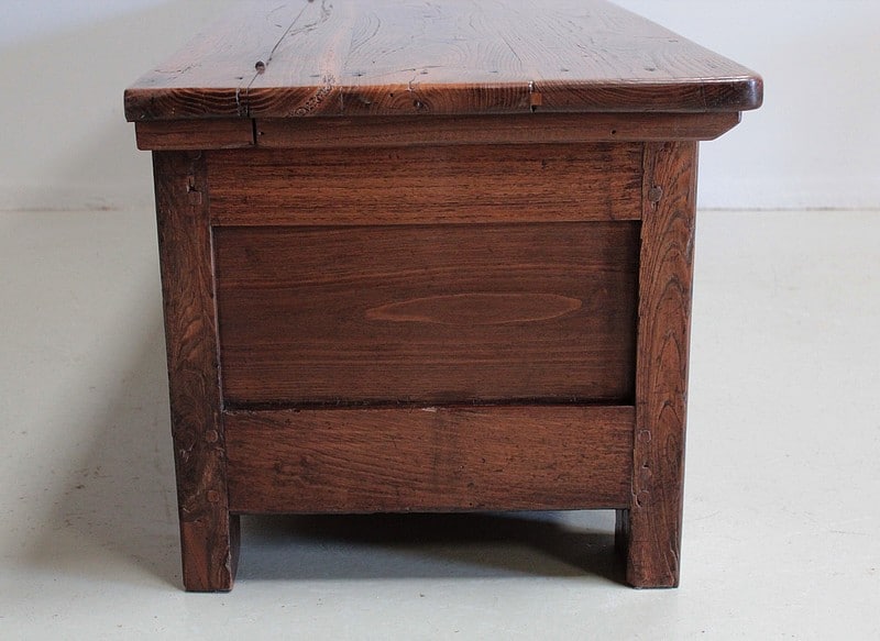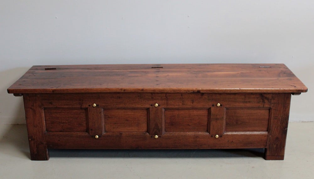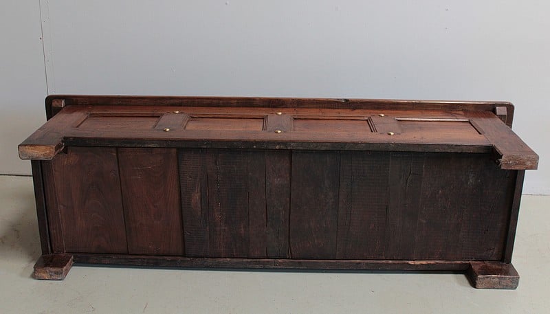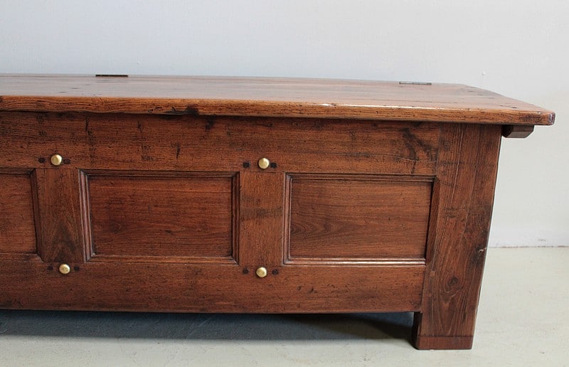 Longue maie en châtaignier, façade à 4 panneaux ornée de gros clous en cuivre.