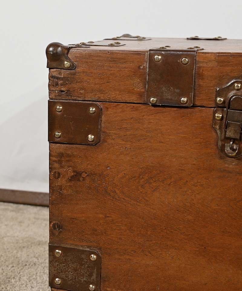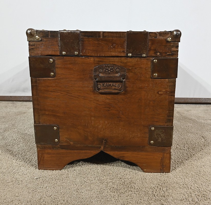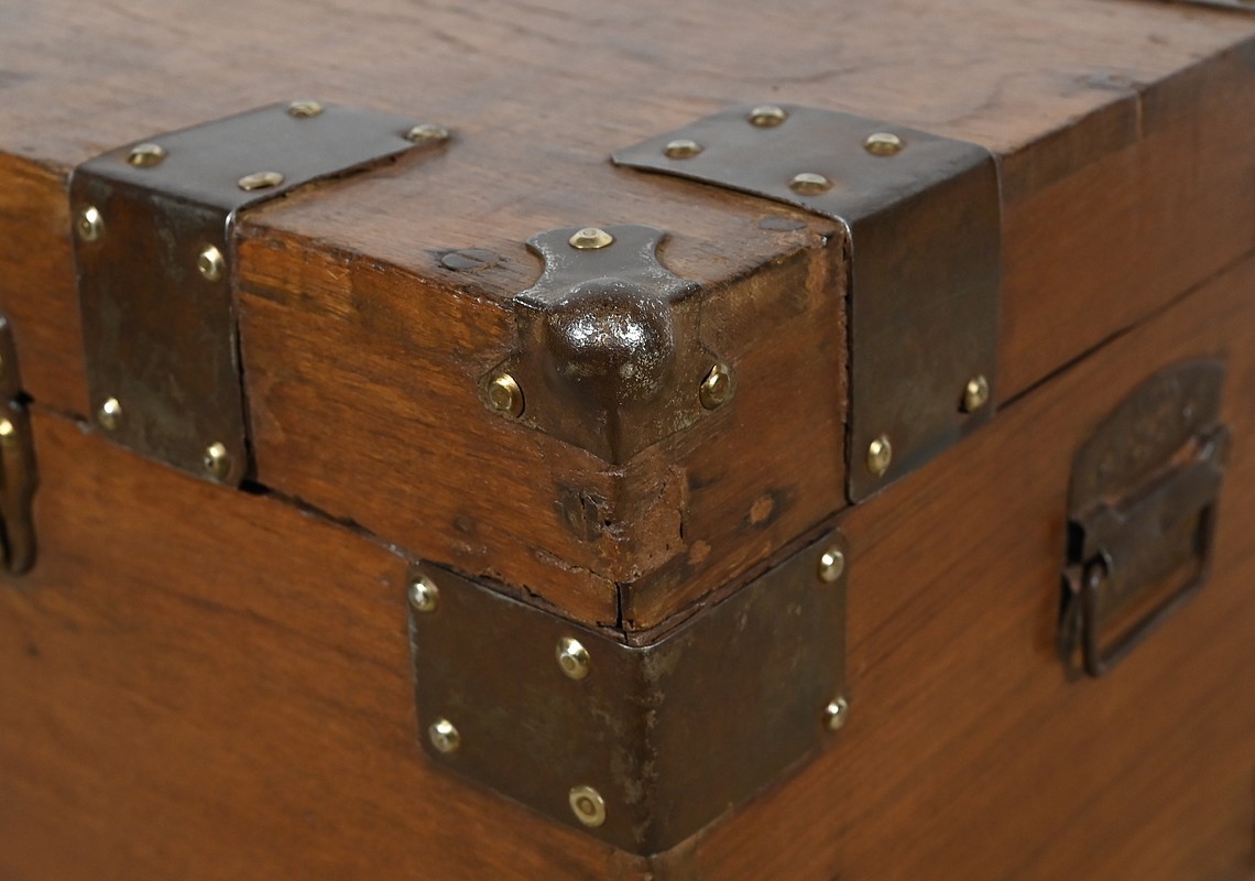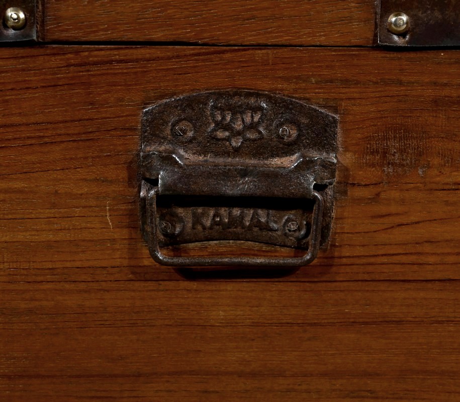 Cette malle entièrement en teck massif se caractérise par ses nombreuses lanières cloutées affirmant son caractère.