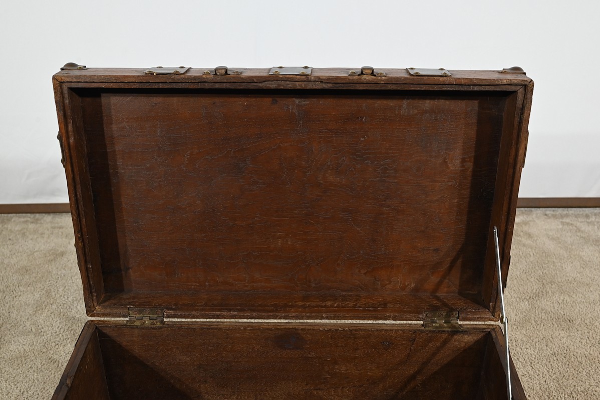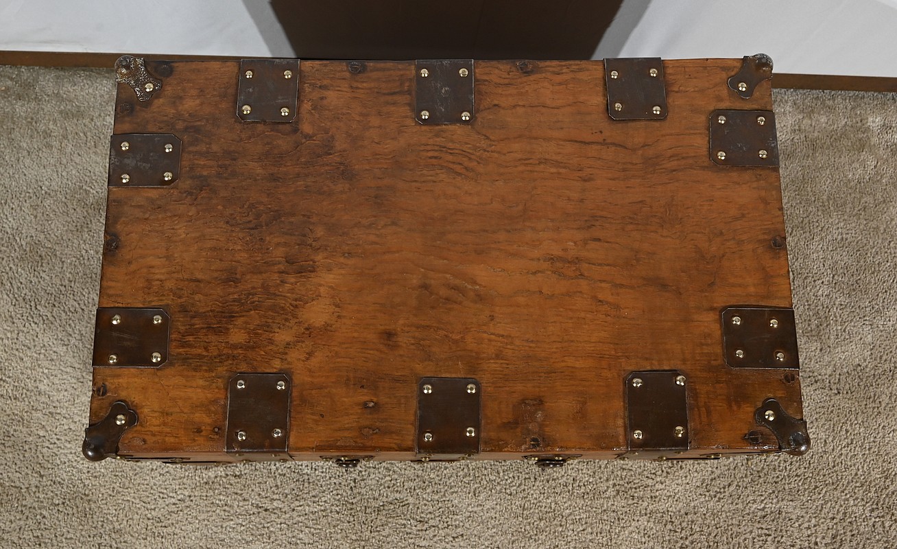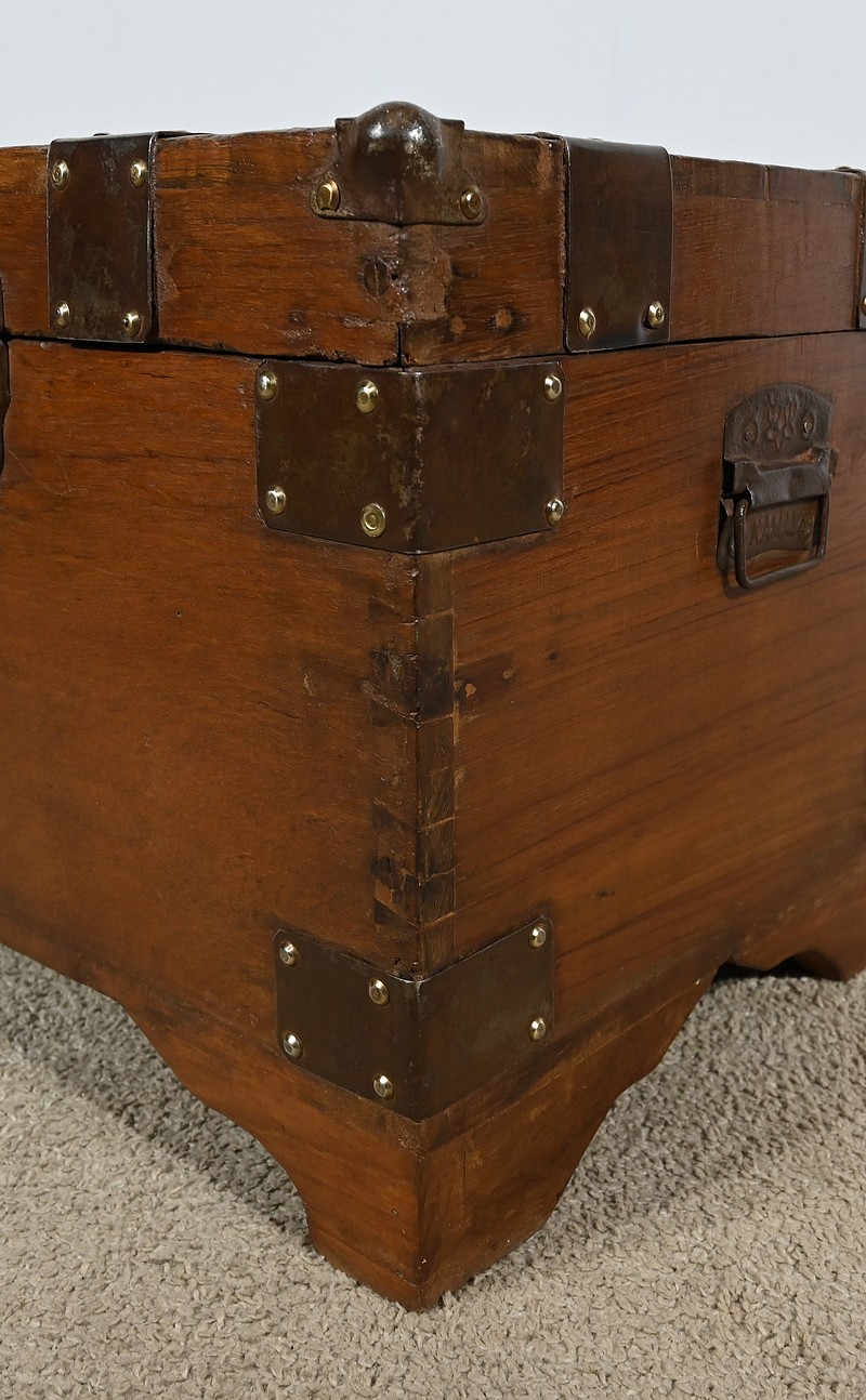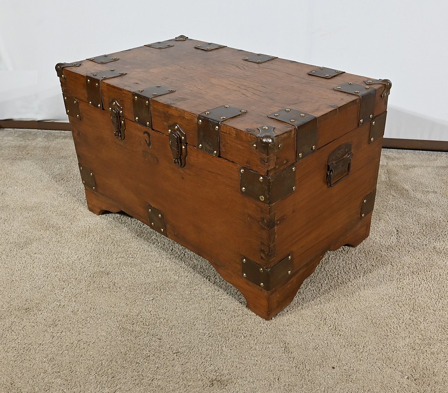 Cette malle entièrement en teck massif se caractérise par ses nombreuses lanières cloutées affirmant son caractère.