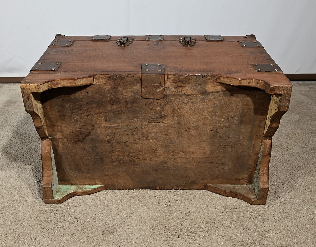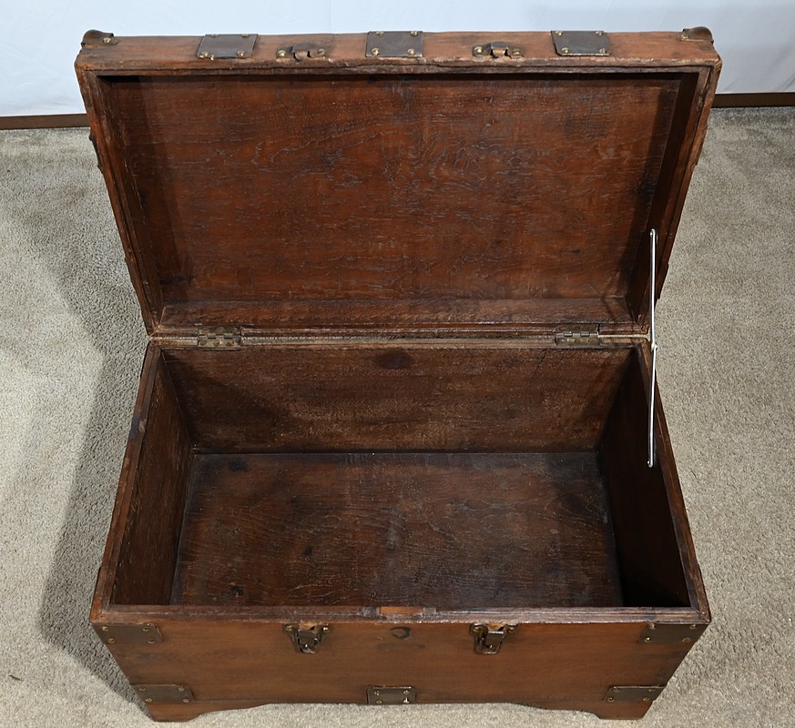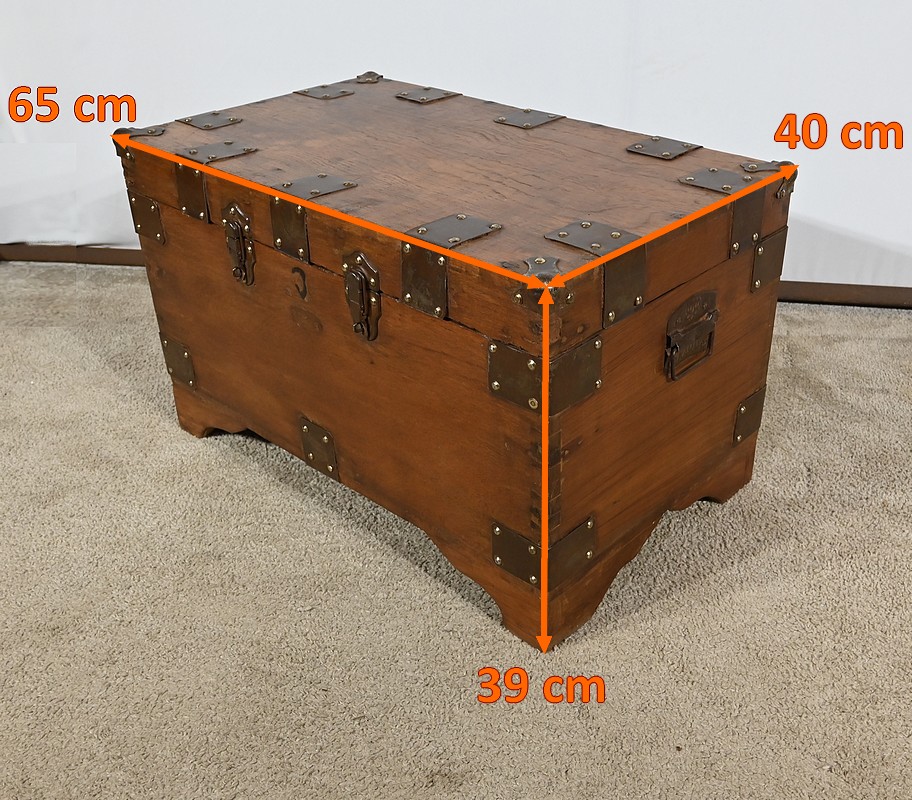 Assemblées à queue d’aronde les faces en teck de ce coffre sont reliées solidement. A l’ouverture, nous découvrons un grand espace de rangement.