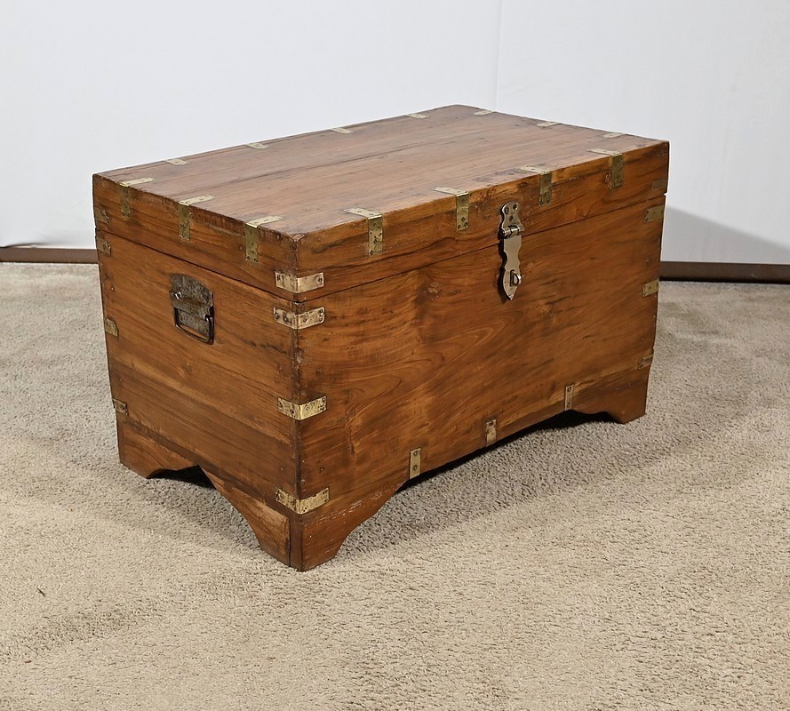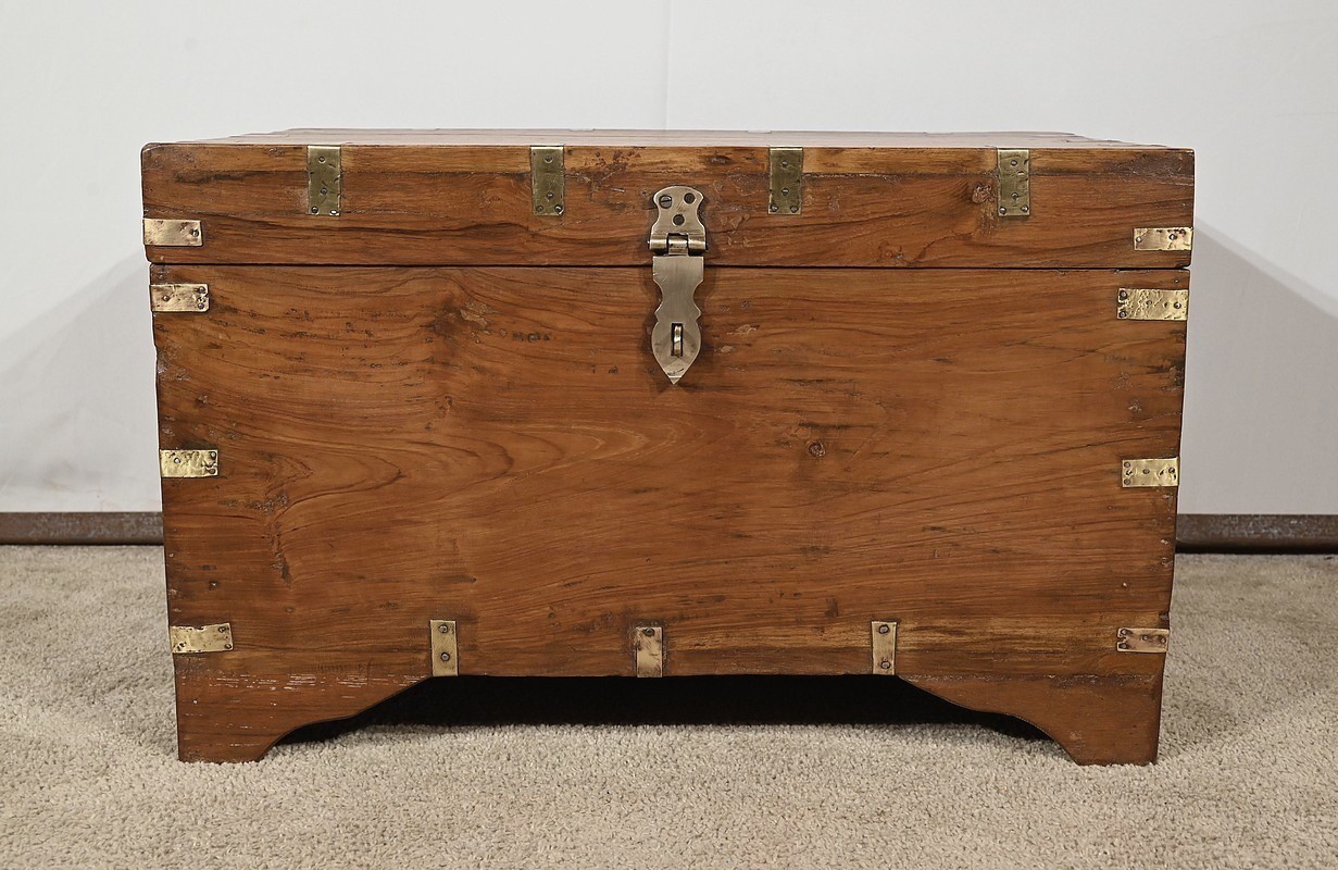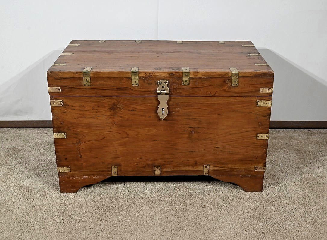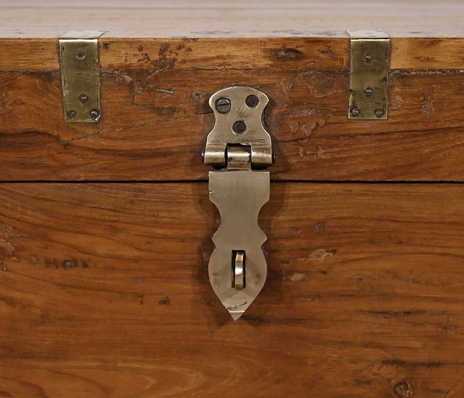 Gage de solidité, les angles de ce coffre en teck massif, sont agrémentés de lanières en laiton.