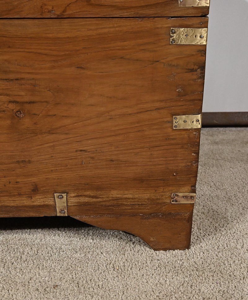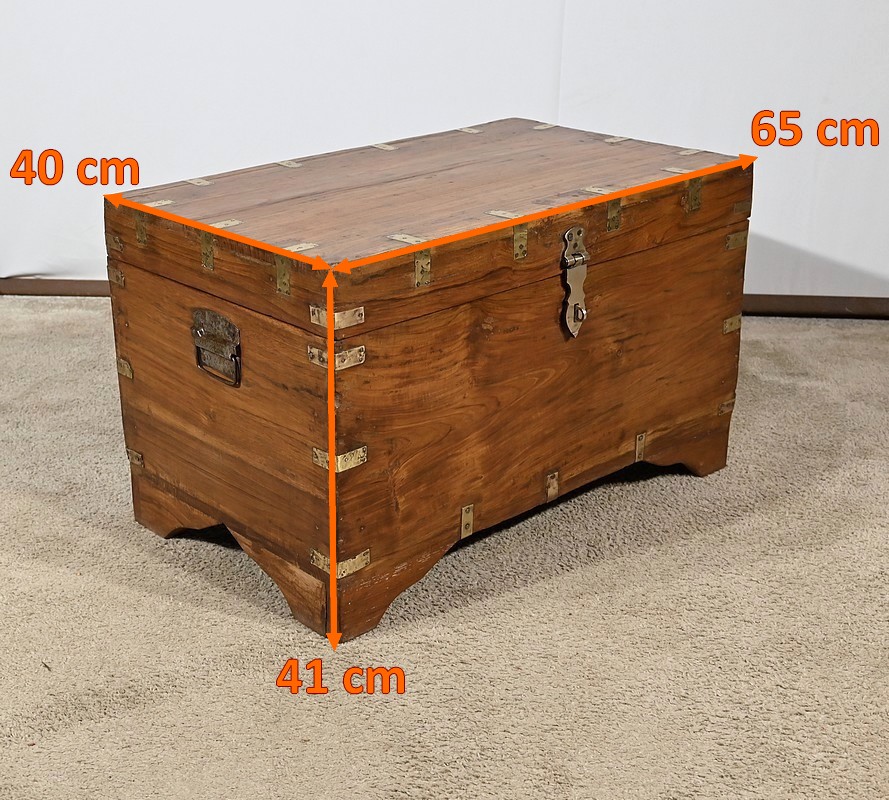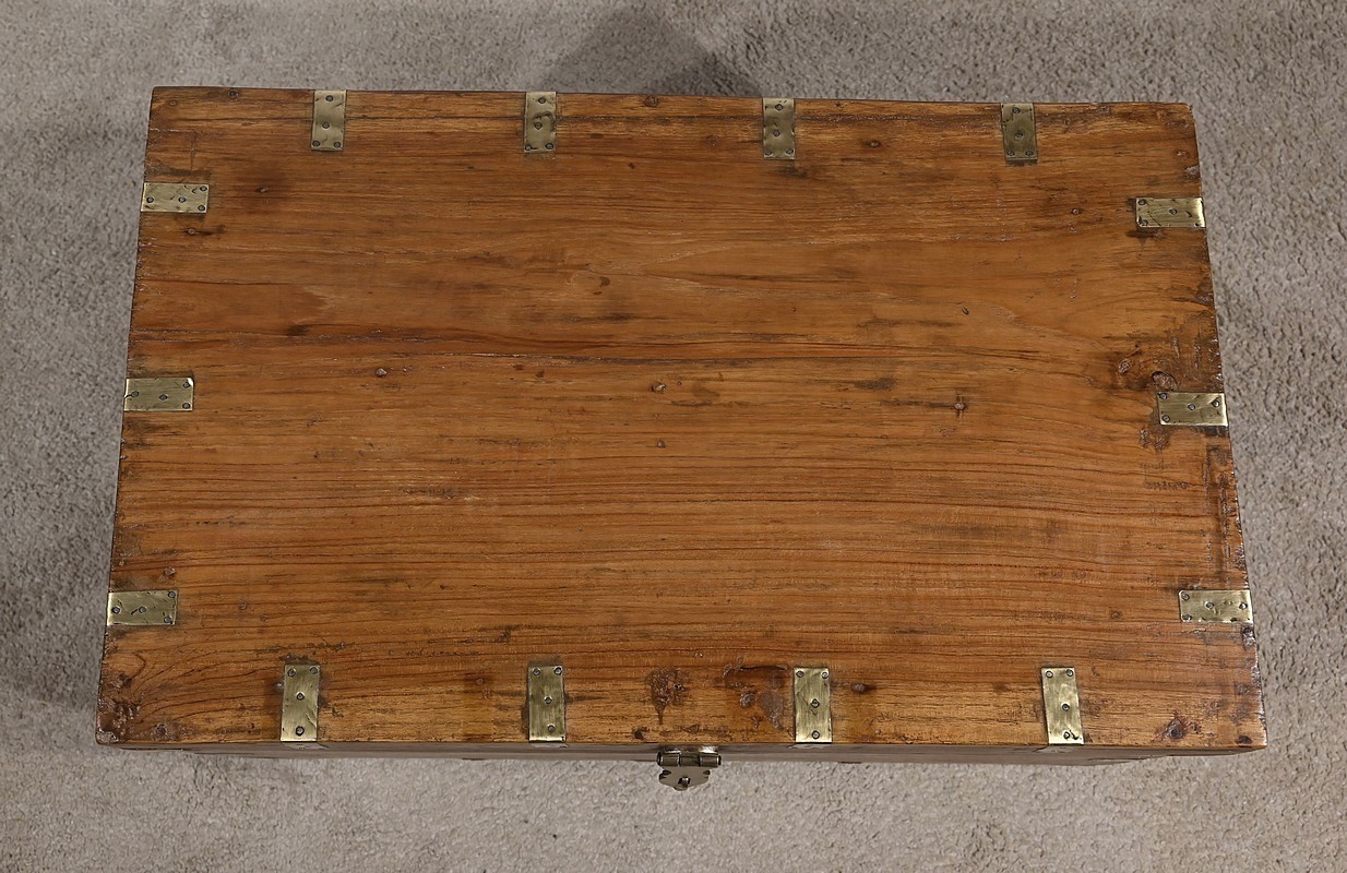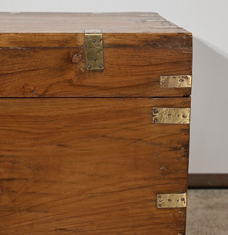 Gage de solidité, les angles de ce coffre en teck massif, sont agrémentés de lanières en laiton.