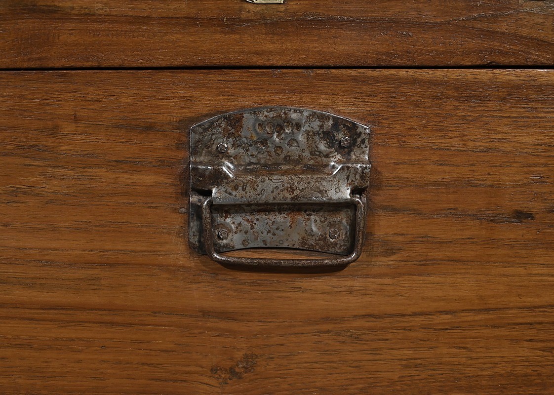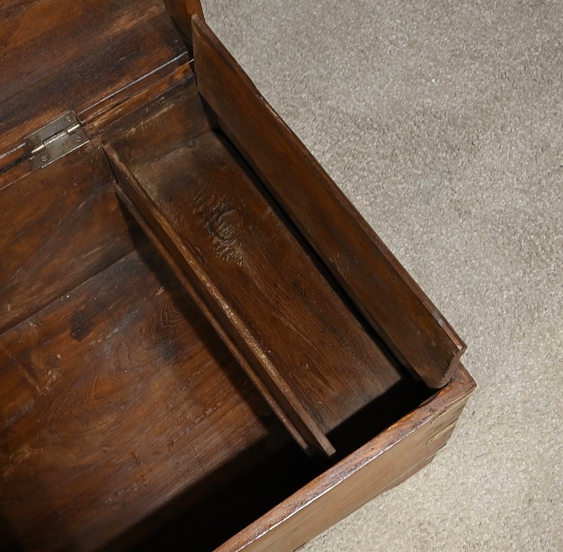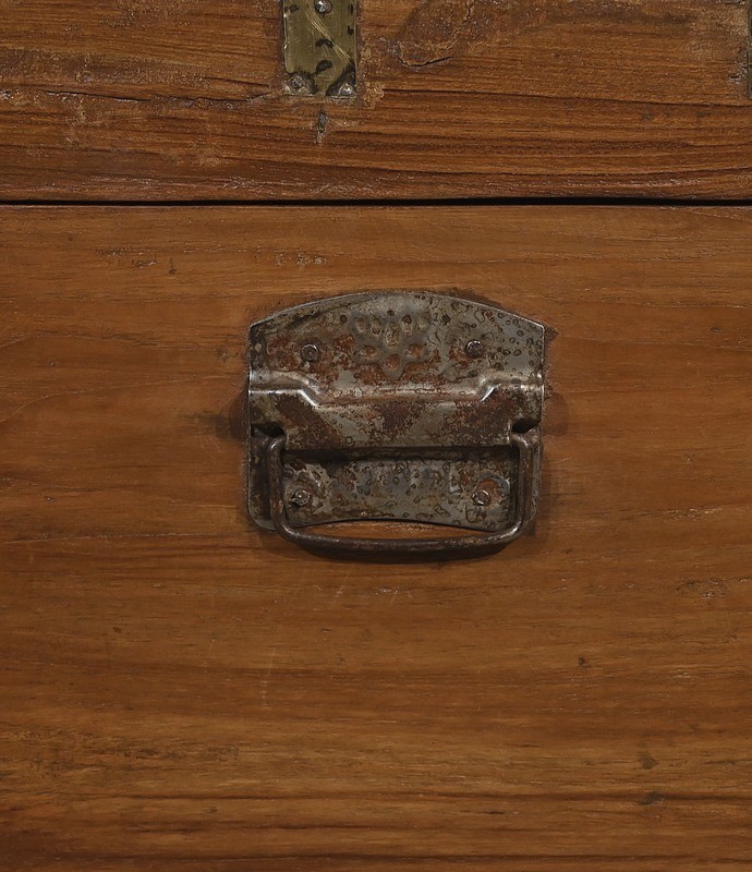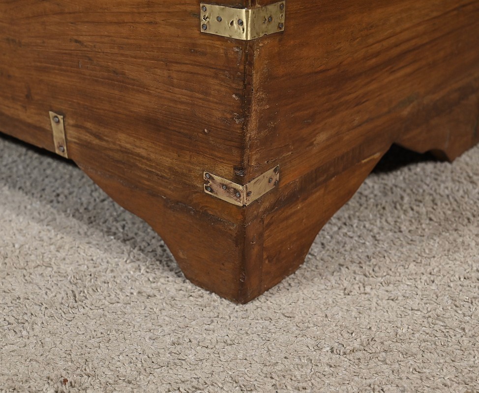 Ce coffre de grande qualité est muni d’une poignée de portage en fer sur chaque côté. Il repose sur des éléments découpés en teck formant des pieds.