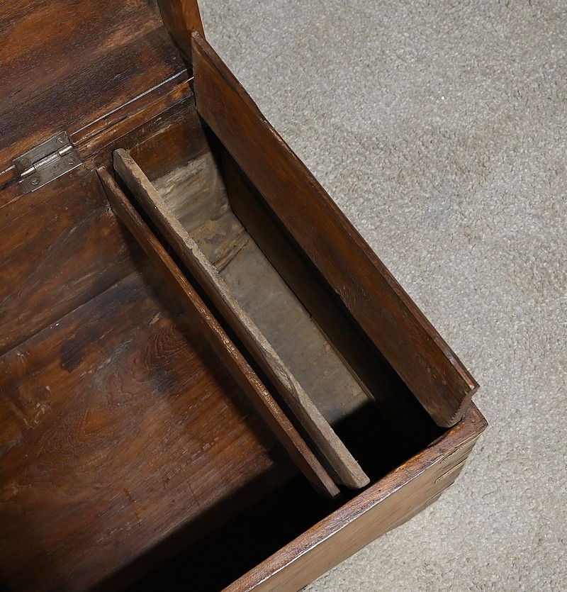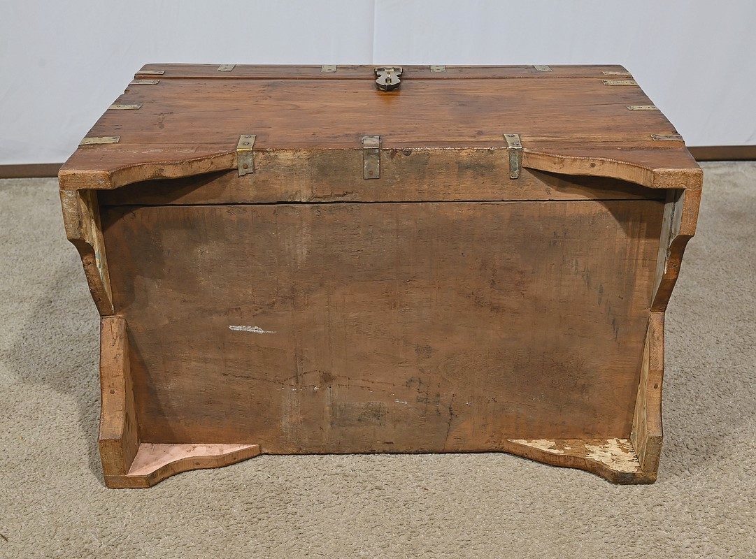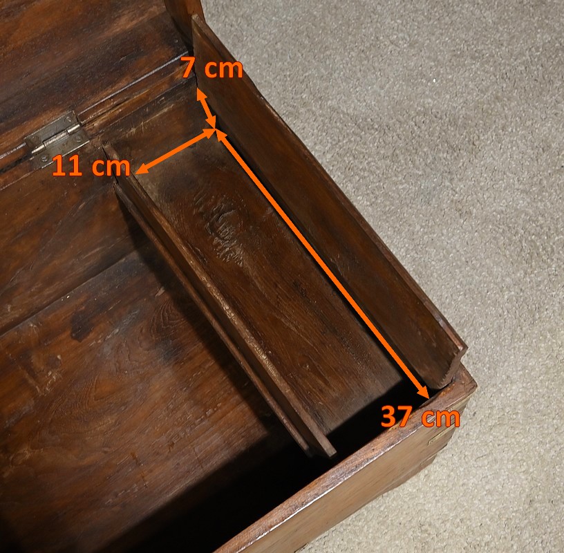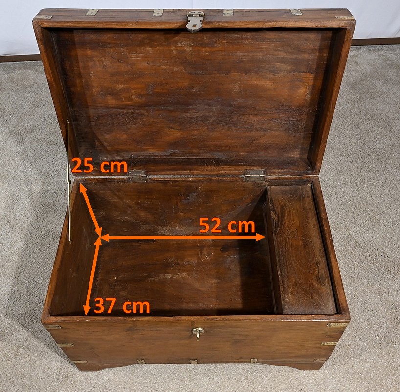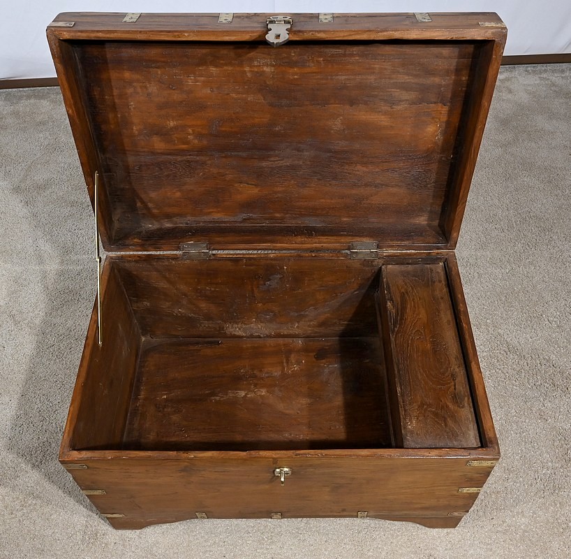 Ce coffre de grande qualité est muni d’une poignée de portage en fer sur chaque côté. Il repose sur des éléments découpés en teck formant des pieds.