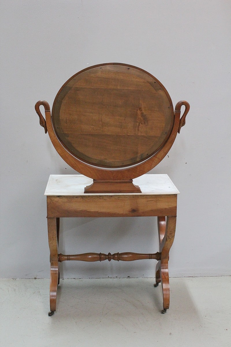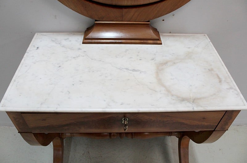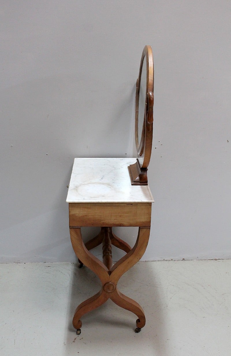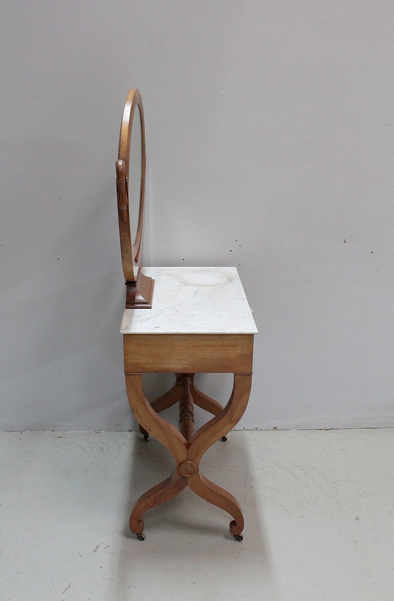 Jolie coiffeuse Charles X en Merisier massif avec son marbre blanc de Carrare tâché.