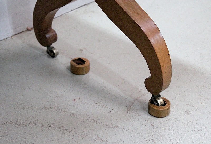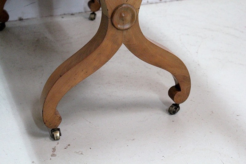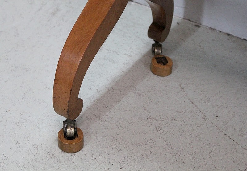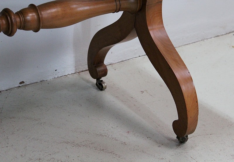 Elle repose sur 2 paires de pieds en X dotés de roulettes et reliés d’une entretoise tournée et moulurée. Les roulettes peuvent être immobilisées par des sabots de bois amovibles.
