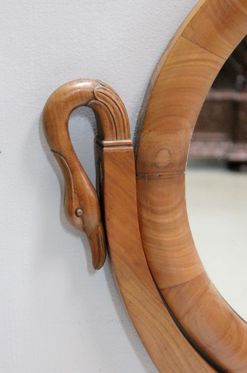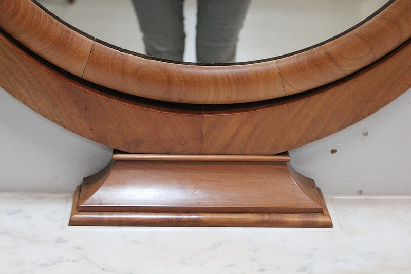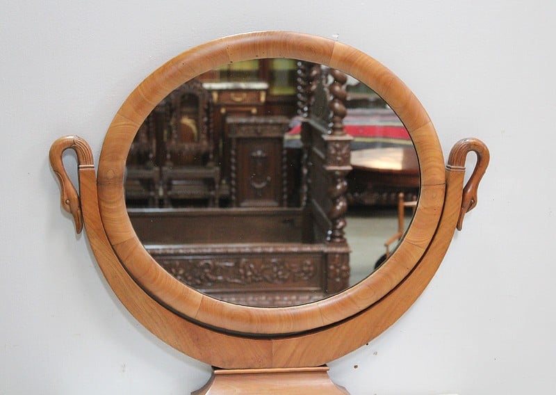 En partie haute, elle arbore un miroir ovale basculant orné de cols de cygnes sculptés sur les côtés.