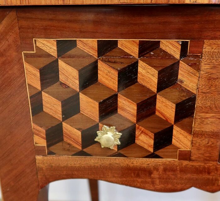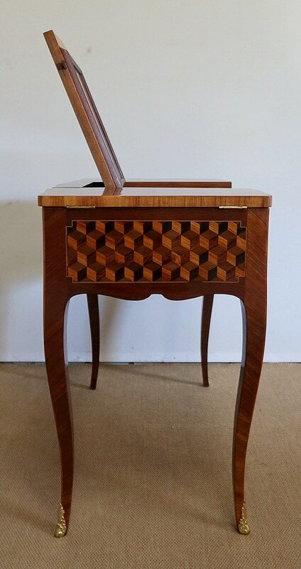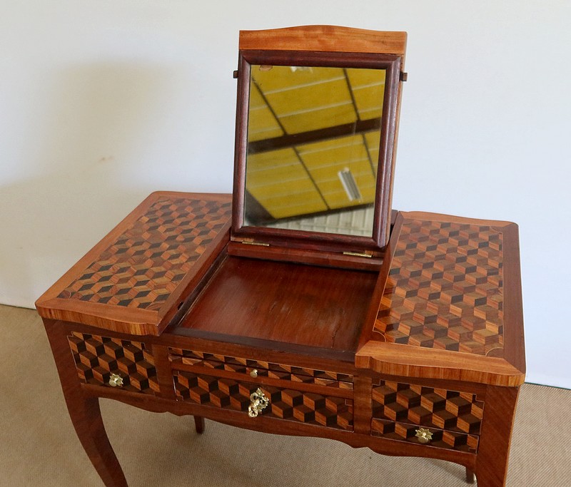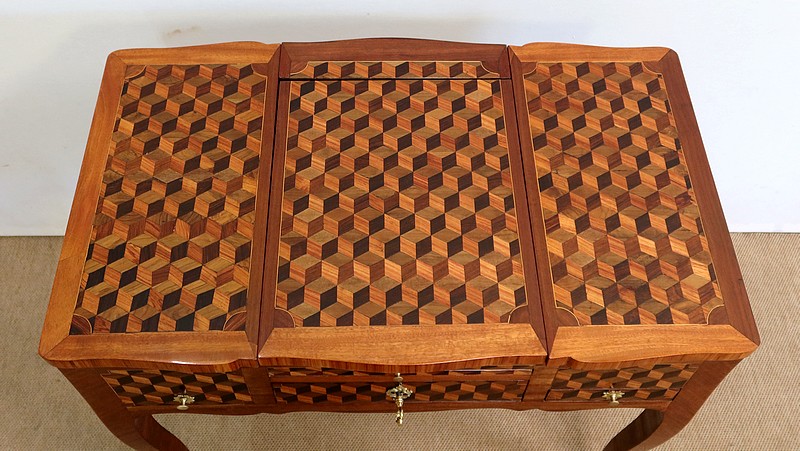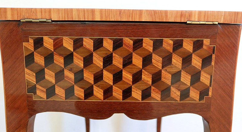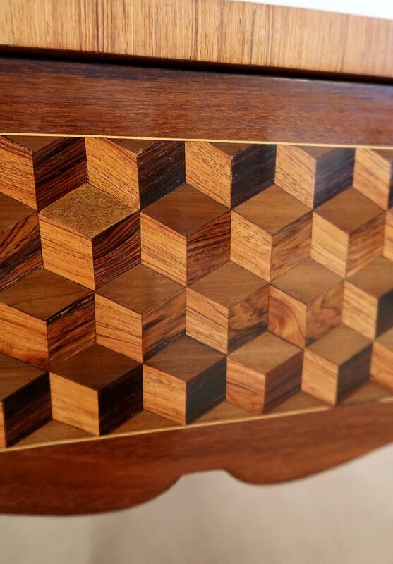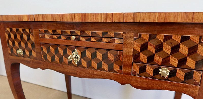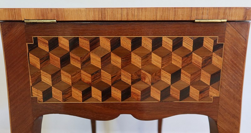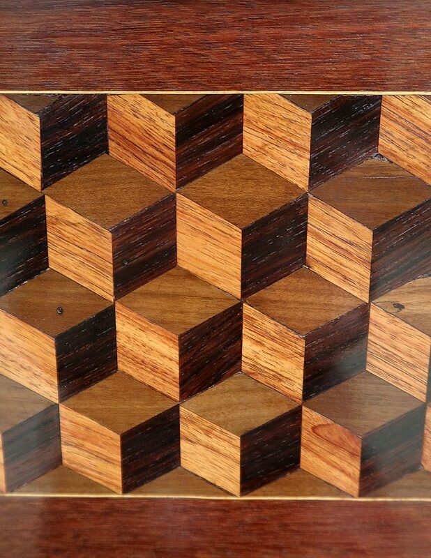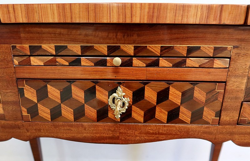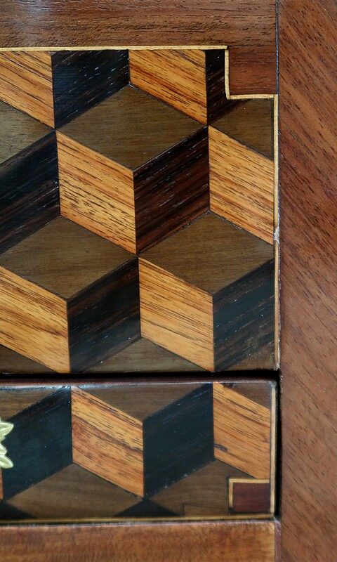 Coiffeuse en acajou et amarante, joliment marquetée sur toutes ses faces de successions de cubes ininterrompues, soulignées par des filets de citronnier. On doit leur effet 3D à l’alternance régulière de bois de rose, de palissandre et de bois teinté vert.