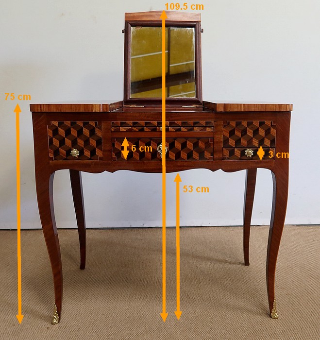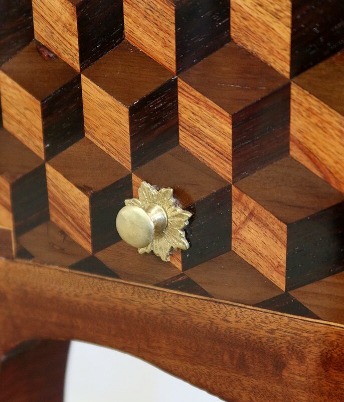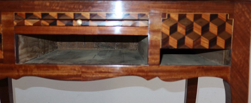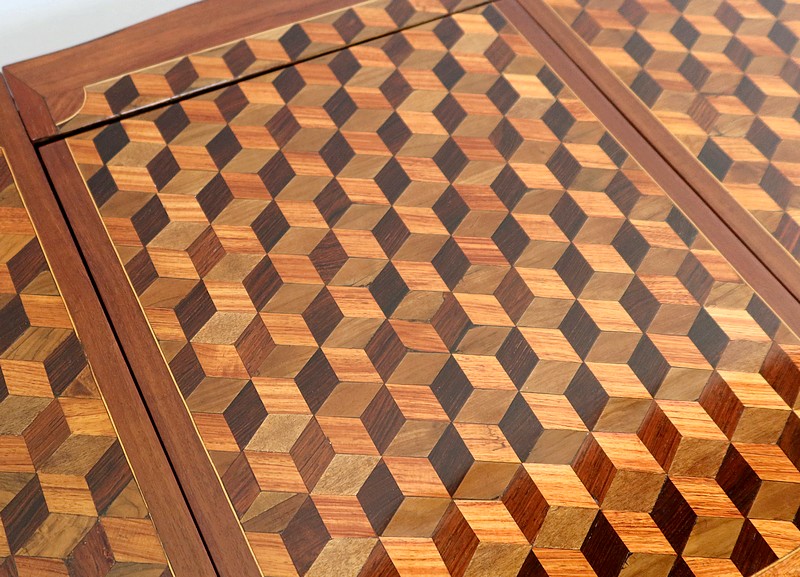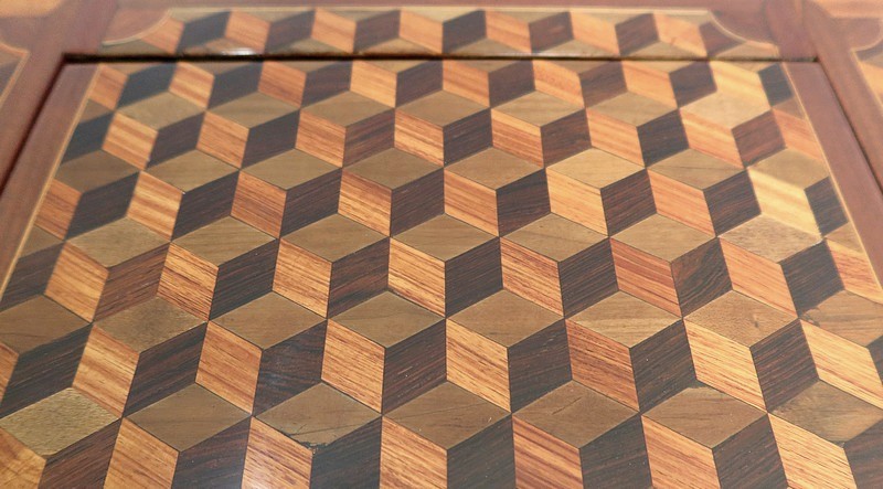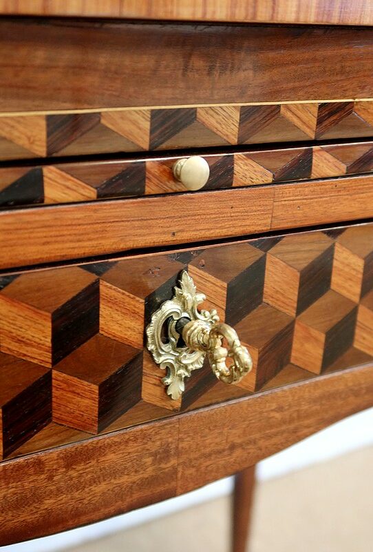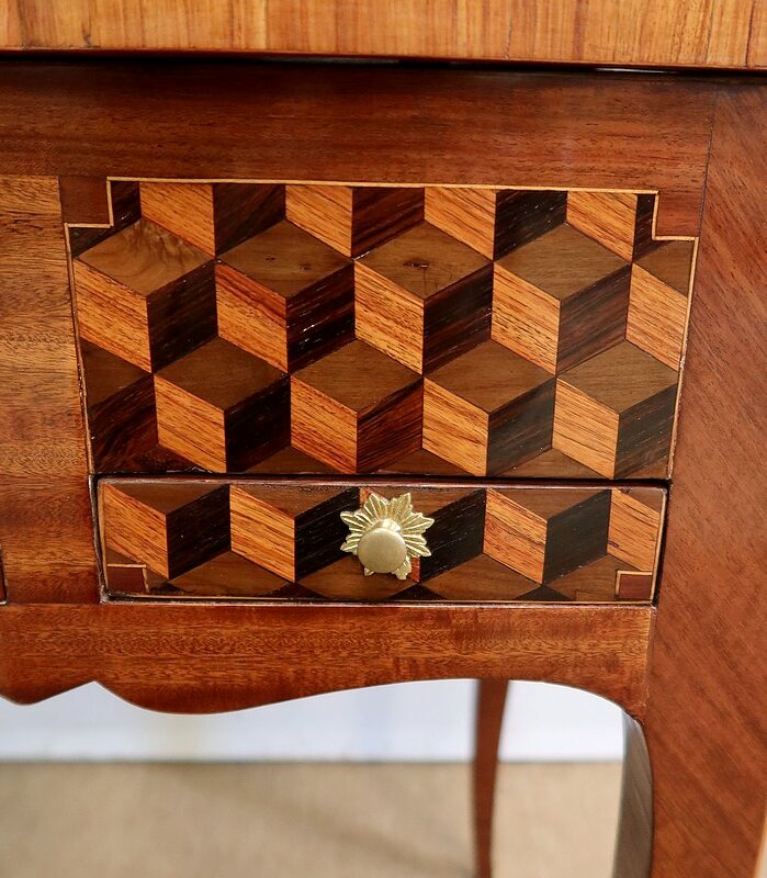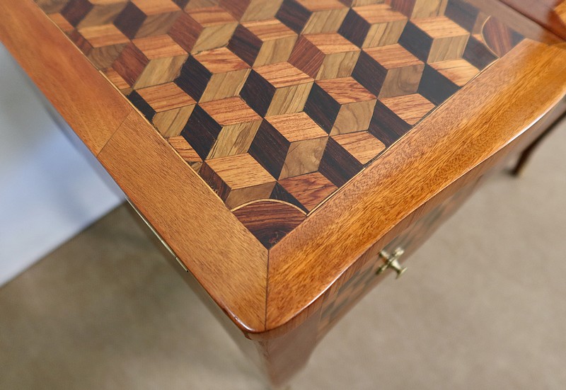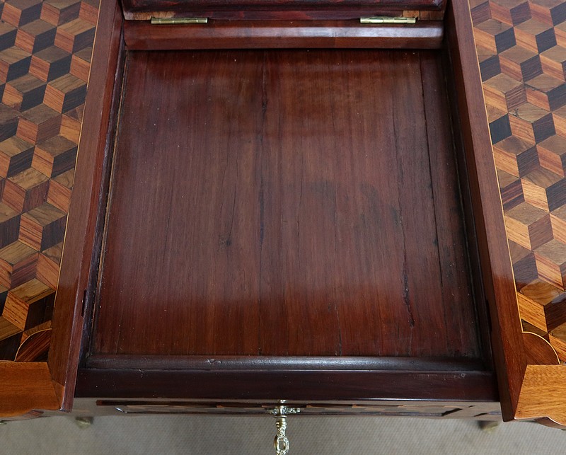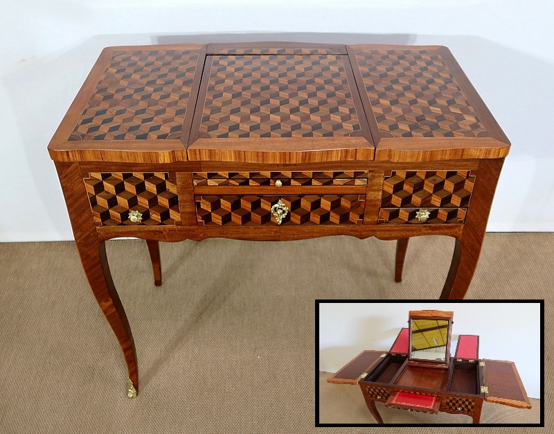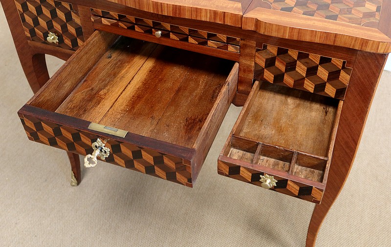 Coiffeuse en acajou et amarante, joliment marquetée sur toutes ses faces de successions de cubes ininterrompues, soulignées par des filets de citronnier. On doit leur effet 3D à l’alternance régulière de bois de rose, de palissandre et de bois teinté vert.