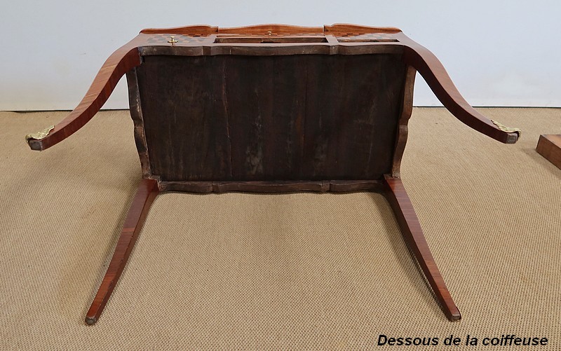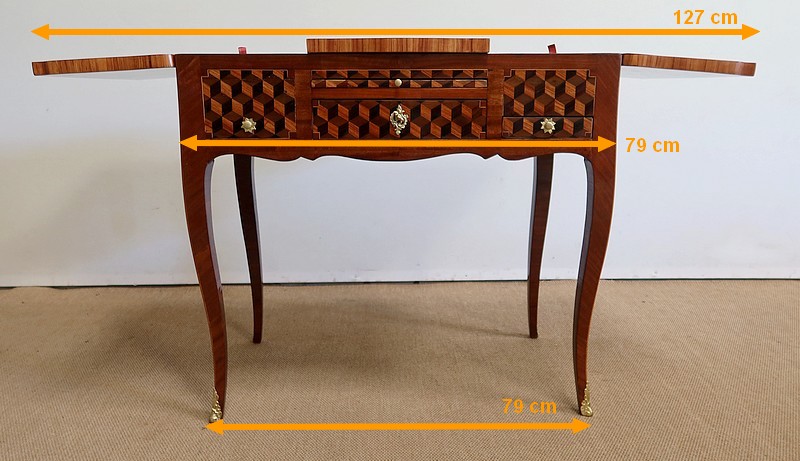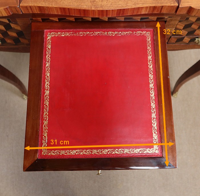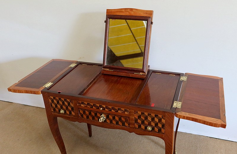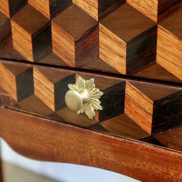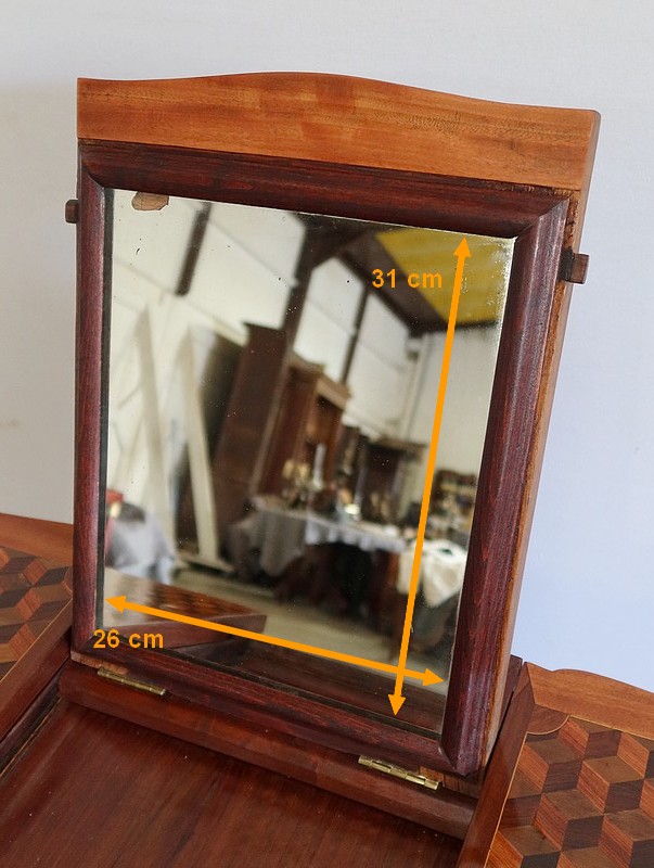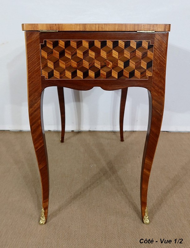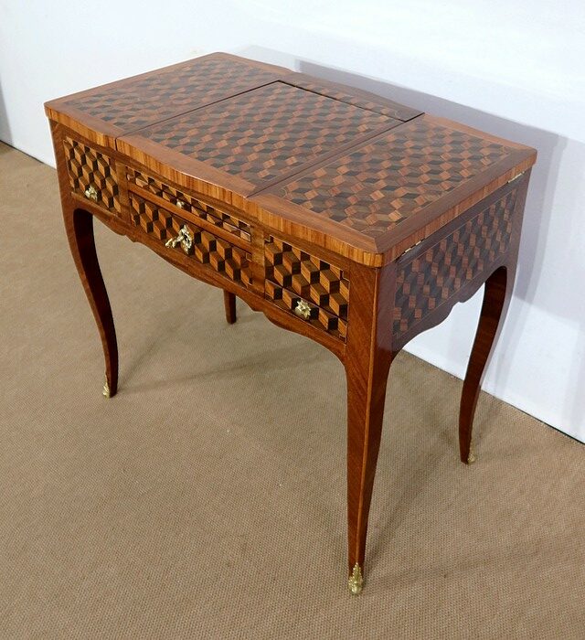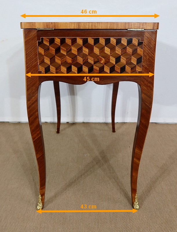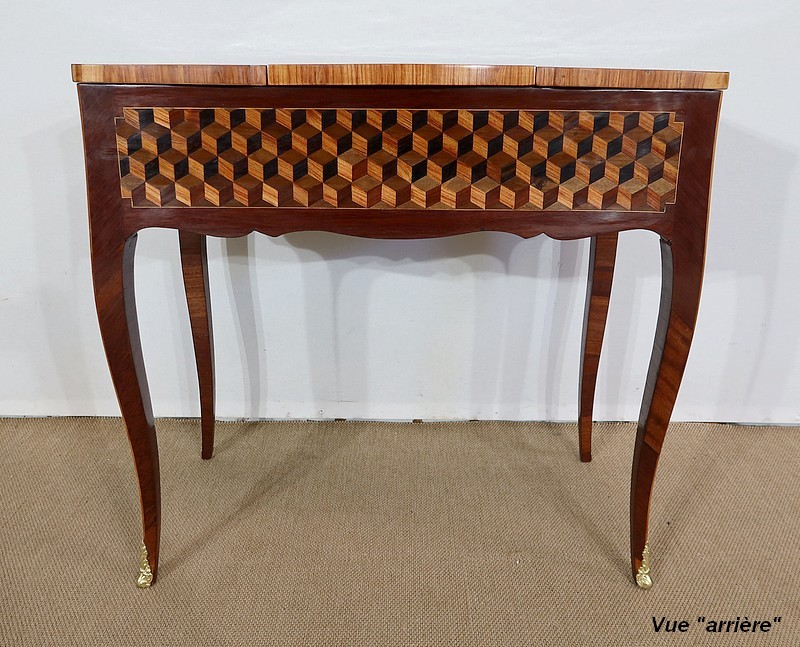 Coiffeuse en acajou et amarante, joliment marquetée sur toutes ses faces de successions de cubes ininterrompues, soulignées par des filets de citronnier. On doit leur effet 3D à l’alternance régulière de bois de rose, de palissandre et de bois teinté vert.