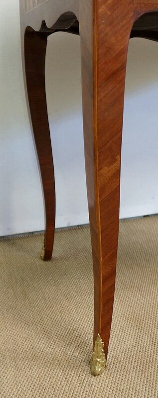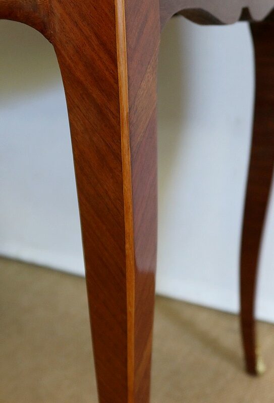 L’ensemble repose sur quatre pieds acajou élégamment galbés, avec arêtes adoucies en bois clair, et se terminant par des sabots laiton.