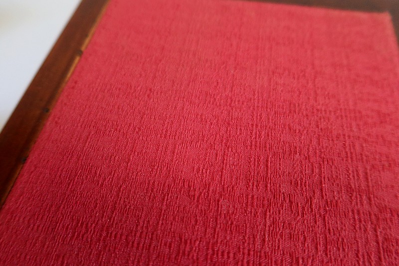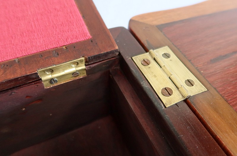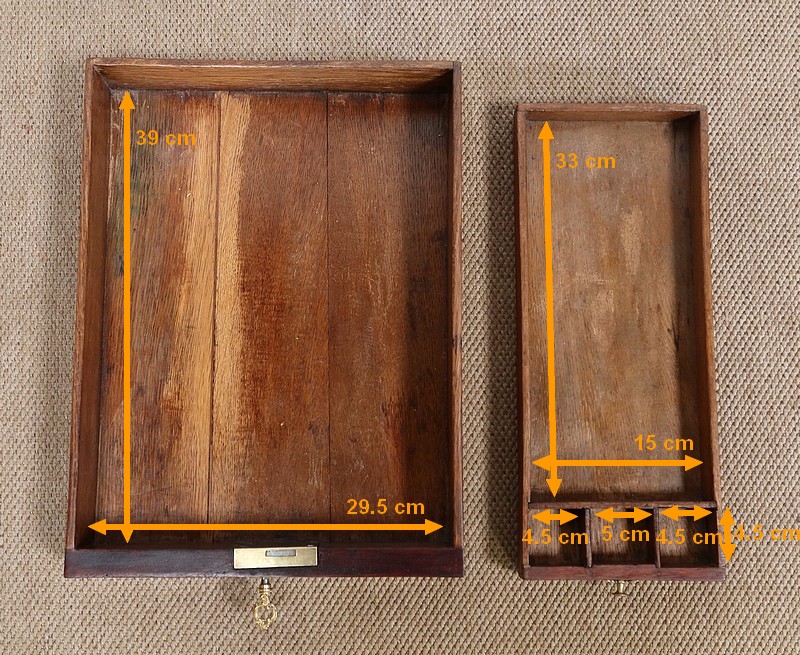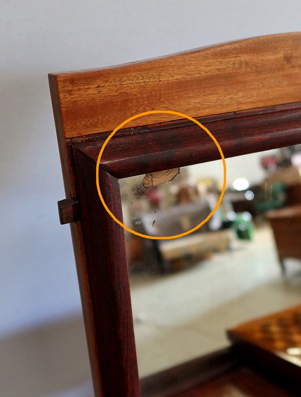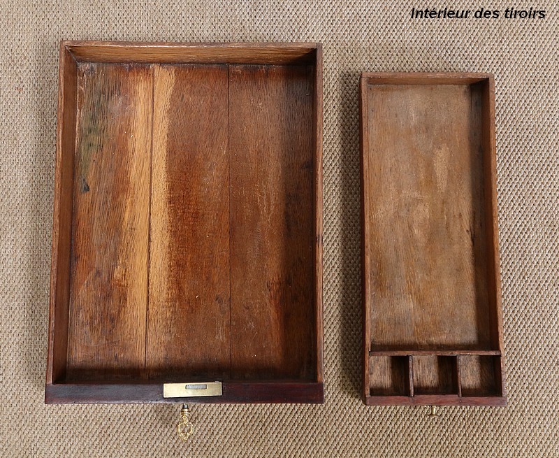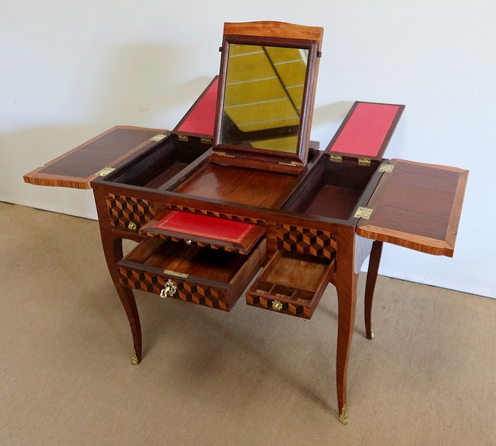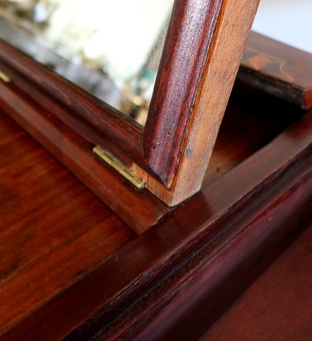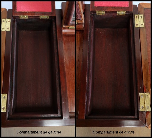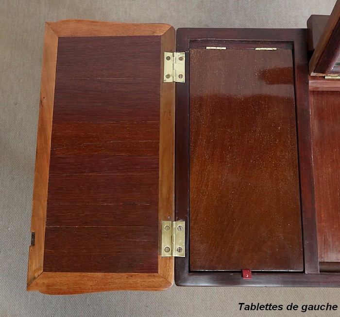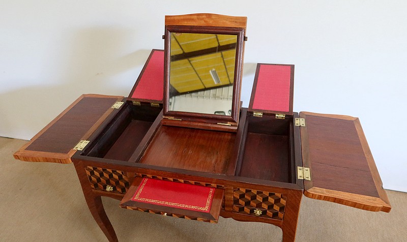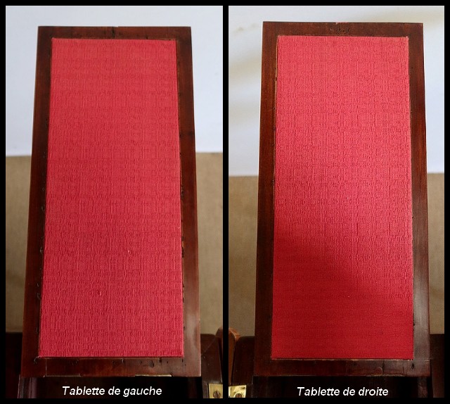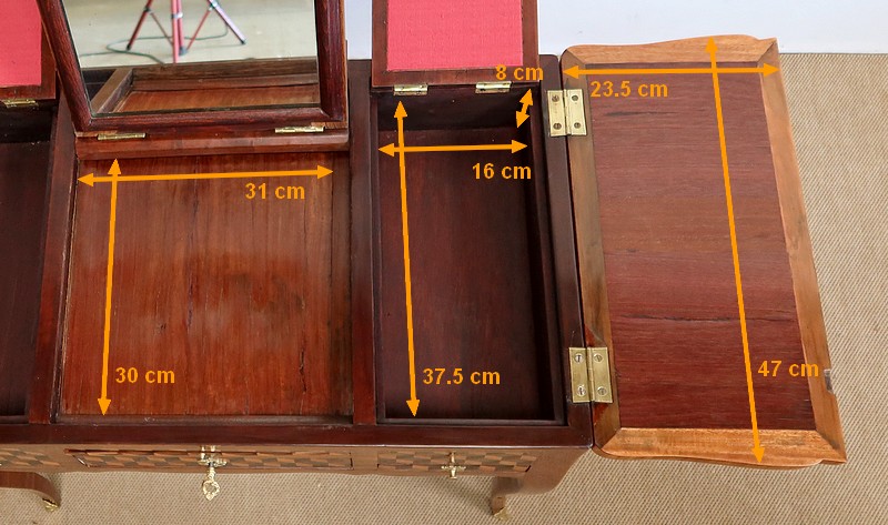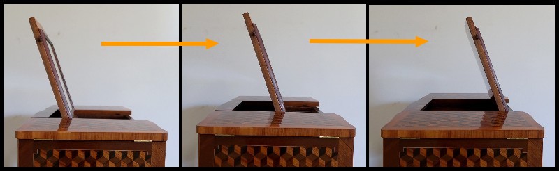 Le dessus de ce meuble est composé de trois abattants. Celui du milieu découvre un miroir au mercure coulissant, permettant d’en régler la distance avec son usager. Les deux abattants latéraux, maintenus horizontalement une fois ouverts, révèlent deux compartiments nus et autant de tablettes à tissu couleur framboise.