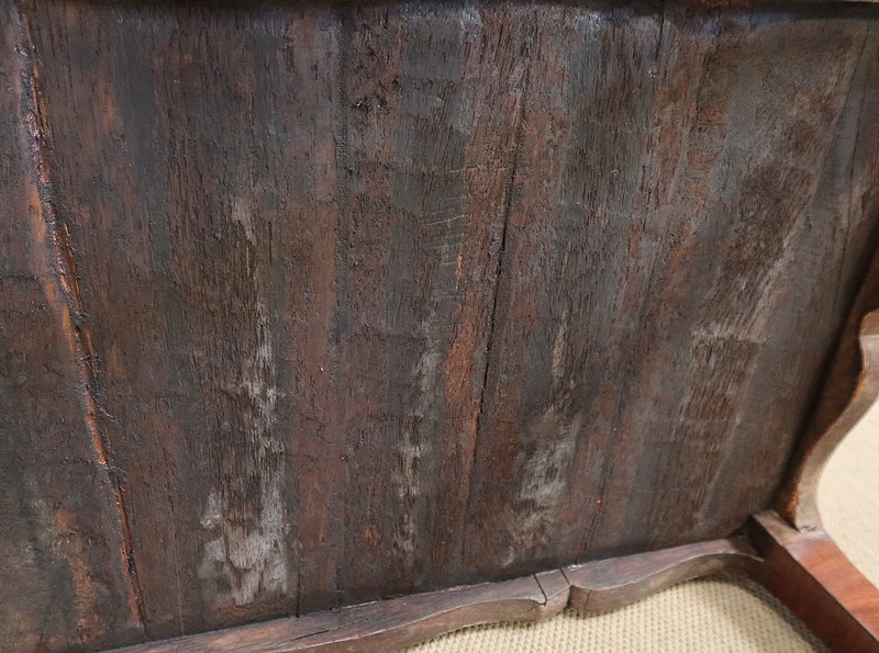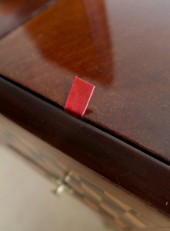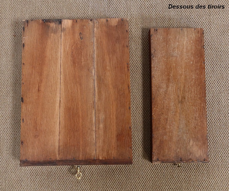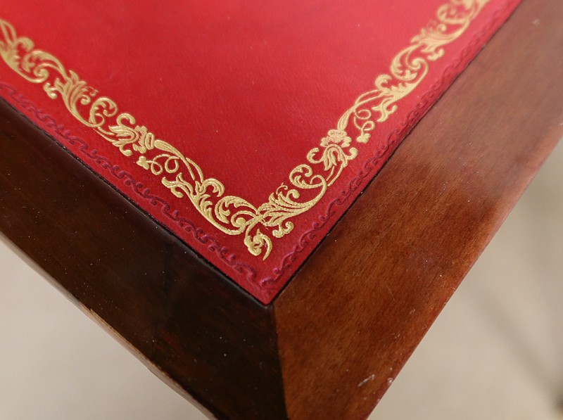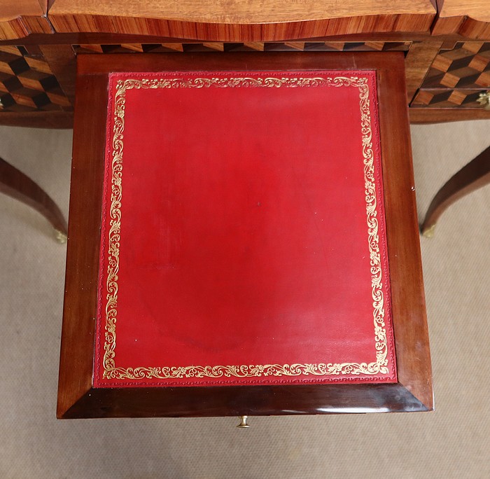 En ceinture, ce meuble de chambre propose une tirette rétractable à bouton laiton, garnie d’un cuir rouge actuel à frise dorée. On découvre également un premier tiroir central avec entrée bronze, serrure d’origine fonctionnelle et clé rapportée, puis un second, à droite, plus petit et à casiers. Le tiroir de gauche est factice.
