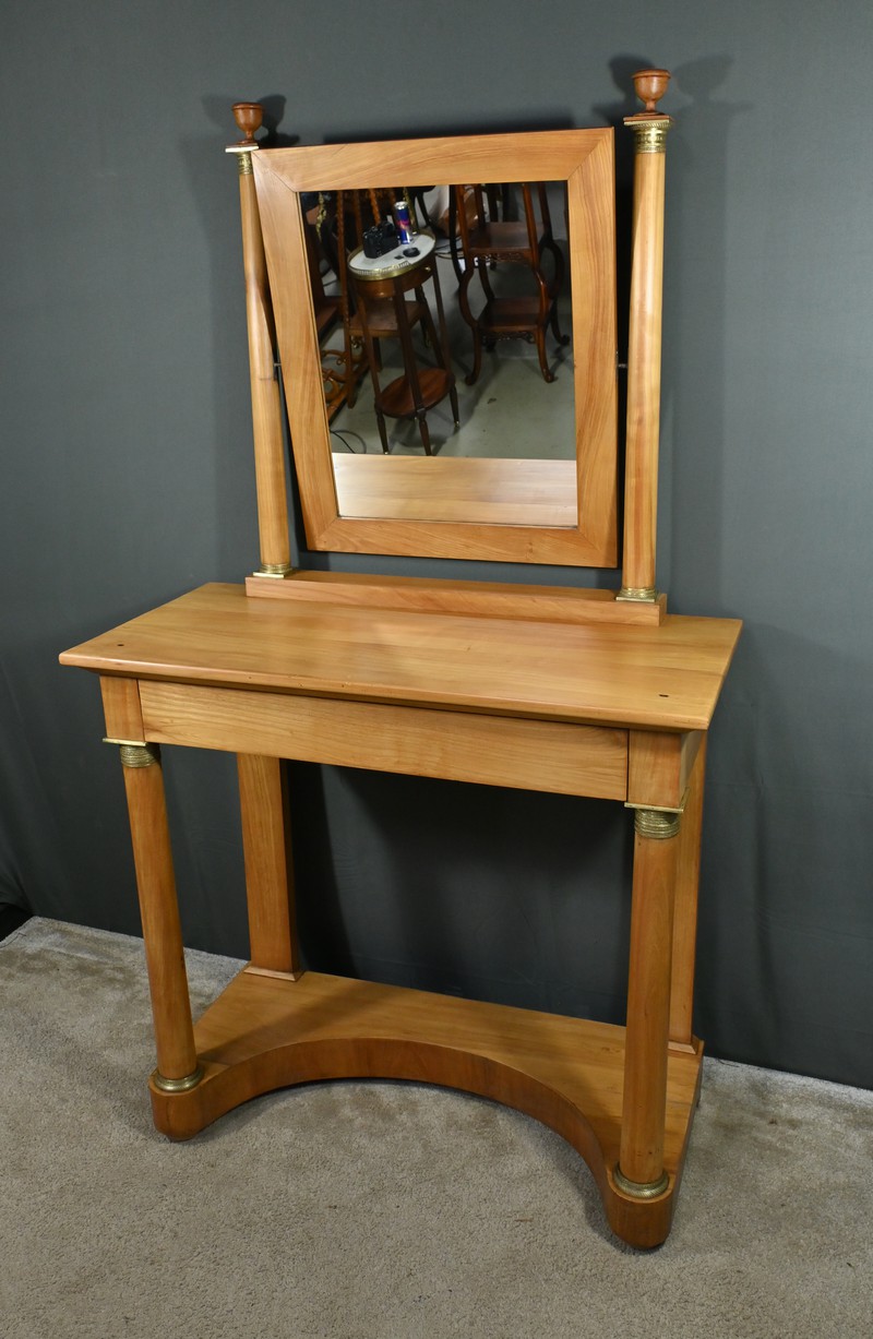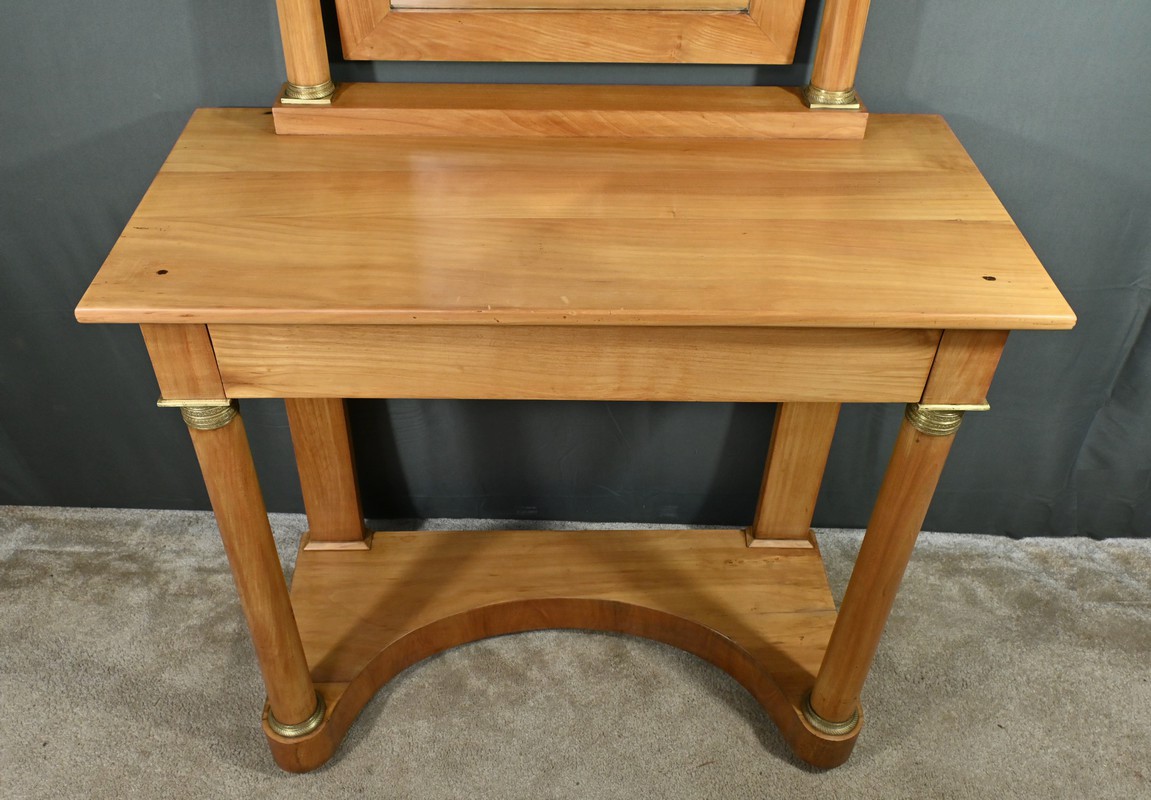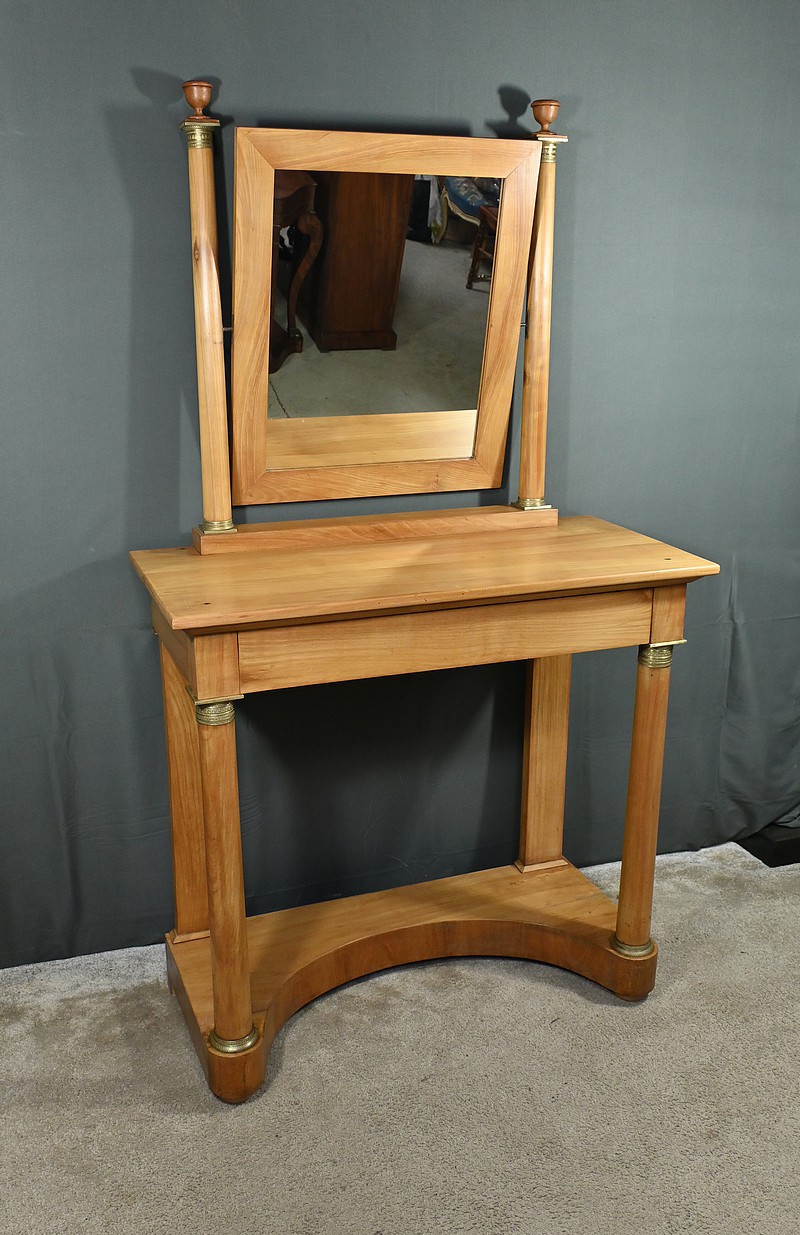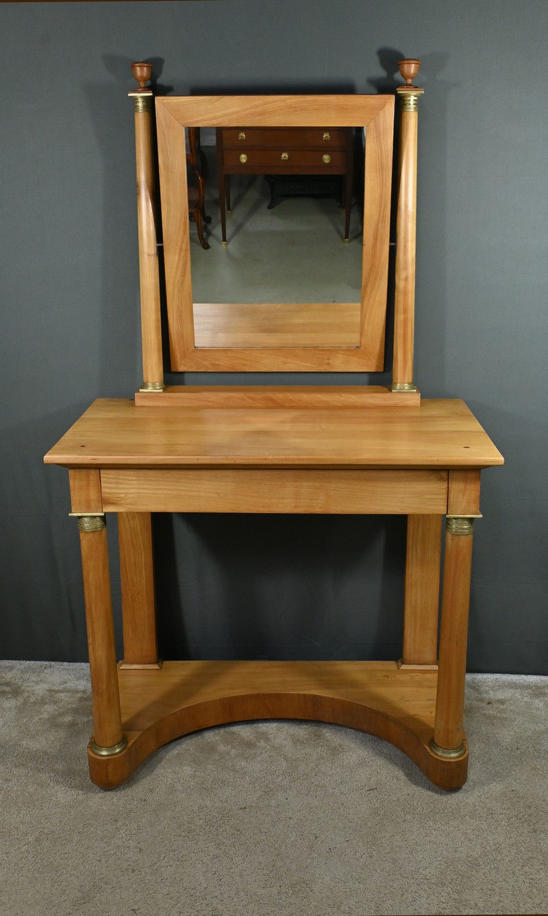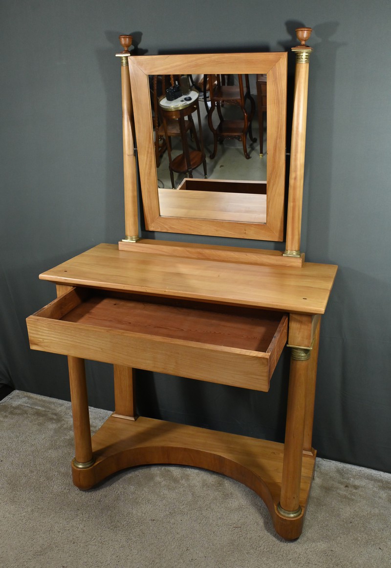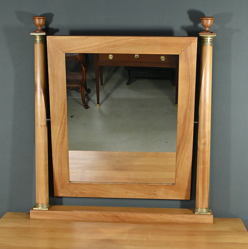 Cette coiffeuse Empire en merisier blond ouvre en ceinture par un long tiroir dissimulé. Elle se distingue par son grand miroir pivotant encadré à coupe d’onglet . Ce dernier est soutenu par deux colonnes cylindriques surmontées de toupies et agrémentées de bagues en bronze ciselé. Les montants antérieurs sont posés sur un socle concave en façade se terminant par des pieds galettes. Ces deux colonnes sont accompagnées de bagues ouvragées en partie haute et de collerettes en partie basse. Avec son allure raffinée cette coiffeuse au design intemporel trouvera aisément place dans votre intérieur.