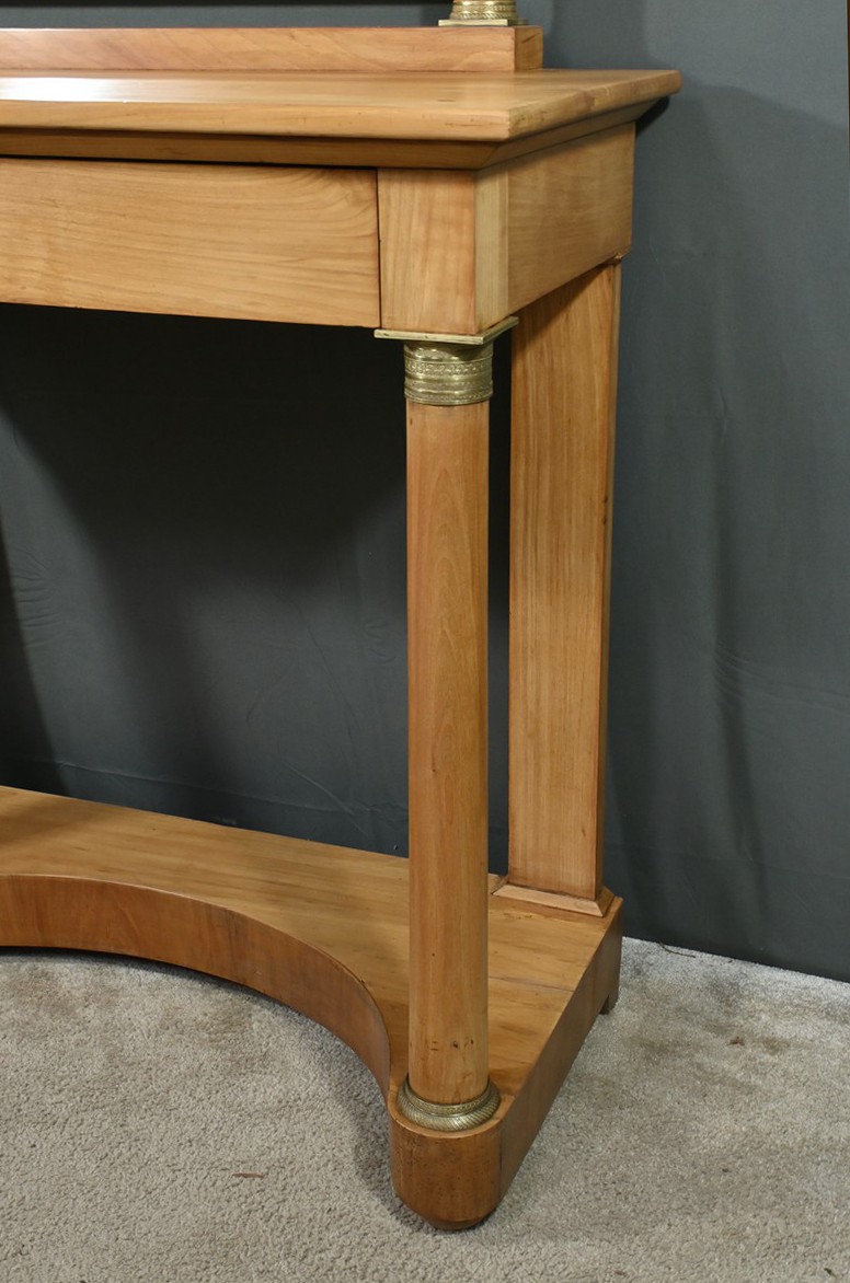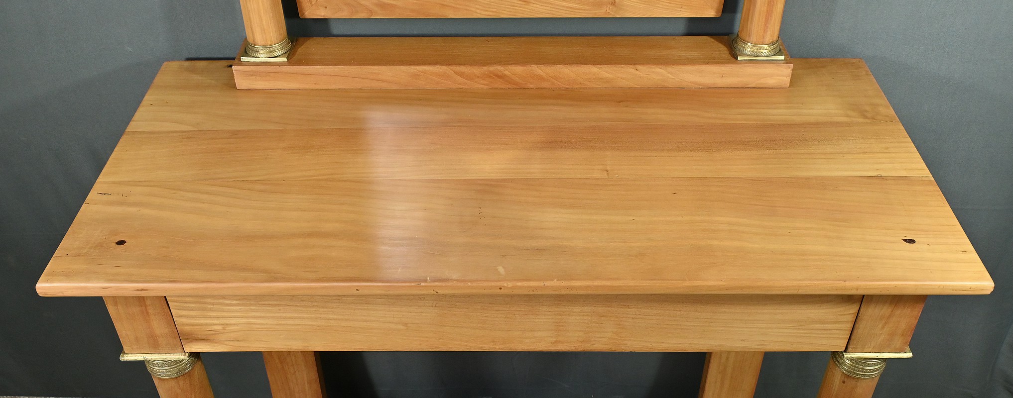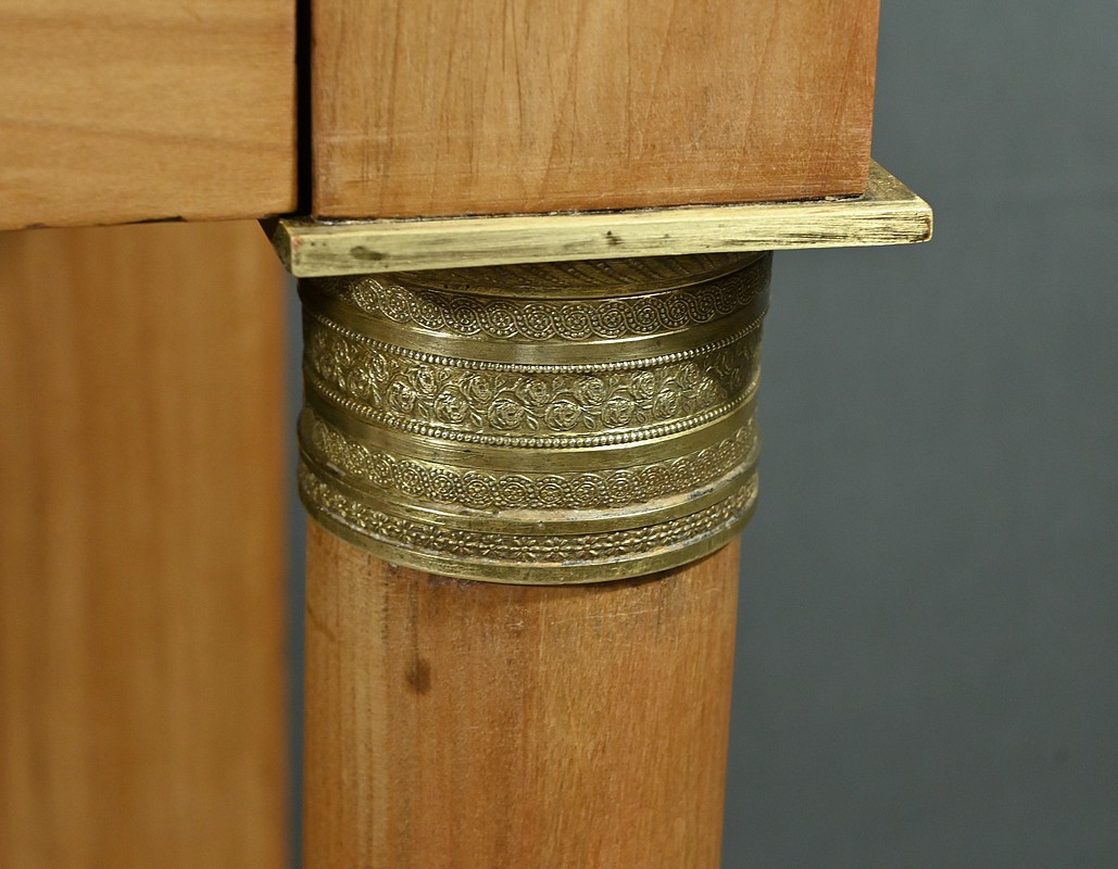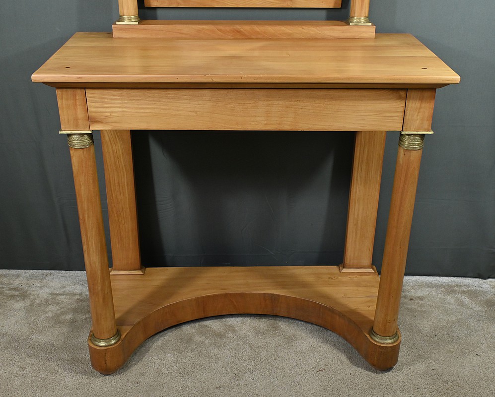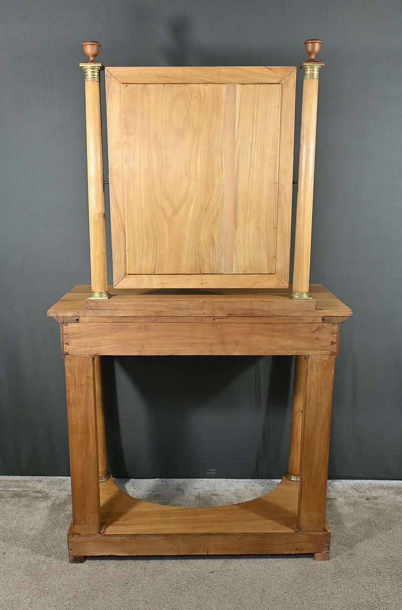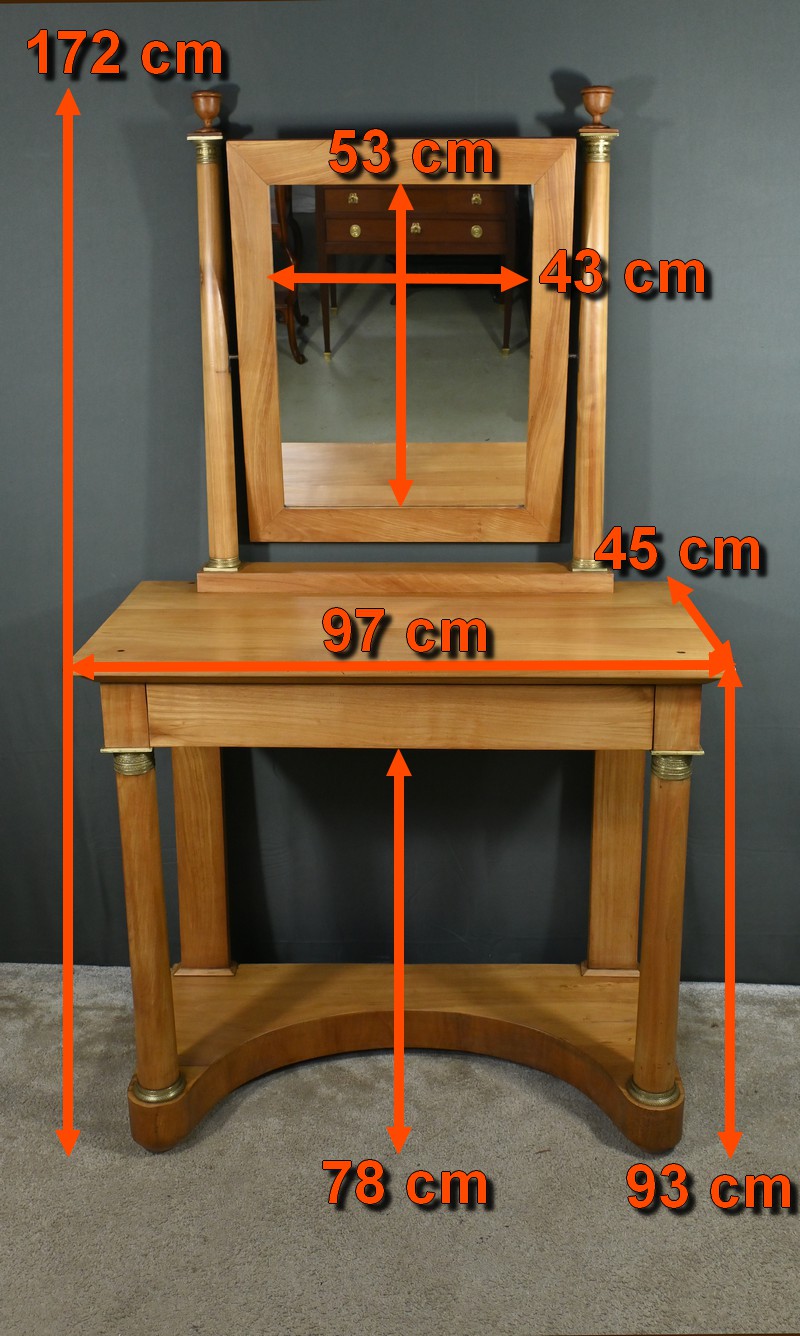 Cette coiffeuse Empire en merisier blond ouvre en ceinture par un long tiroir dissimulé. Elle se distingue par son grand miroir pivotant encadré à coupe d’onglet . Ce dernier est soutenu par deux colonnes cylindriques surmontées de toupies et agrémentées de bagues en bronze ciselé. Les montants antérieurs sont posés sur un socle concave en façade se terminant par des pieds galettes. Ces deux colonnes sont accompagnées de bagues ouvragées en partie haute et de collerettes en partie basse. Avec son allure raffinée cette coiffeuse au design intemporel trouvera aisément place dans votre intérieur.