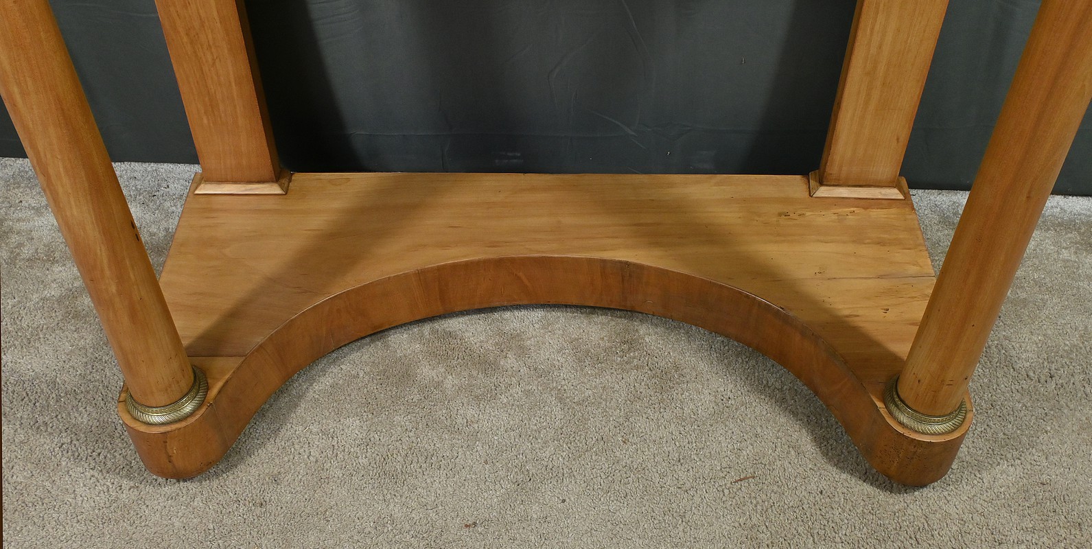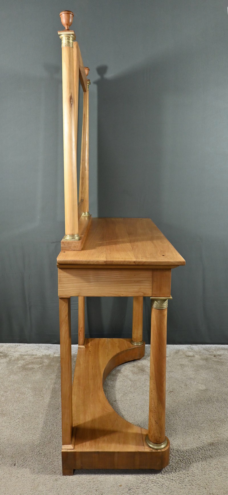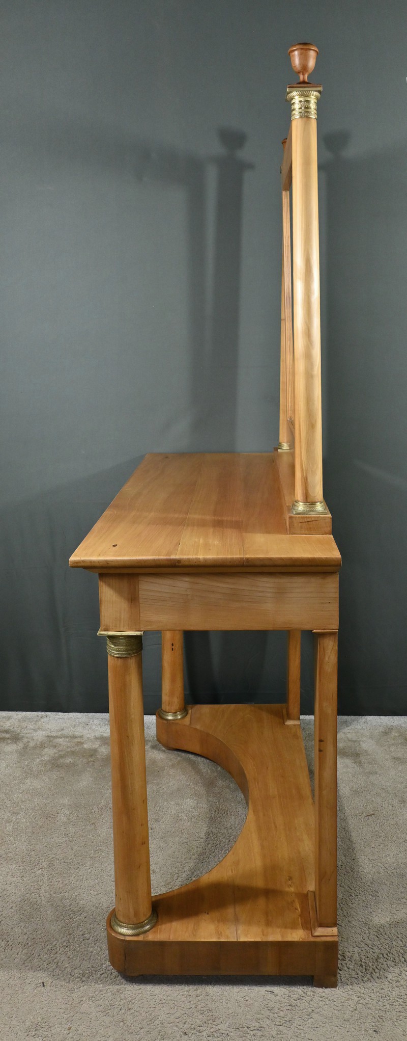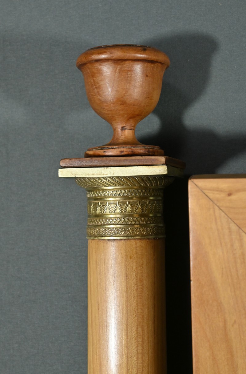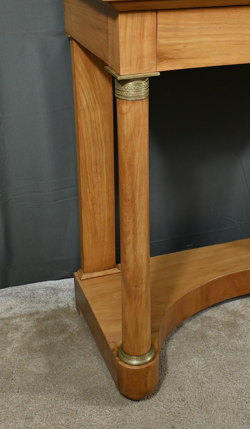 Cette coiffeuse Empire en merisier blond ouvre en ceinture par un long tiroir dissimulé. Elle se distingue par son grand miroir pivotant encadré à coupe d’onglet . Ce dernier est soutenu par deux colonnes cylindriques surmontées de toupies et agrémentées de bagues en bronze ciselé. Les montants antérieurs sont posés sur un socle concave en façade se terminant par des pieds galettes. Ces deux colonnes sont accompagnées de bagues ouvragées en partie haute et de collerettes en partie basse. Avec son allure raffinée cette coiffeuse au design intemporel trouvera aisément place dans votre intérieur.