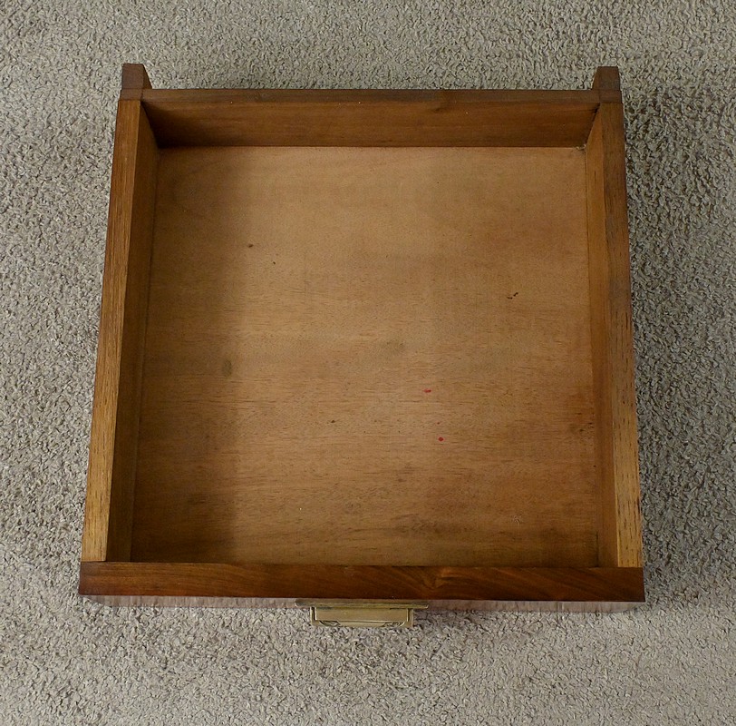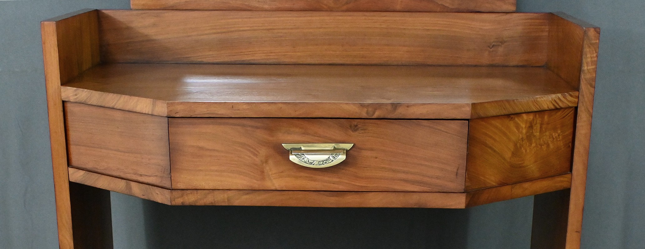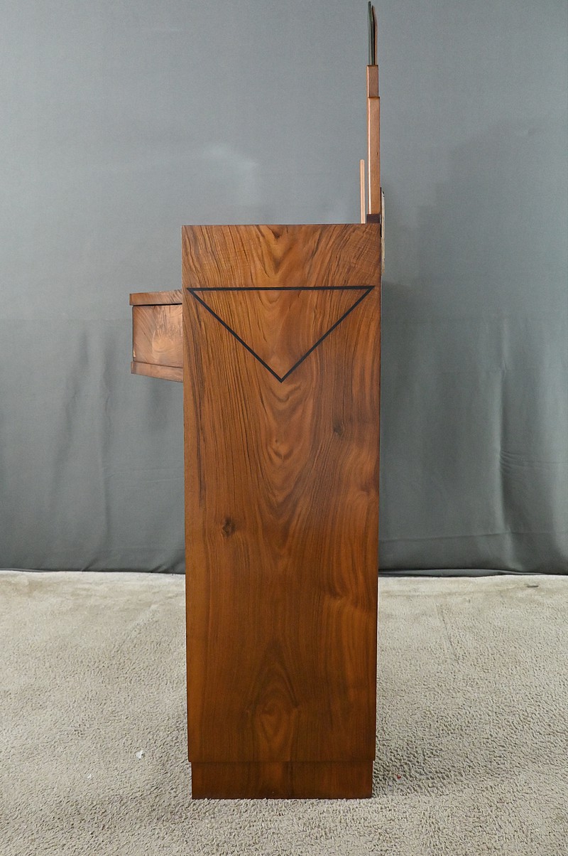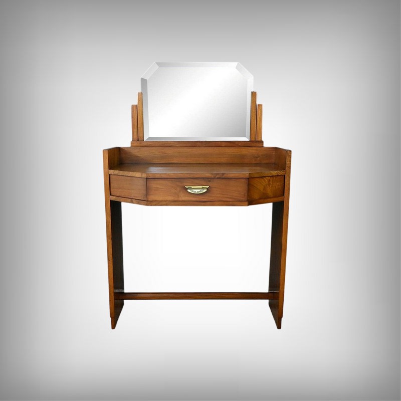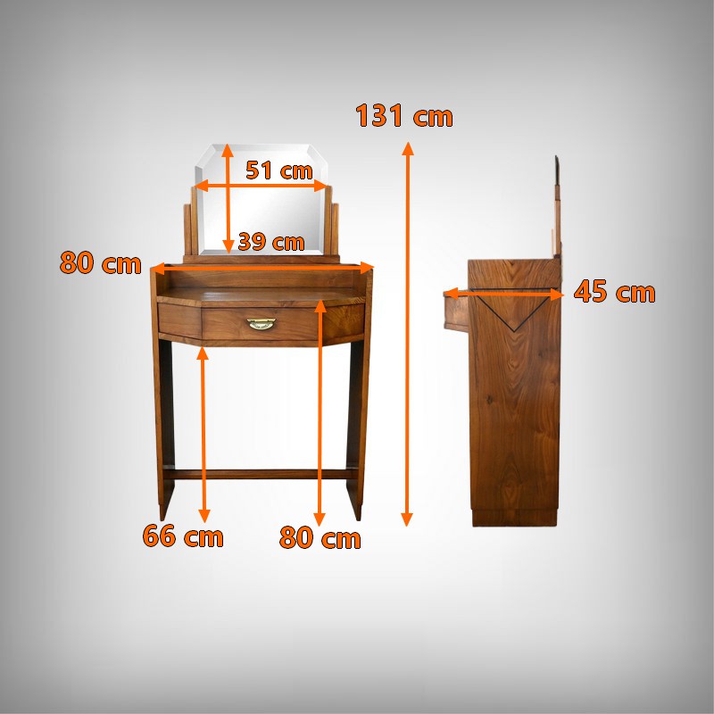 Cette élégante coiffeuse en noyer, datant des années 1940, incarne parfaitement l’esthétique géométrique et raffinée du style Art Déco. Son grand miroir hexagonal biseauté attire immédiatement le regard par ses facettes anguleuses qui reflètent la lumière avec subtilité, tout en soulignant le caractère architectural de la pièce. Le plateau, également de forme hexagonale, s’inscrit dans cette même logique de rigueur géométrique, typique de l’époque. Au centre, un tiroir unique s’ouvre grâce à une poignée de tirage finement ouvragée, ornée de fleurs stylisées dans le pur esprit décoratif Art Déco. Sur les côtés de ce meuble, deux grands triangles apportent une touche graphique audacieuse, renforçant la silhouette sculpturale de la coiffeuse. Ces côtés sont reliés par une entretoise facetée qui ajoute à la fois stabilité et élégance. Cette pièce rare séduit par son équilibre entre fonctionnalité et sophistication. Un meuble idéal pour les amateurs de mobilier vintage ou les passionnés de design Art Déco.