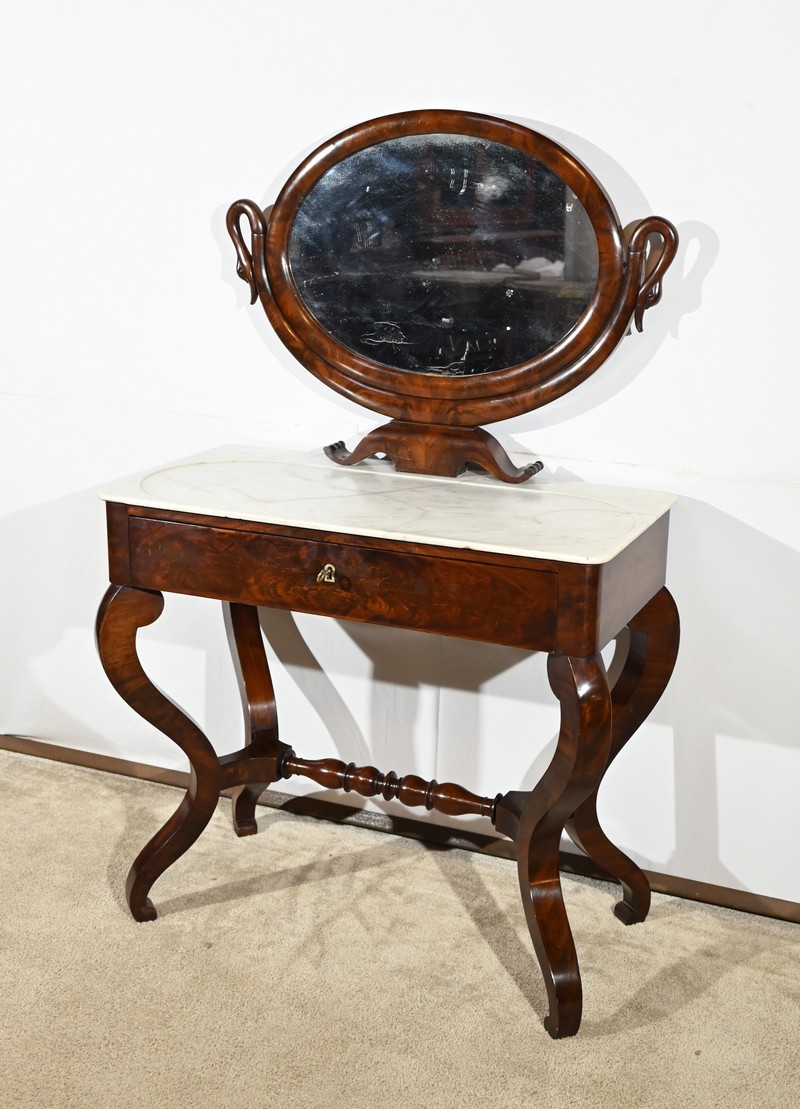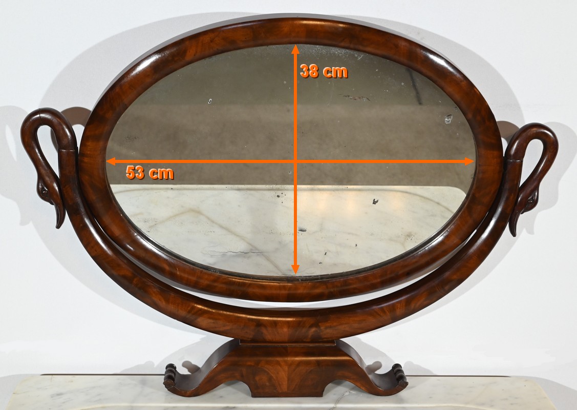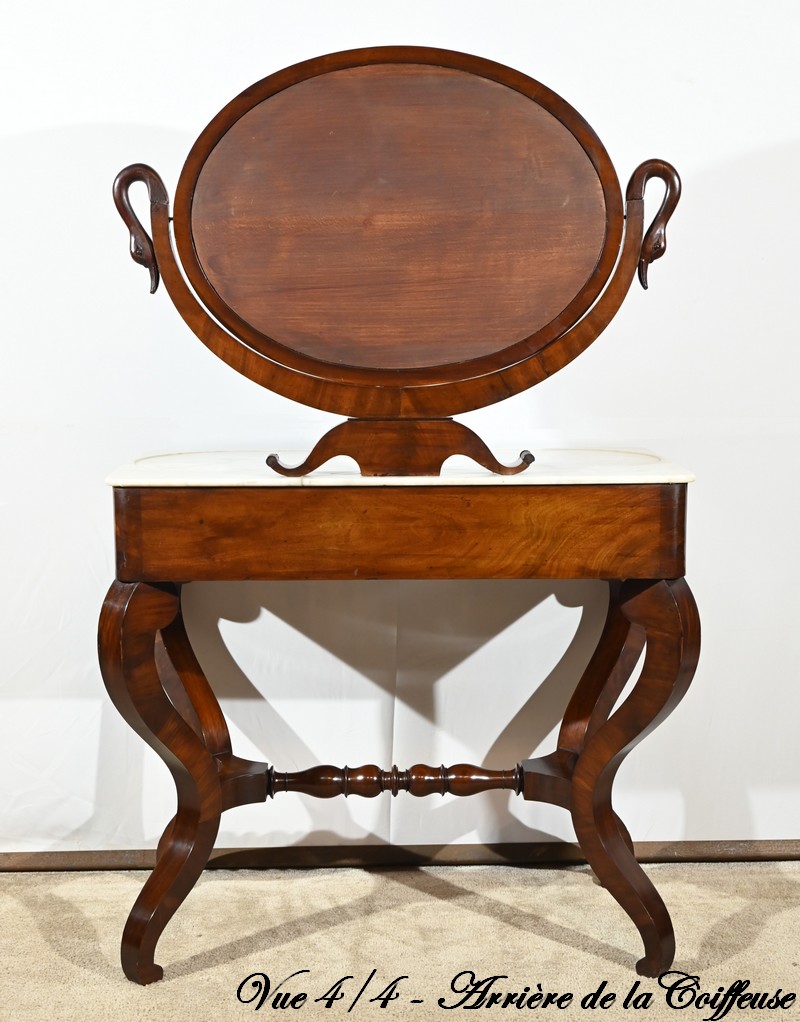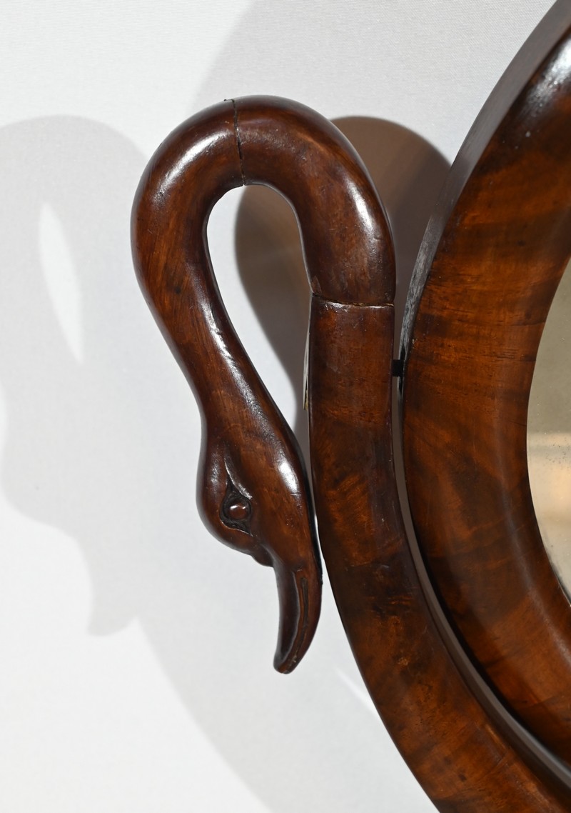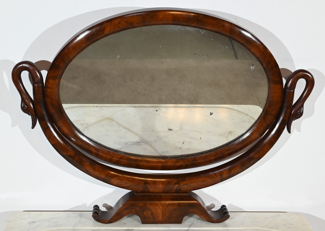 Cette coiffeuse propose également un miroir monté sur un axe horizontal, foncé d’une glace au mercure, reposant sur un socle mouluré avec col de cygne.