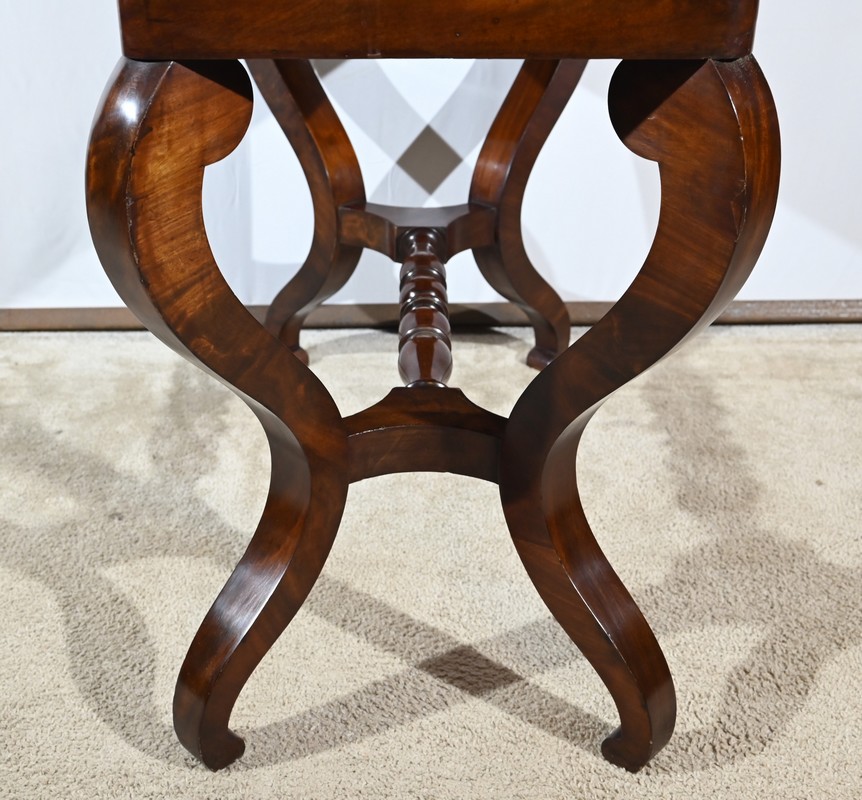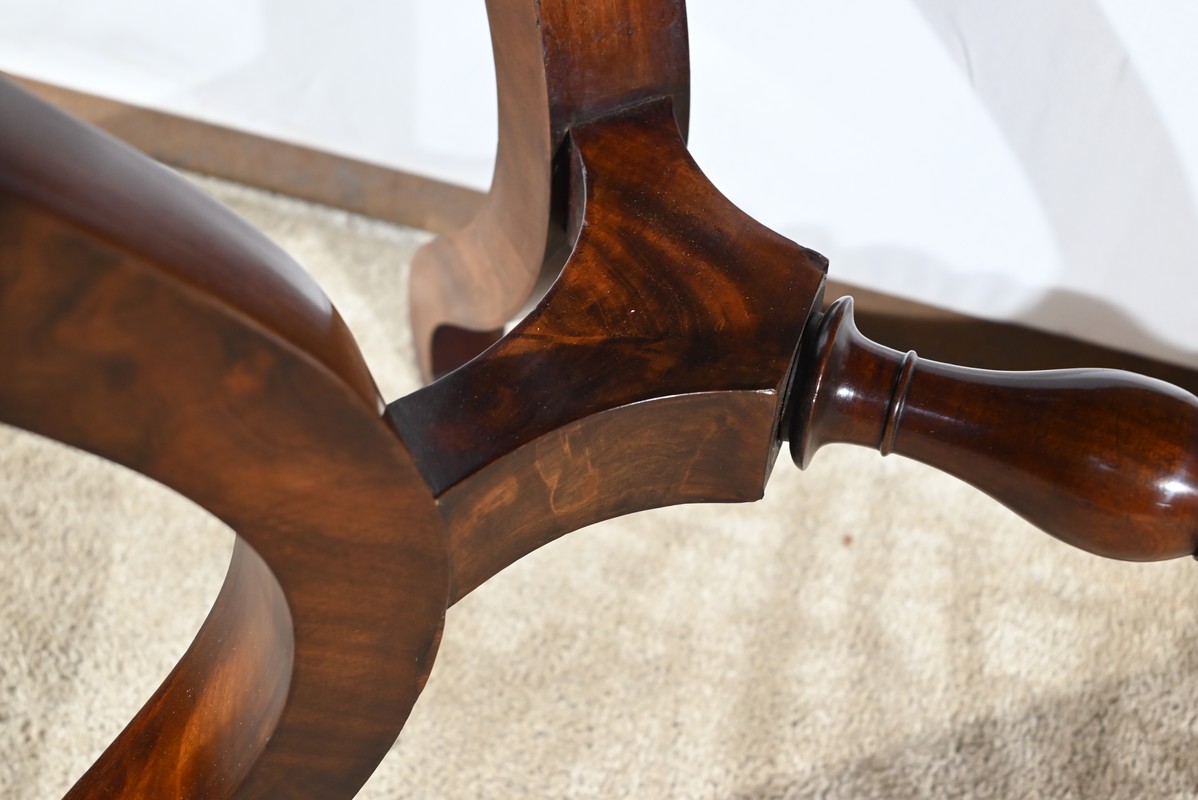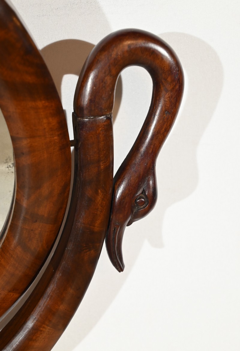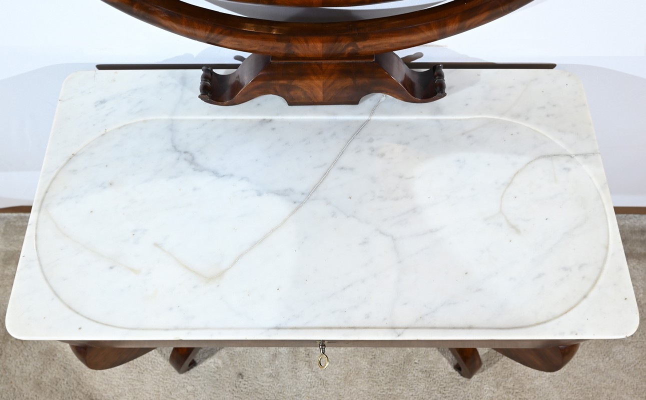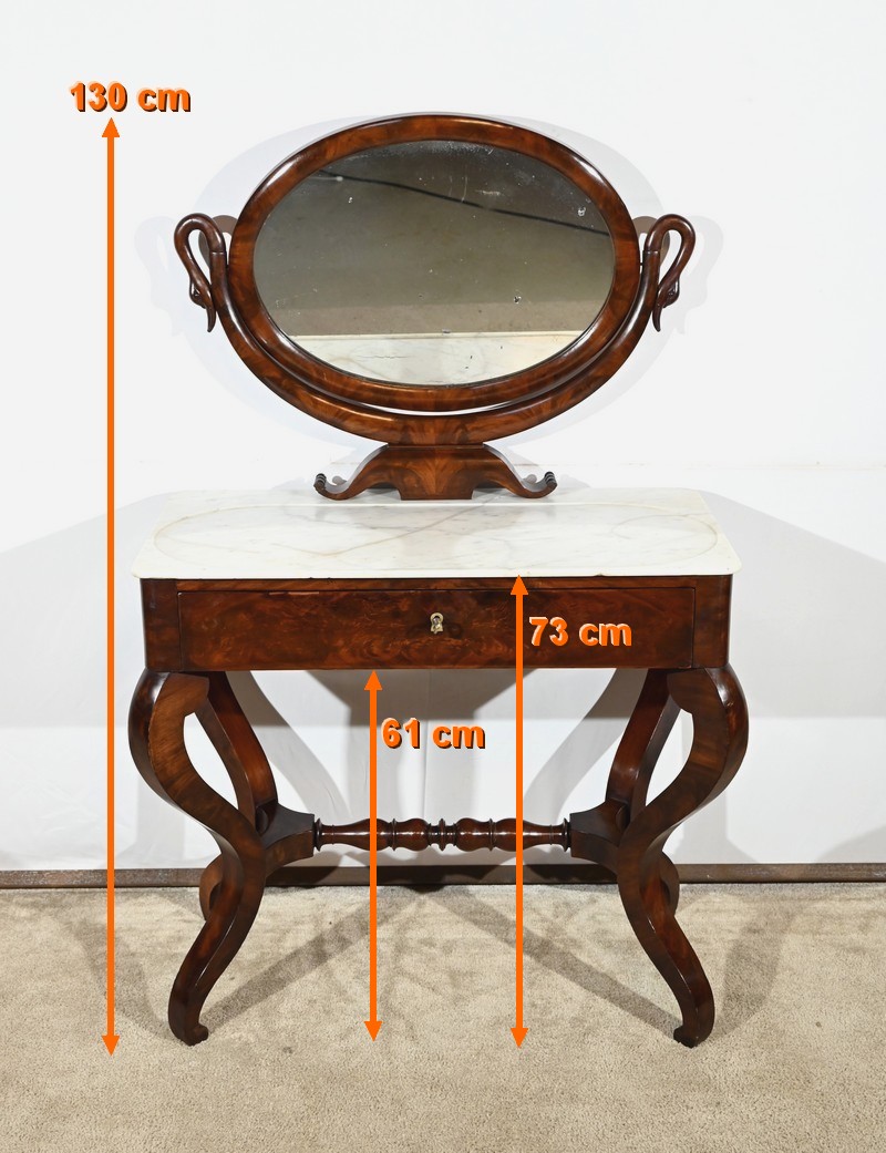Cette coiffeuse propose également un miroir monté sur un axe horizontal, foncé d’une glace au mercure, reposant sur un socle mouluré avec col de cygne.