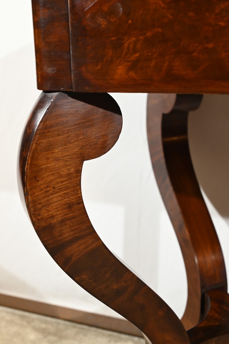Cette coiffeuse en placage de Ronce d’acajou ouvre en ceinture par un tiroir compartimenté muni d’une serrure fonctionnelle avec clé et entrée incrustée authentiques.