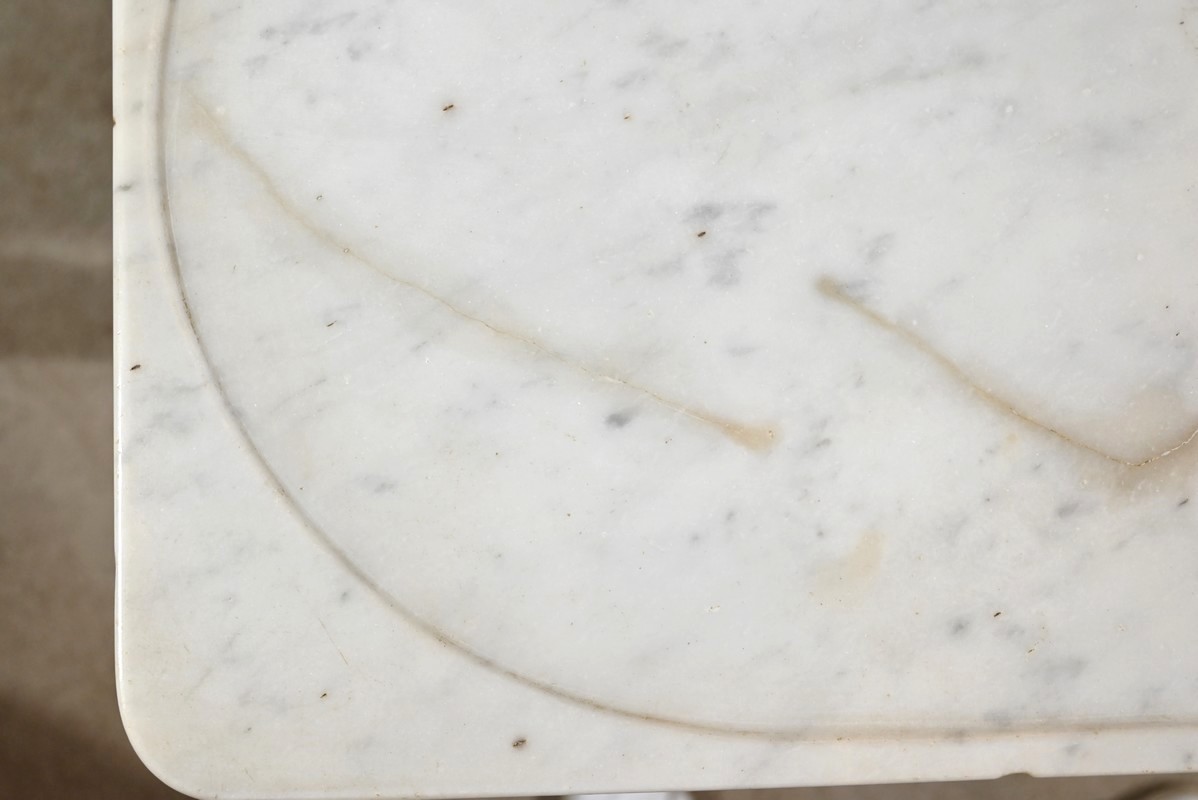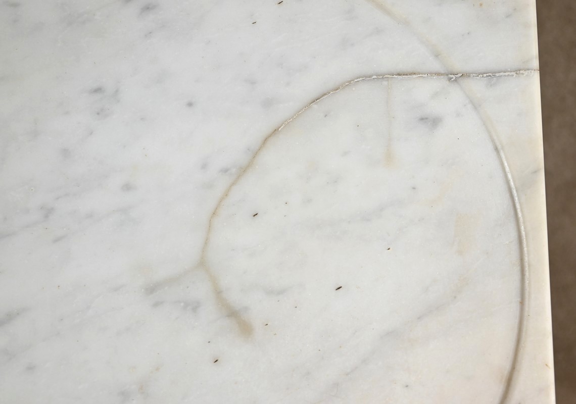 Le dessus est habillé d’un marbre de carrare d’origine à réserve avec restaurations postérieures.