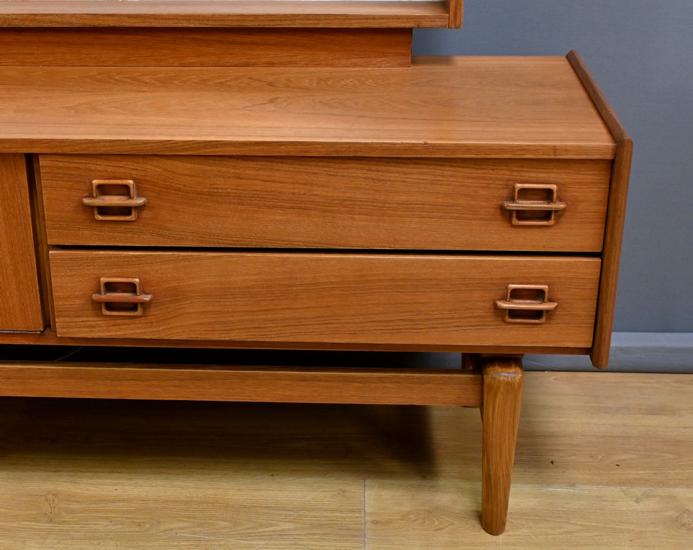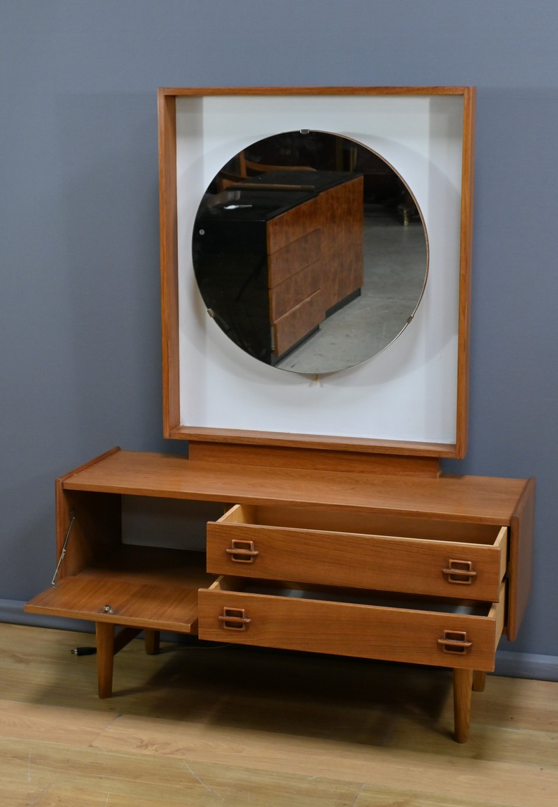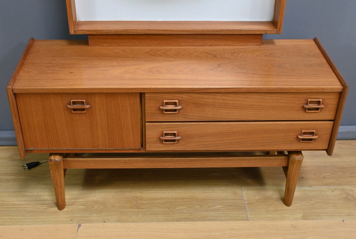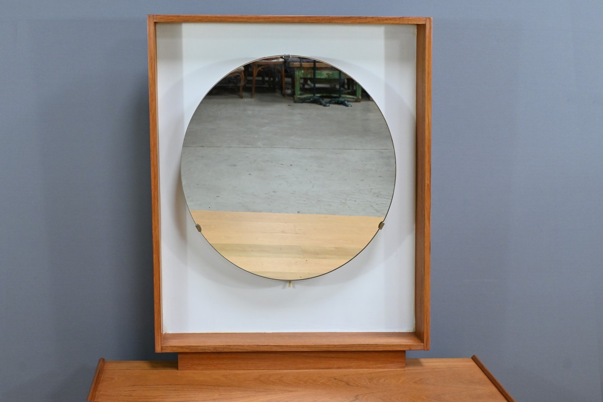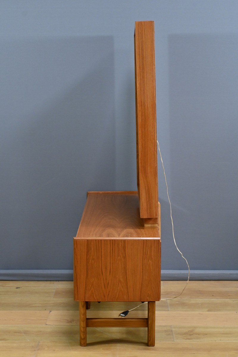Témoin du raffinement et du design fonctionnel du mobilier nordique, cette coiffeuse scandinave en teck des années 1960 incarne à la fois modernité et praticité.