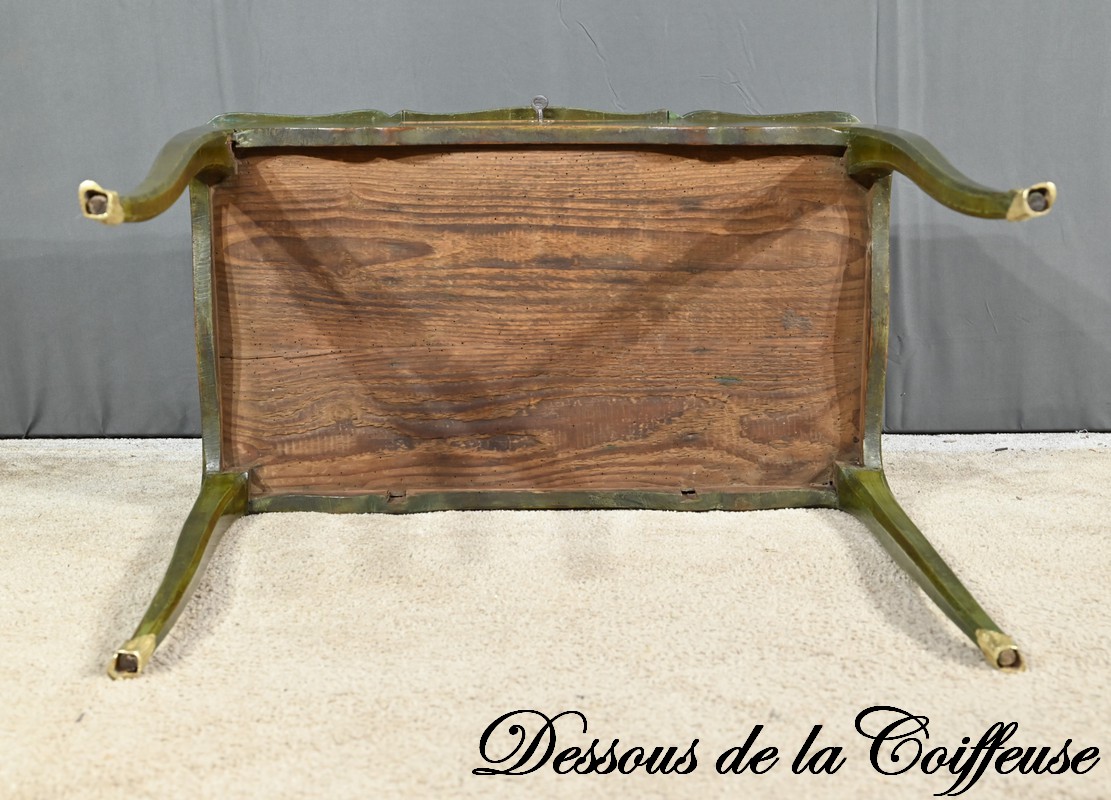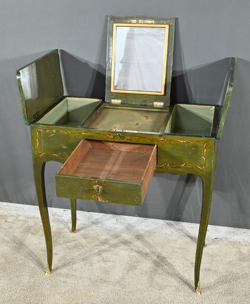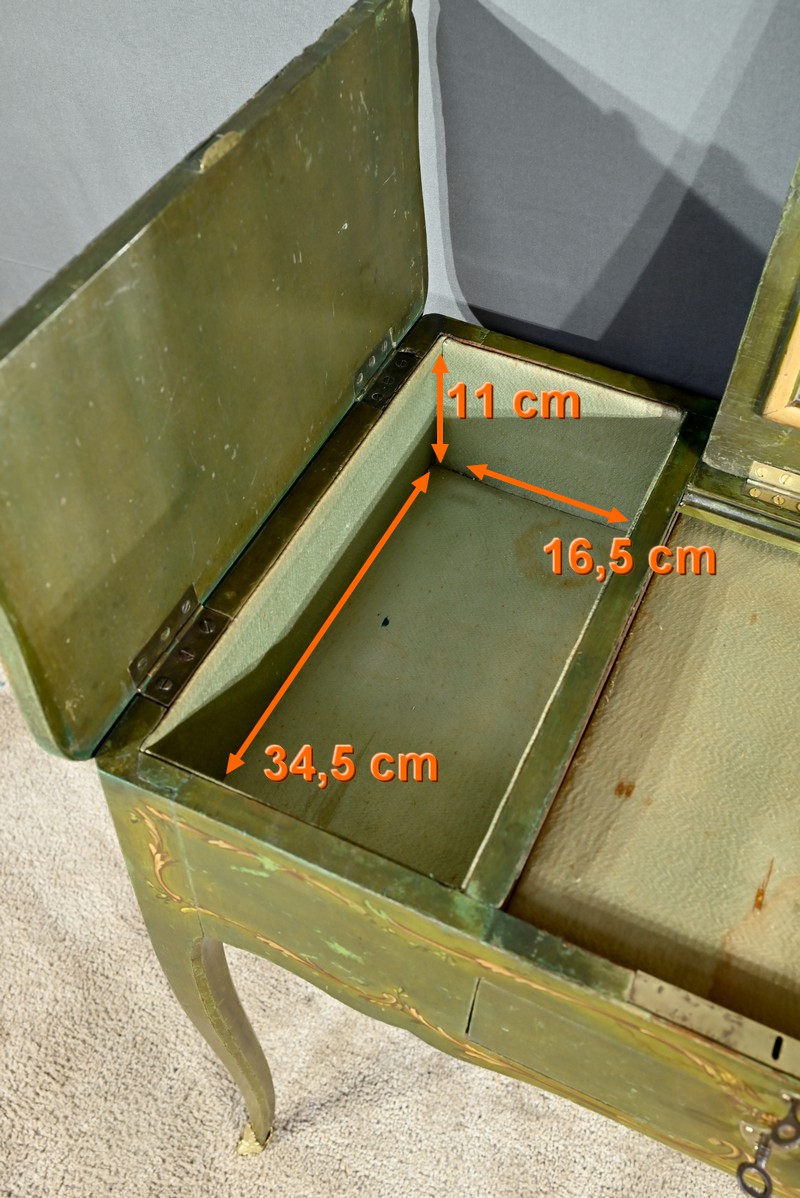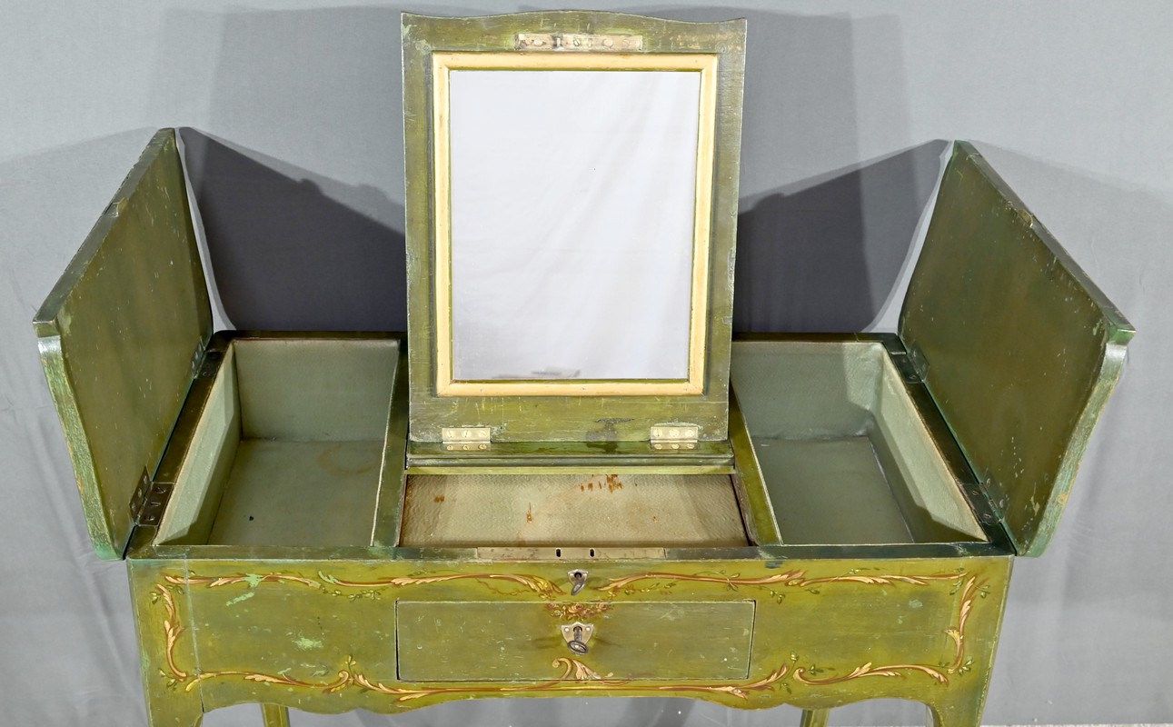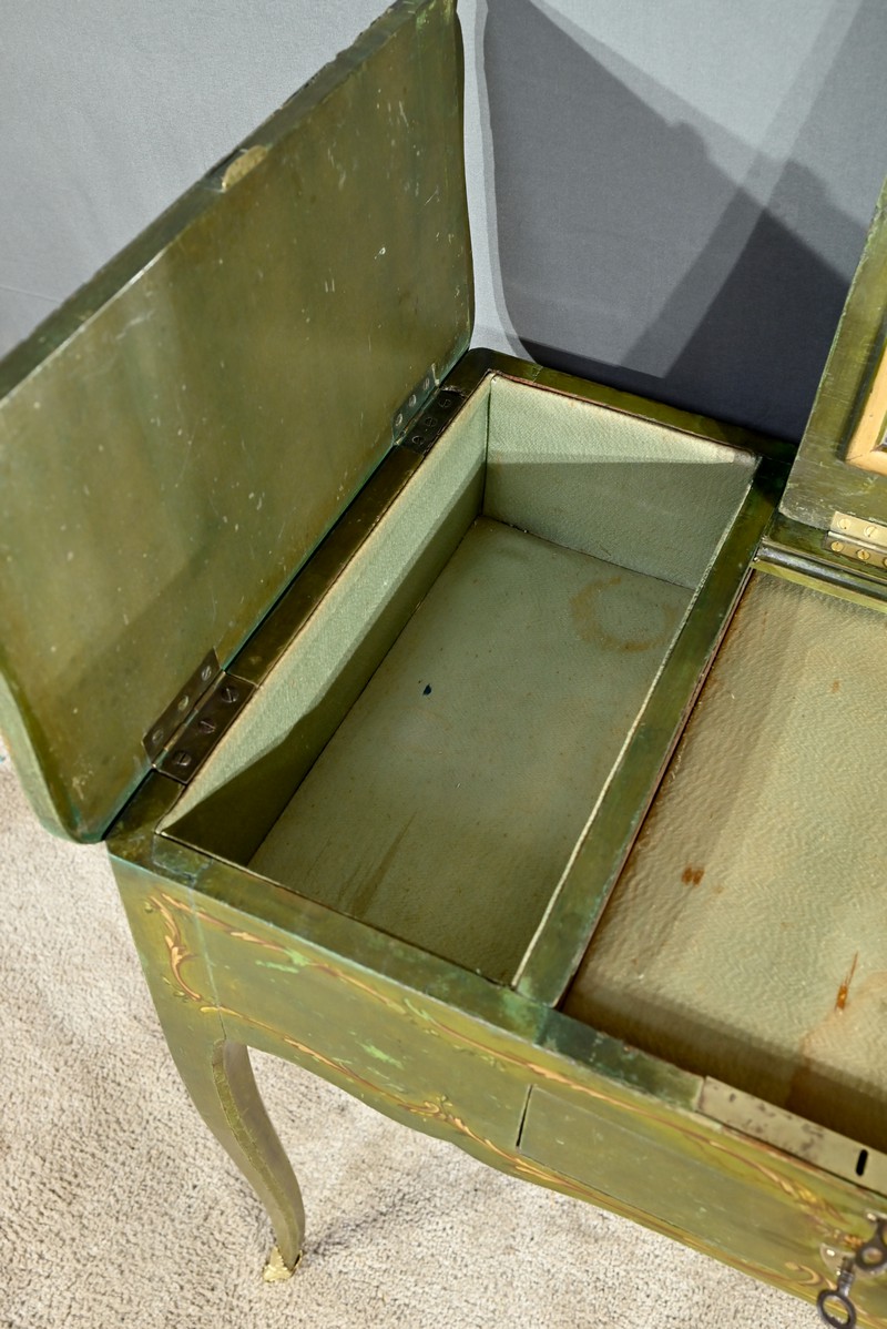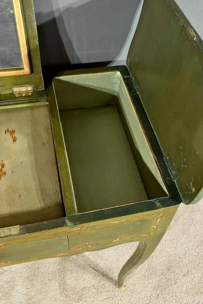 Cette petite coiffeuse en chêne peint couleur vert fougère ouvre en ceinture par un tiroir avec serrure d’origine avec entrée blason et clé.