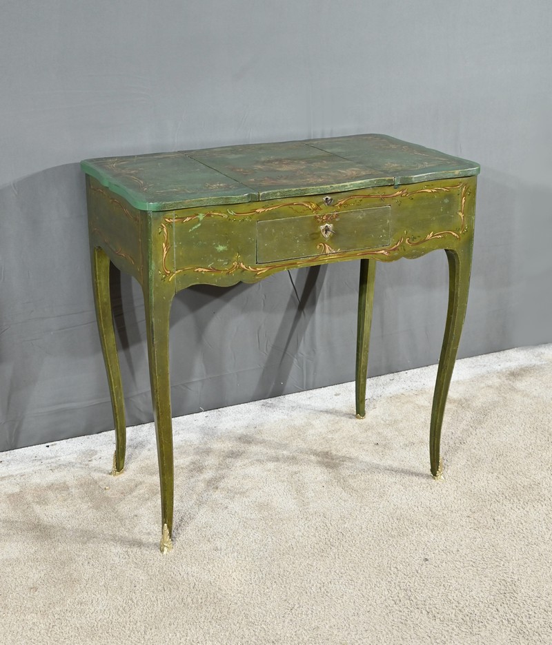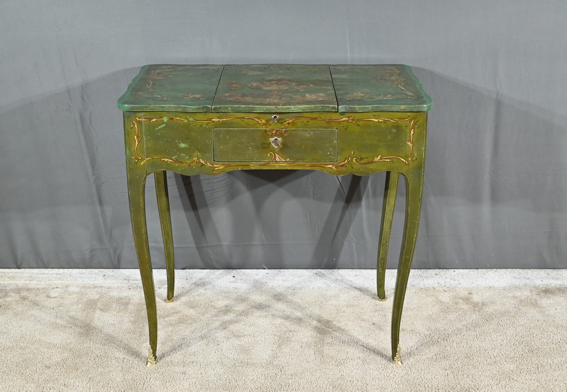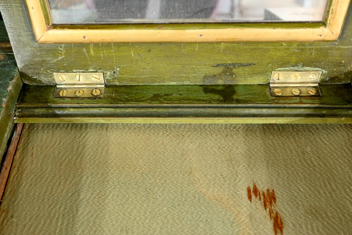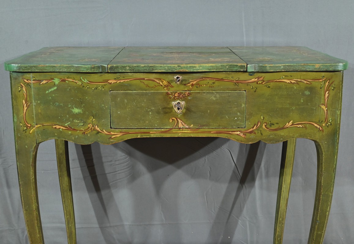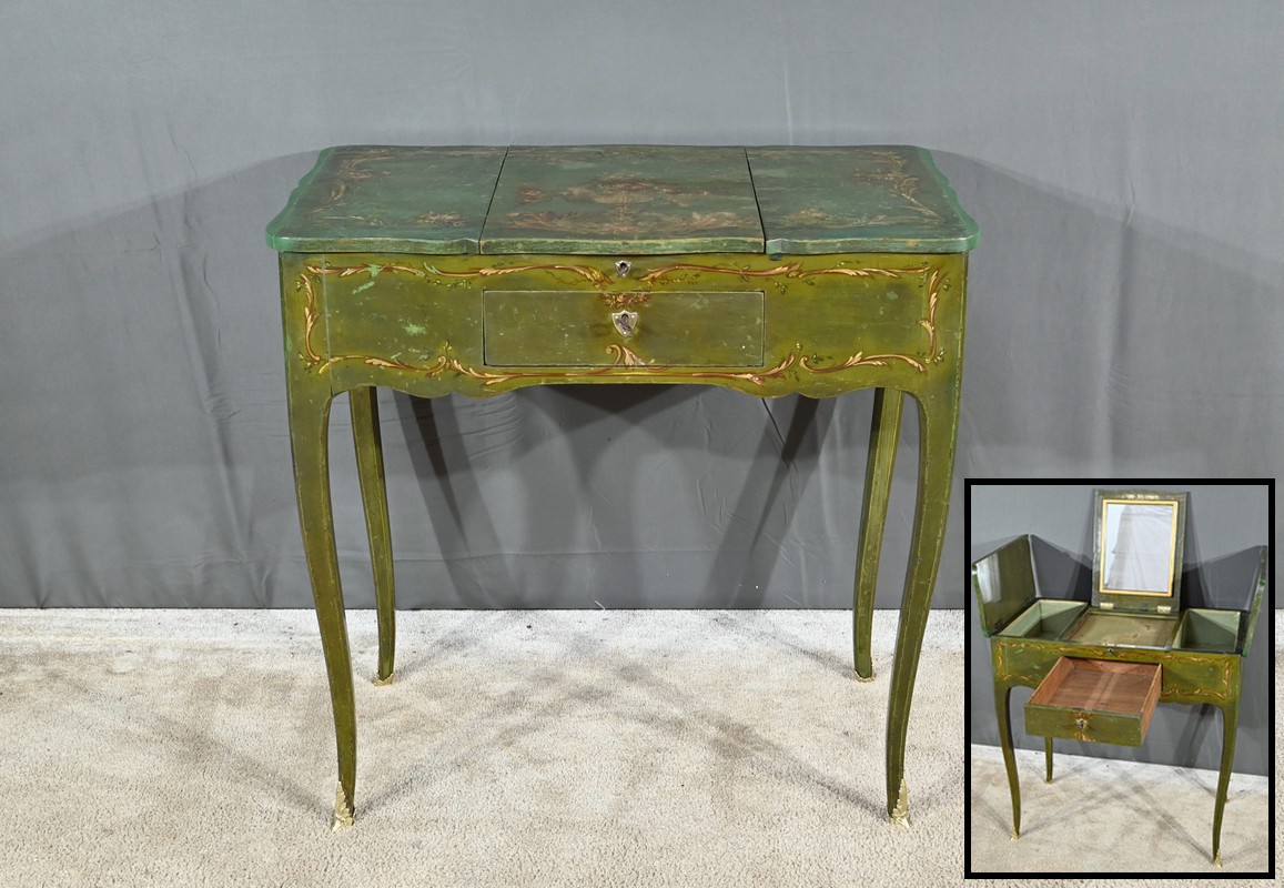 Cette petite coiffeuse en chêne peint couleur vert fougère ouvre en ceinture par un tiroir avec serrure d’origine avec entrée blason et clé.