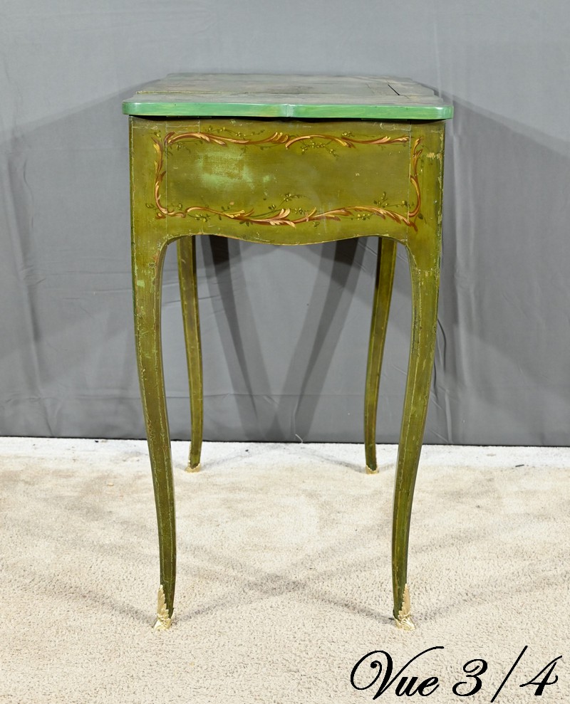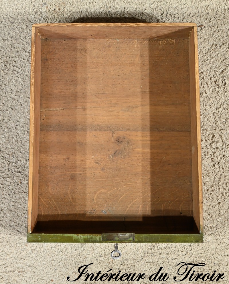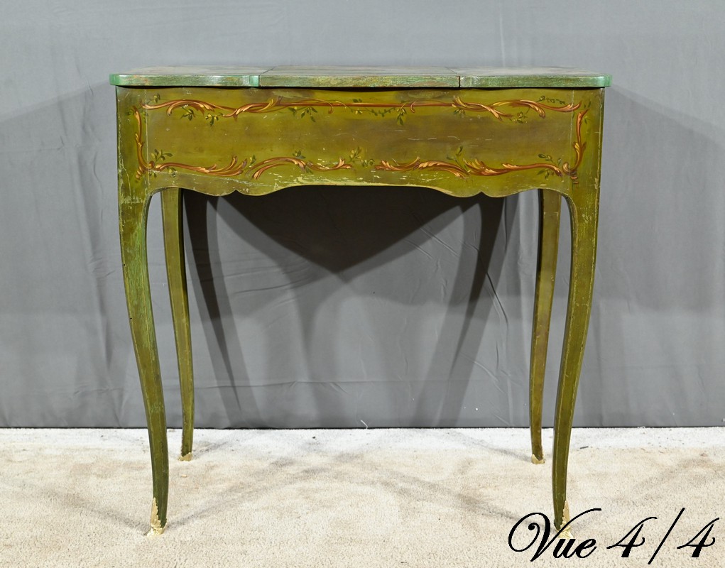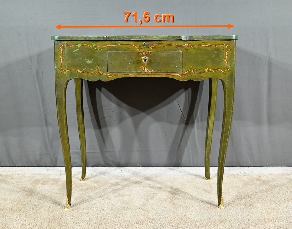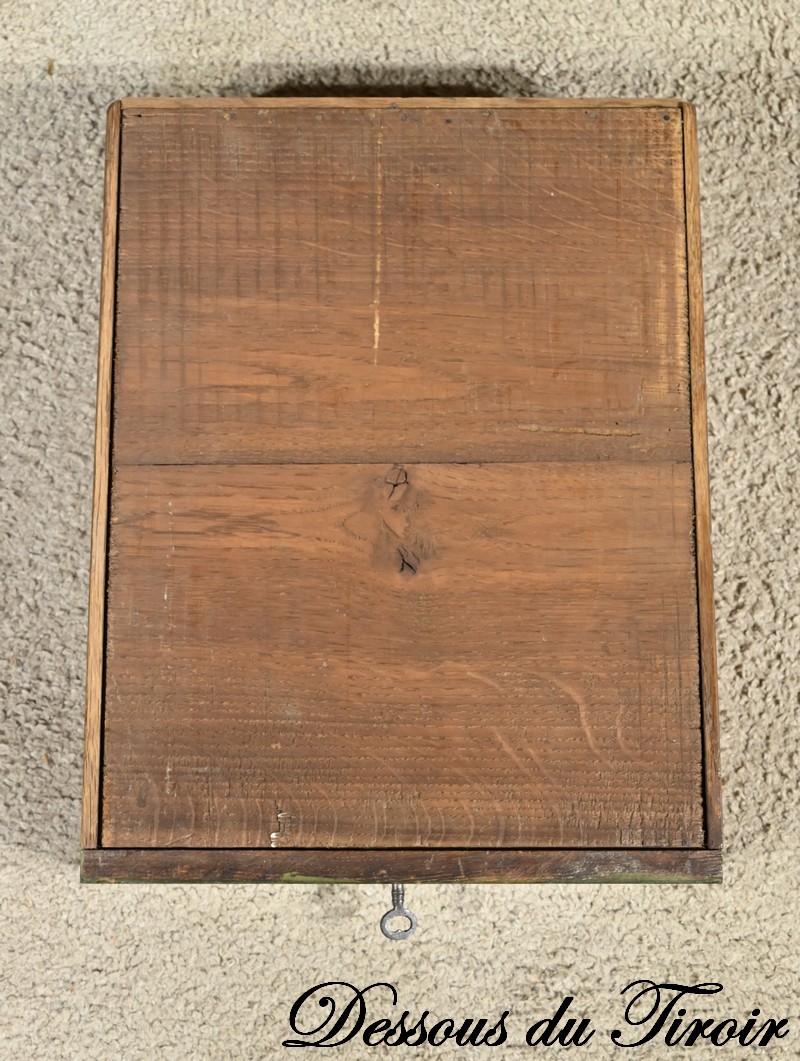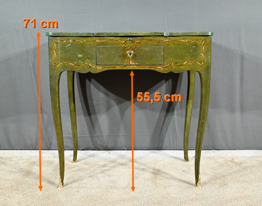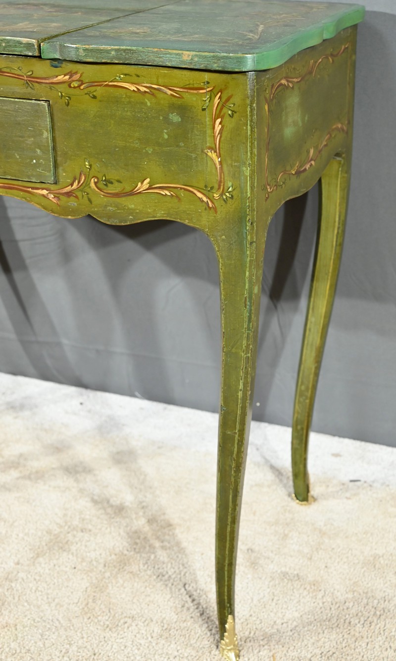 Cette petite coiffeuse en chêne peint couleur vert fougère ouvre en ceinture par un tiroir avec serrure d’origine avec entrée blason et clé.
