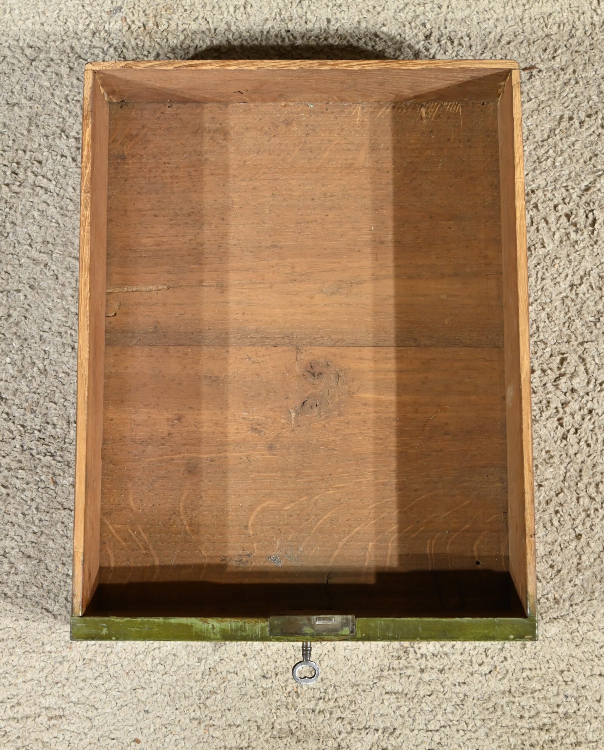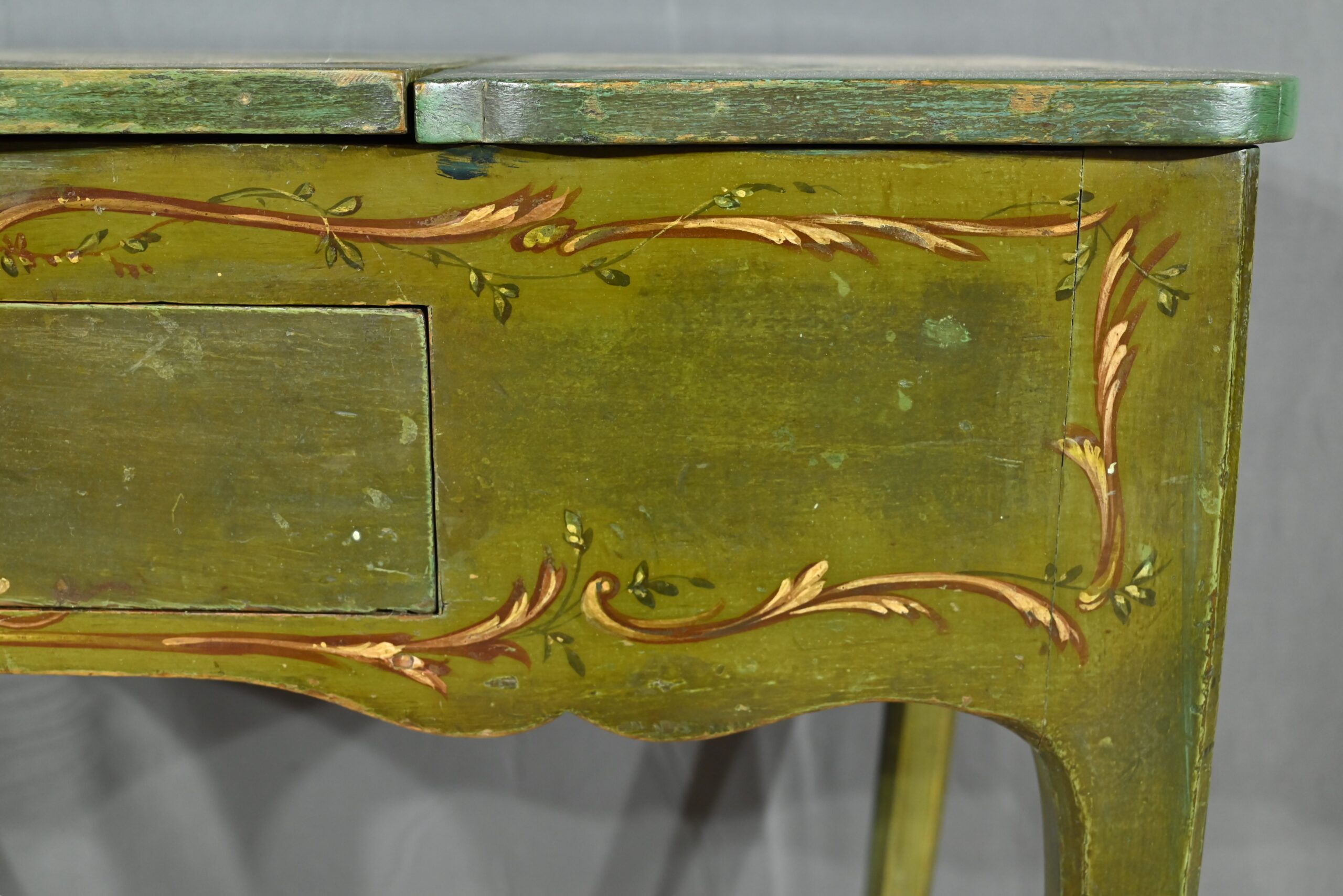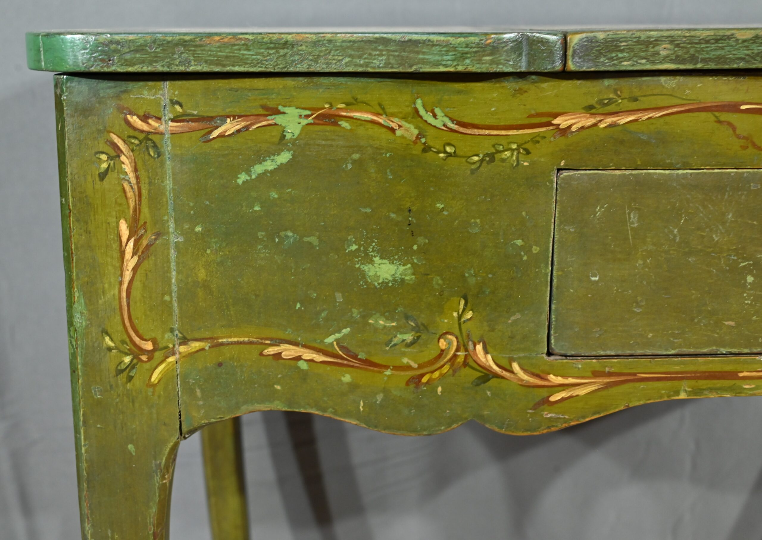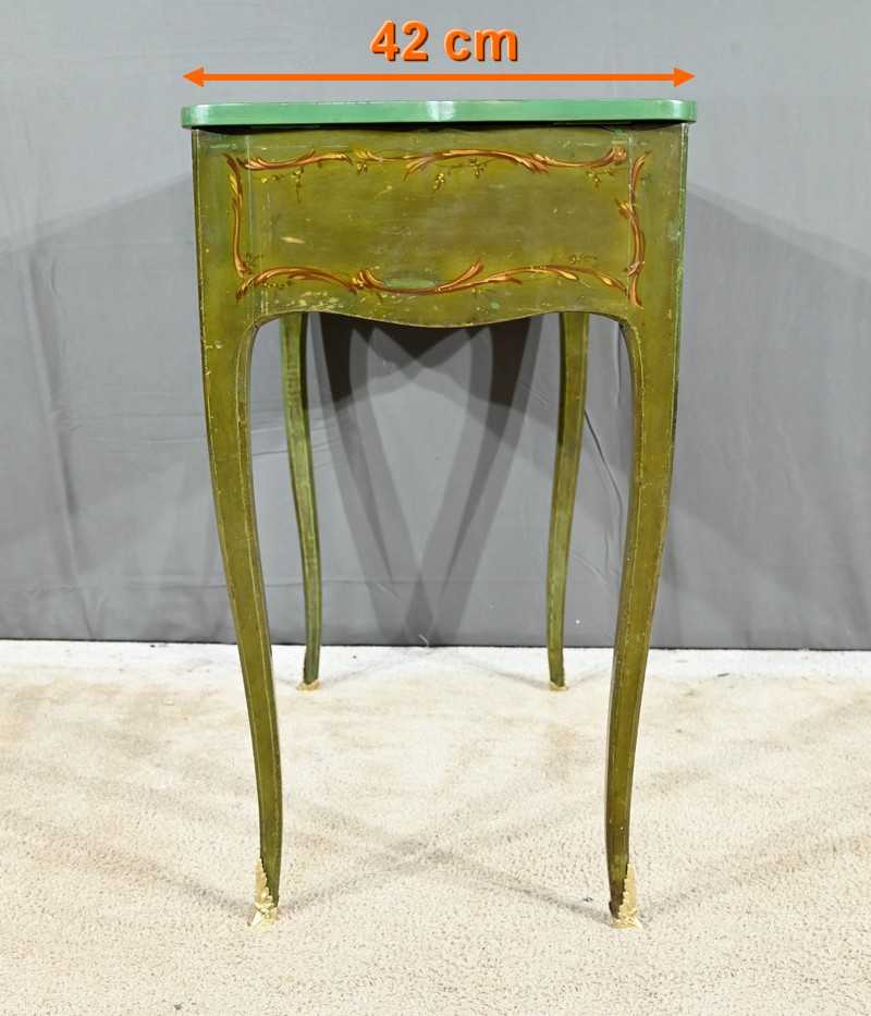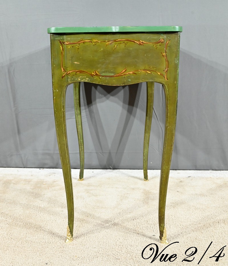 Cette petite coiffeuse en chêne peint couleur vert fougère ouvre en ceinture par un tiroir avec serrure d’origine avec entrée blason et clé.