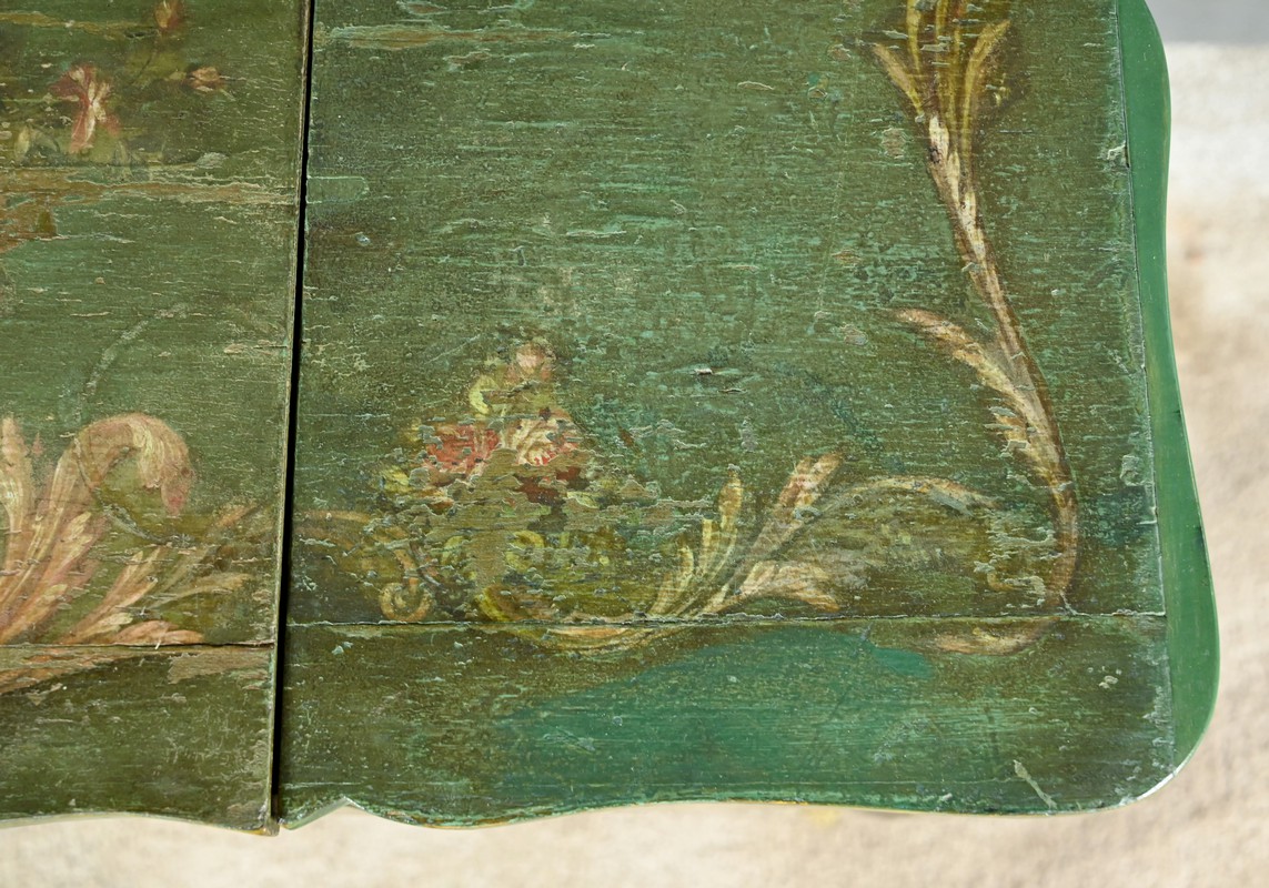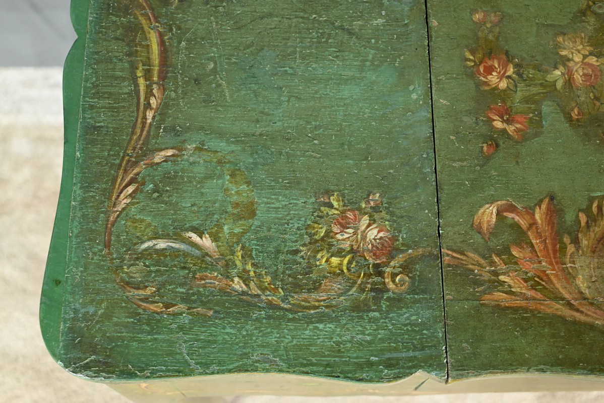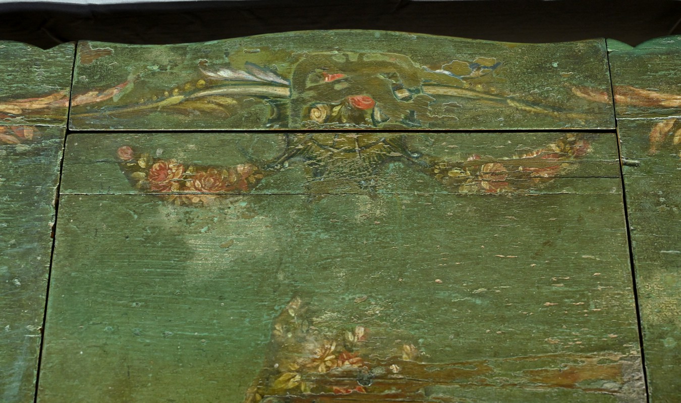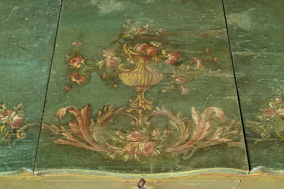 Cette ceinture, chantournée, est agrémentée sur ses quatre faces de rinceaux peints.