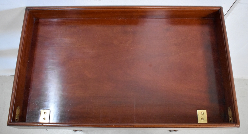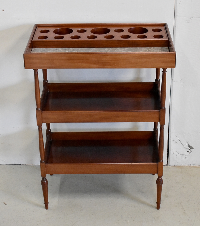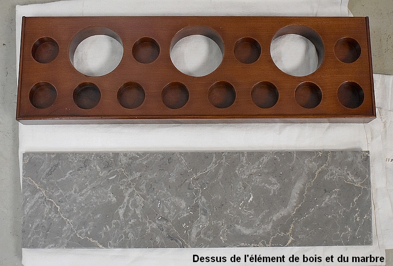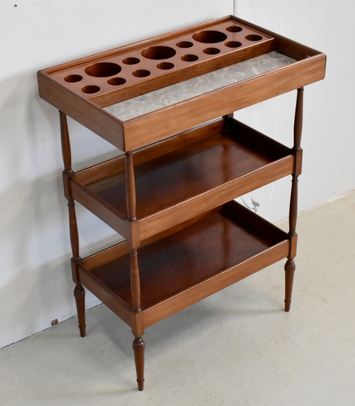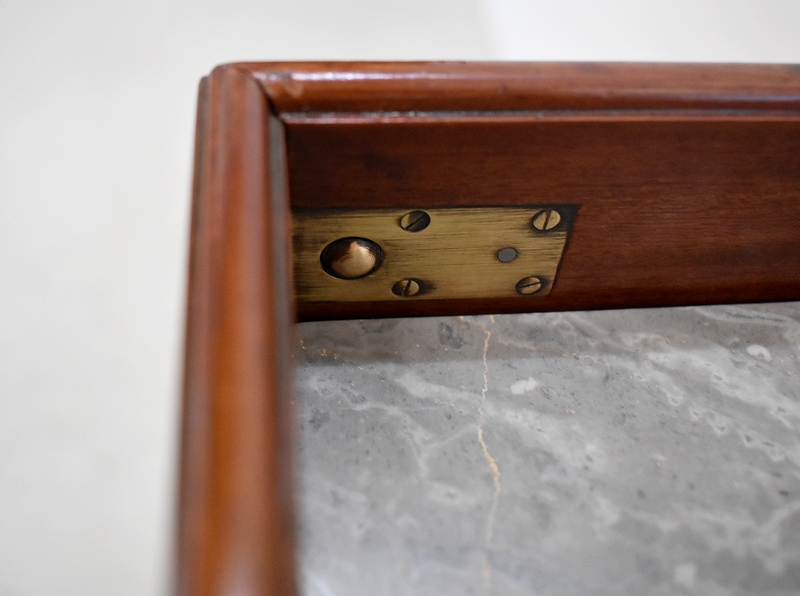 Ce Petit Meuble ouvre sur le devant par un Discret abattant, avec charnières Laiton et fermoirs sur les côtés. Il protège un Marbre de couleur Grège très Doux. En partie arrière, on trouve un élément Amovible en Acajou massif, présentant des cavités de différents diamètres et profondeurs, permettant initialement d’y ranger les produits de beauté.